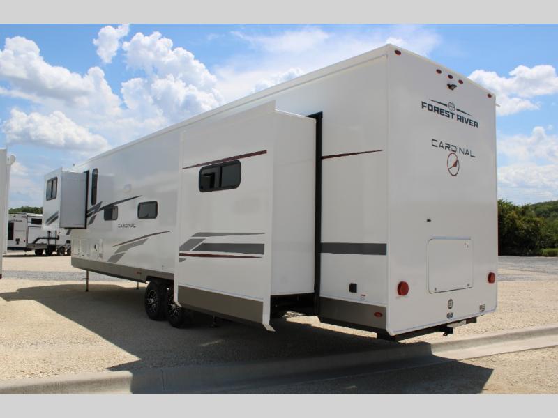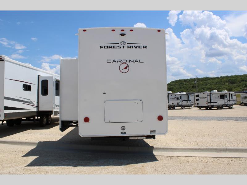 With any Cardinal fifth wheel by Forest River you will enjoy affordable luxury at every turn. These models are constructed with residential fiberglass insulation in the roof and floor, a sectioned ABS plastic underbelly armor, and a vacuum bonded, welded aluminum structure for added strength and durability. You will also find seamless roto-cast holding tanks, an outdoor shower, and 4-point auto leveling for quick and easy setup. There are carpet-free living spaces, residential backsplash, motion lighting throughout, and many more comforts!