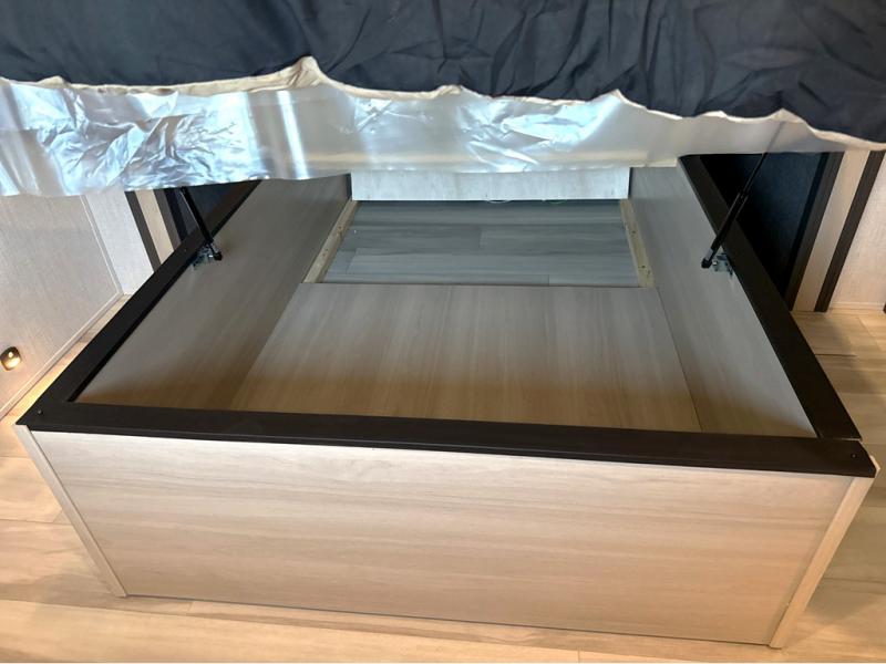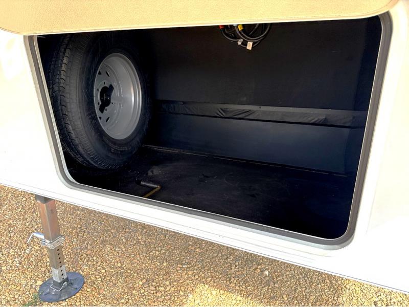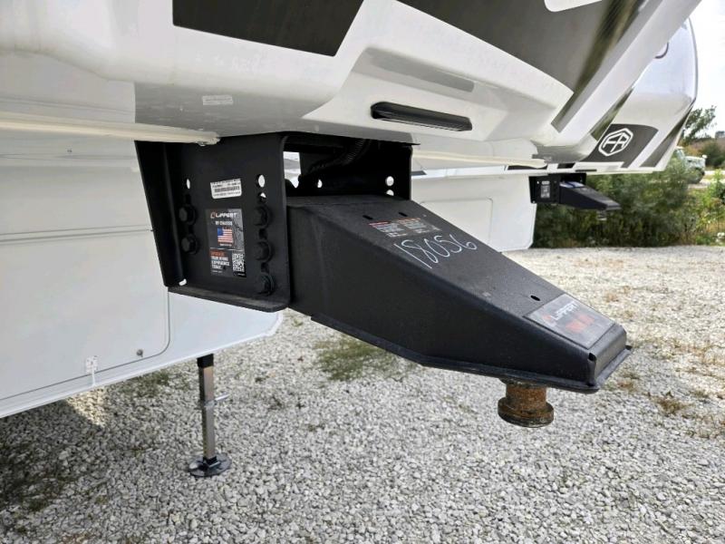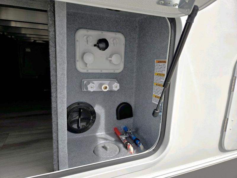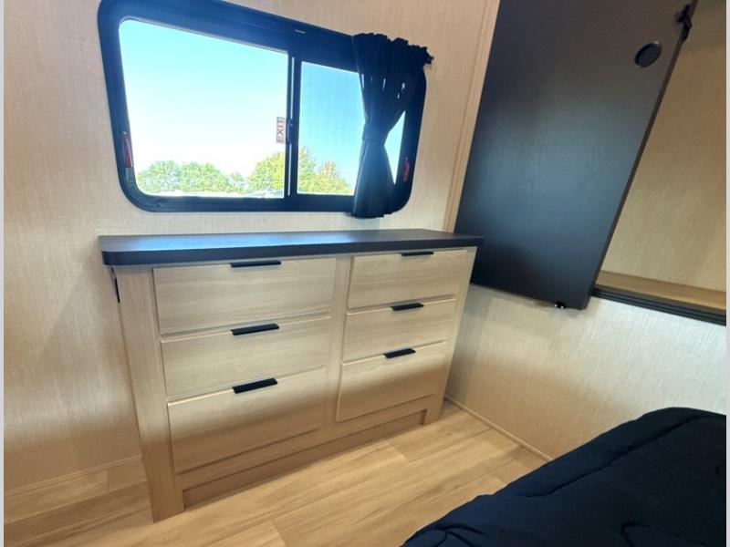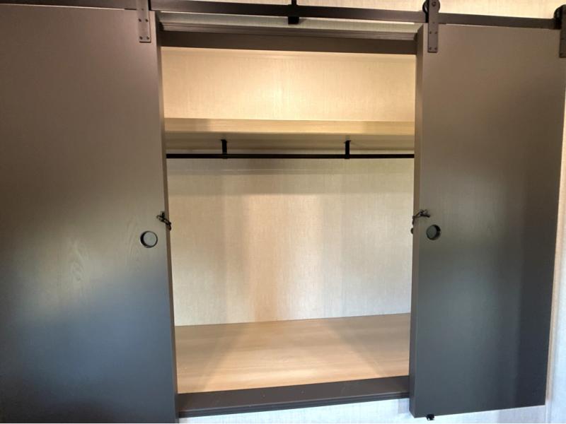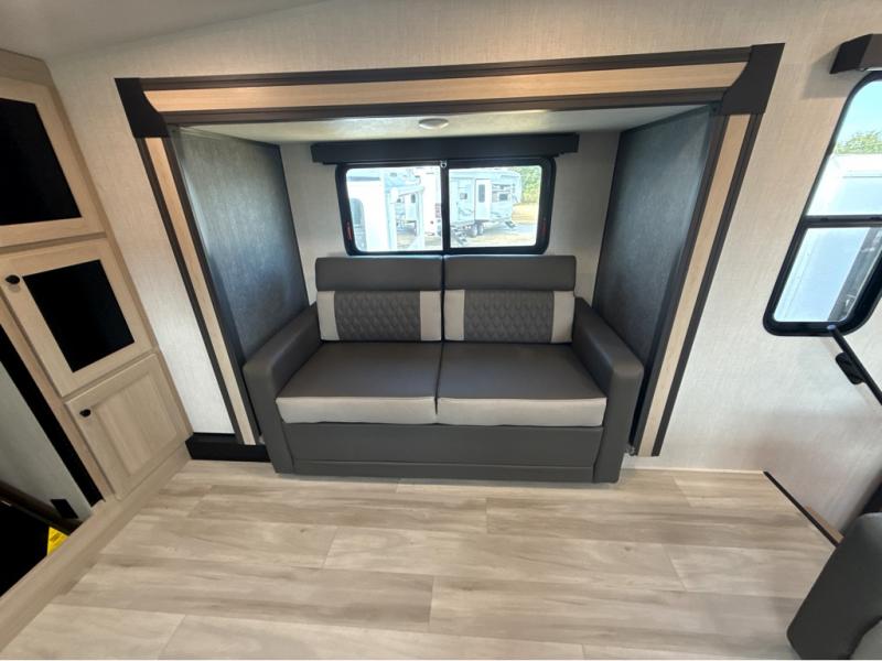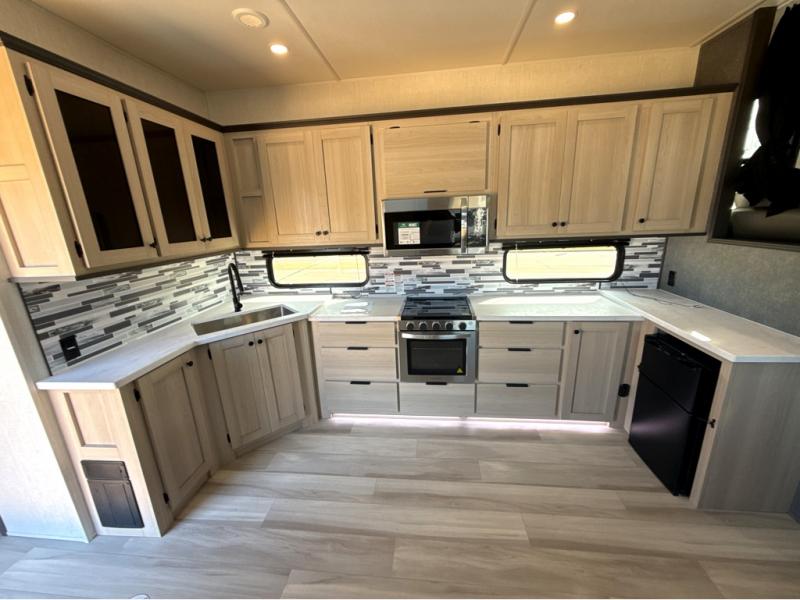 This fifth wheel is packed with features to make each trip enjoyable! The middle kitchen might be your favorite room with wrap-around counter space, a pantry, and a 16 cu. ft. 12V refrigerator for food storage. You can dine at the hi-top table and chairs here, or sit in the front living area on the dual sofas and theater seating! This area can become your guests bedroom at night since there are dual opposing slides and wardrobe storage for their things. You will also find a full-length wardrobe in the rear private bedroom, along with a king bed slide out, plus washer and dryer prep! And of course there is a full bath so everyone can stay clean each day!