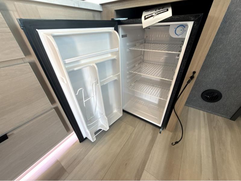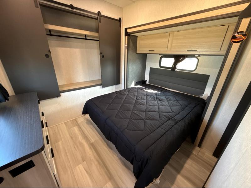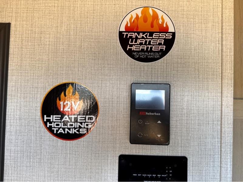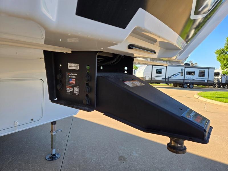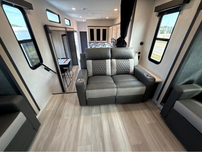 This fifth wheel is packed with features to make each trip enjoyable! The middle kitchen might be your favorite room with wrap-around counter space, a pantry, and a 16 cu. ft. 12V refrigerator for food storage. You can dine at the hi-top table and chairs here, or sit in the front living area on the dual sofas and theater seating! This area can become your guests bedroom at night since there are dual opposing slides and wardrobe storage for their things. You will also find a full-length wardrobe in the rear private bedroom, along with a king bed slide out, plus washer and dryer prep! And of course there is a full bath so everyone can stay clean each day!
