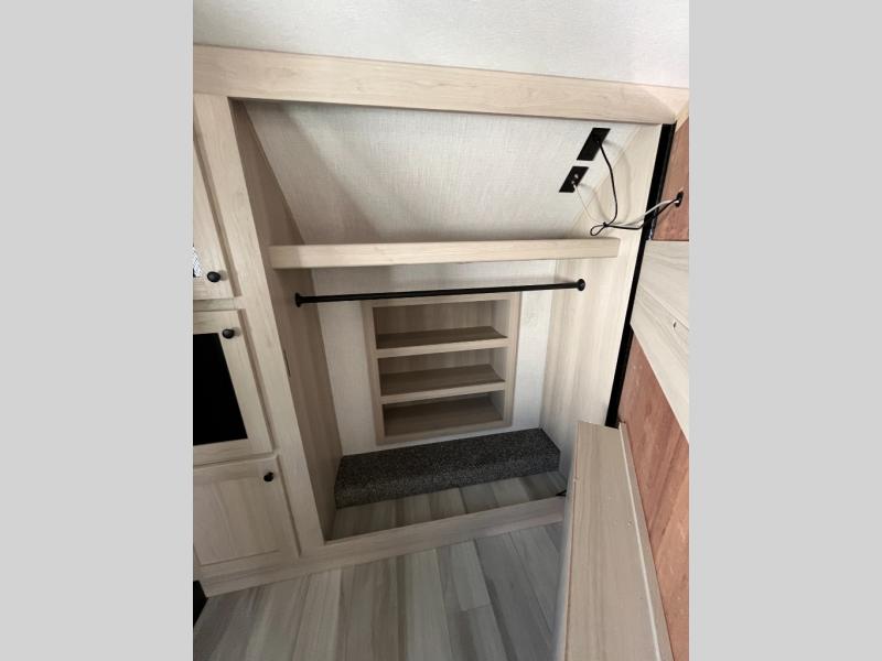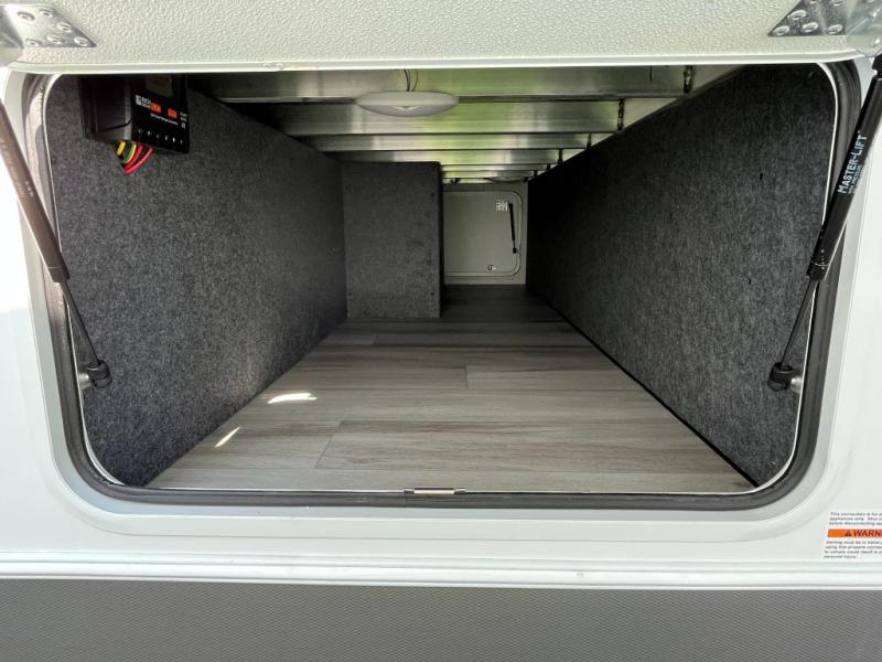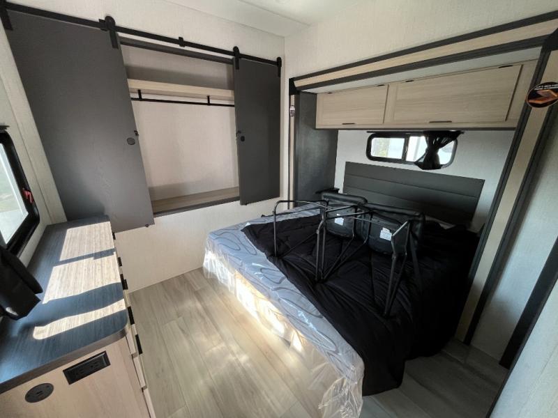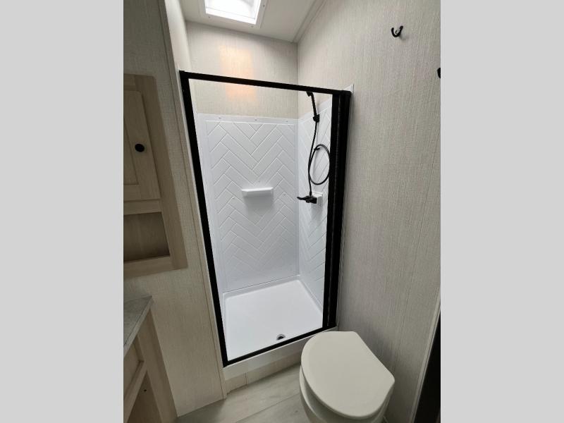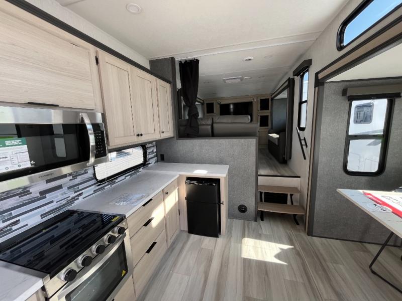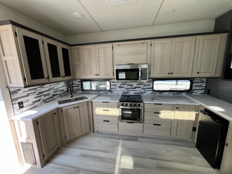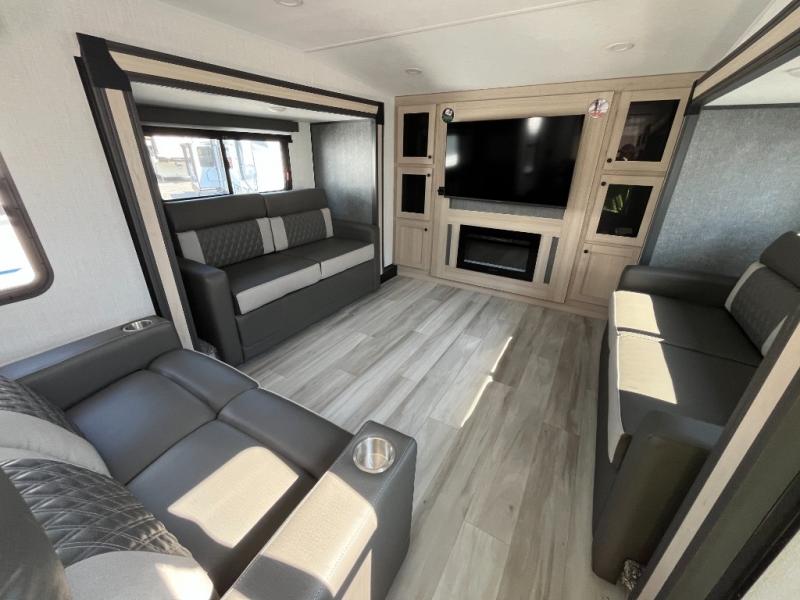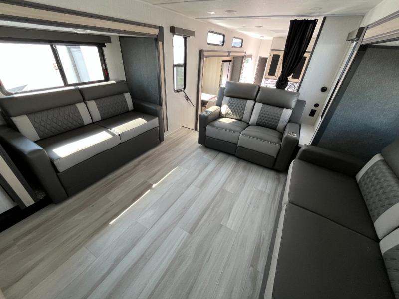 This fifth wheel is packed with features to make each trip enjoyable! The middle kitchen might be your favorite room with wrap-around counter space, a pantry, and a 16 cu. ft. 12V refrigerator for food storage. You can dine at the hi-top table and chairs here, or sit in the front living area on the dual sofas and theater seating! This area can become your guests bedroom at night since there are dual opposing slides and wardrobe storage for their things. You will also find a full-length wardrobe in the rear private bedroom, along with a king bed slide out, plus washer and dryer prep! And of course there is a full bath so everyone can stay clean each day!