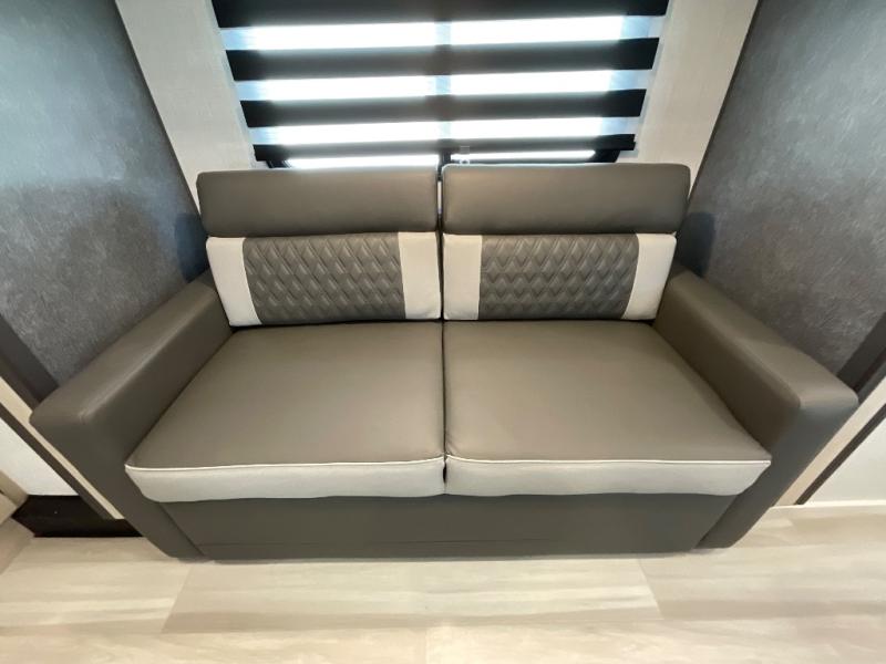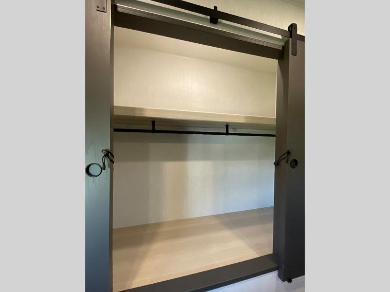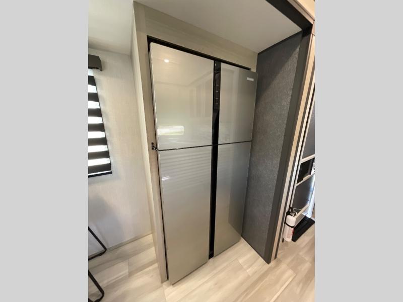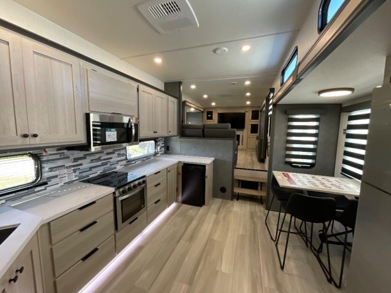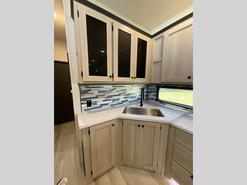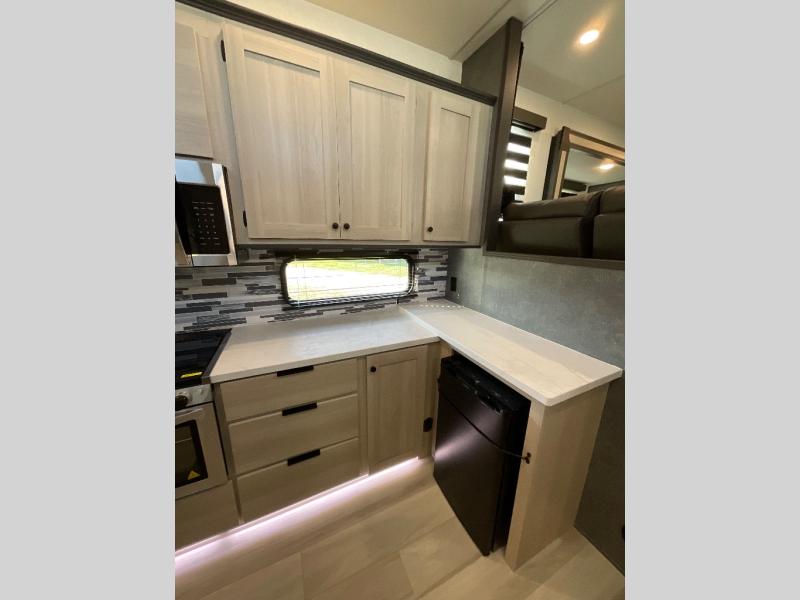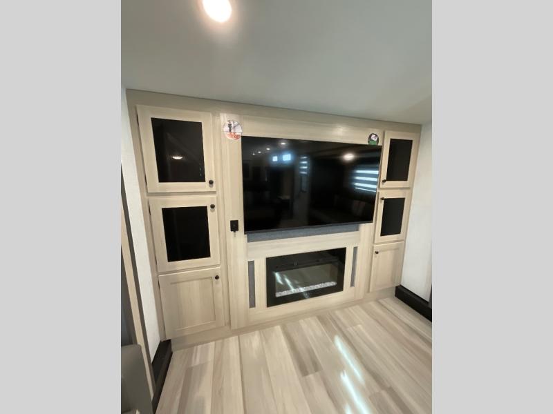 This fifth wheel is packed with features to make each trip enjoyable! The middle kitchen might be your favorite room with wrap-around counter space, a pantry, and a 16 cu. ft. 12V refrigerator for food storage. You can dine at the hi-top table and chairs here, or sit in the front living area on the dual sofas and theater seating! This area can become your guests bedroom at night since there are dual opposing slides and wardrobe storage for their things. You will also find a full-length wardrobe in the rear private bedroom, along with a king bed slide out, plus washer and dryer prep! And of course there is a full bath so everyone can stay clean each day!