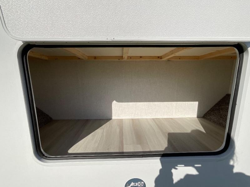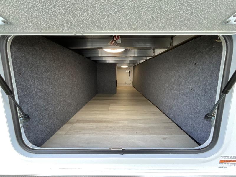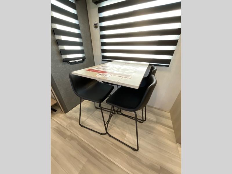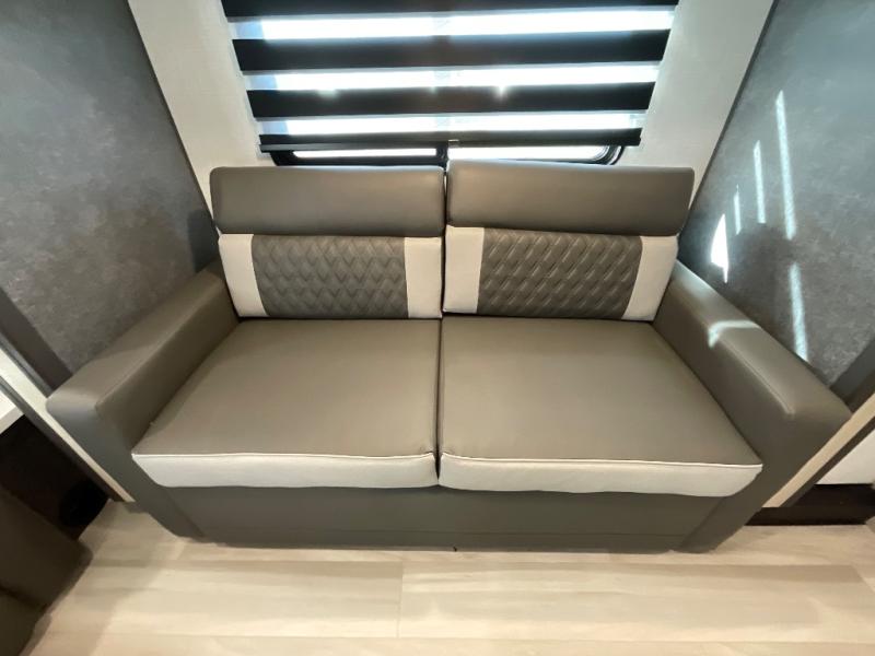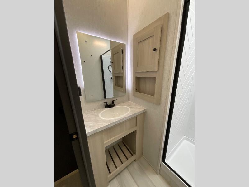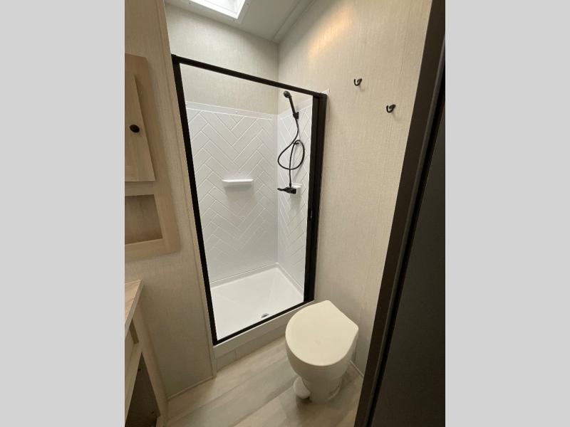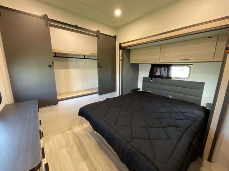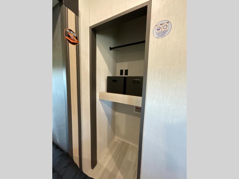 This fifth wheel is packed with features to make each trip enjoyable! The middle kitchen might be your favorite room with wrap-around counter space, a pantry, and a 16 cu. ft. 12V refrigerator for food storage. You can dine at the hi-top table and chairs here, or sit in the front living area on the dual sofas and theater seating! This area can become your guests bedroom at night since there are dual opposing slides and wardrobe storage for their things. You will also find a full-length wardrobe in the rear private bedroom, along with a king bed slide out, plus washer and dryer prep! And of course there is a full bath so everyone can stay clean each day!
