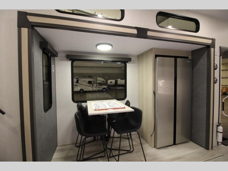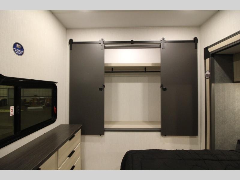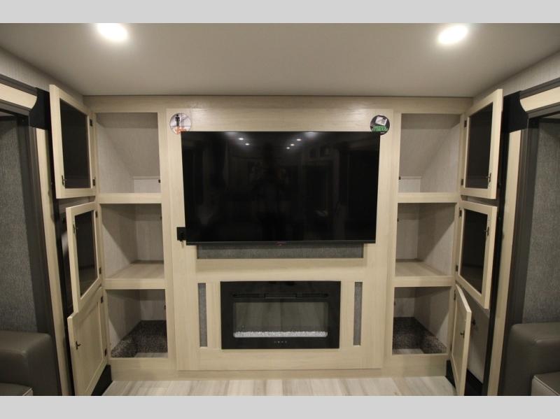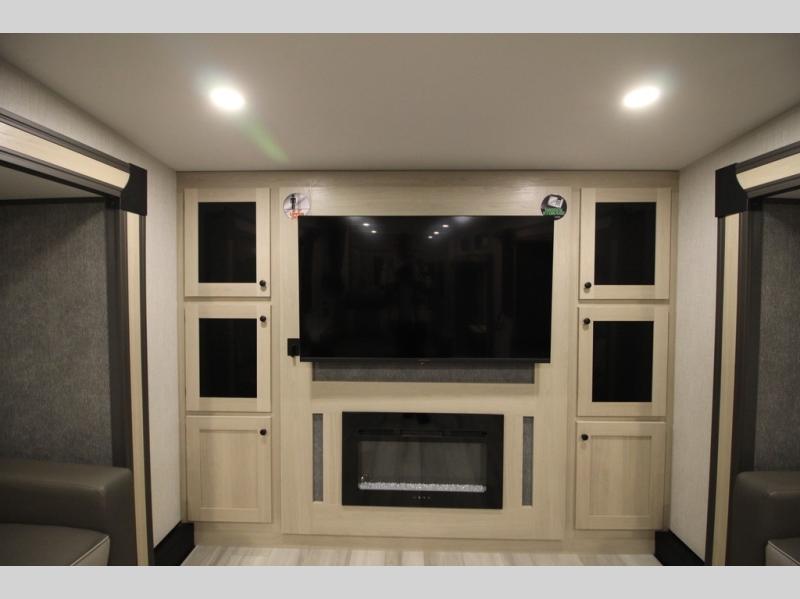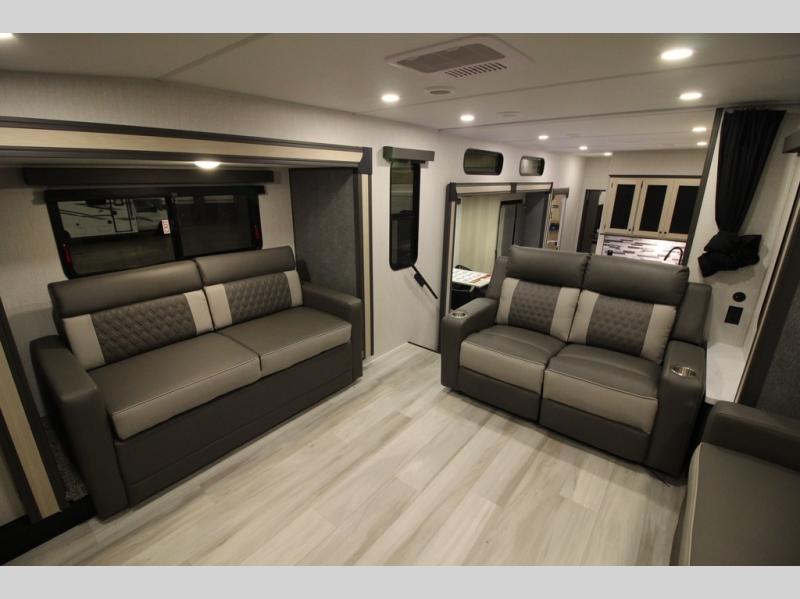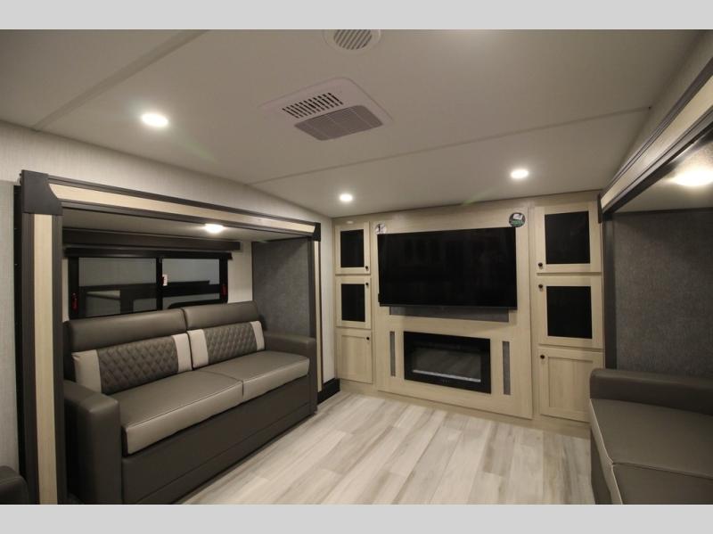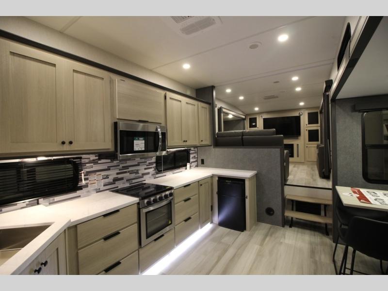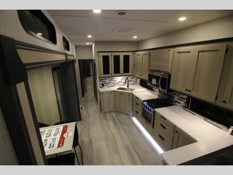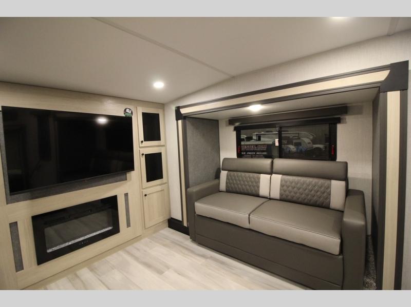 This fifth wheel is packed with features to make each trip enjoyable! The middle kitchen might be your favorite room with wrap-around counter space, a pantry, and a 16 cu. ft. 12V refrigerator for food storage. You can dine at the hi-top table and chairs here, or sit in the front living area on the dual sofas and theater seating! This area can become your guests bedroom at night since there are dual opposing slides and wardrobe storage for their things. You will also find a full-length wardrobe in the rear private bedroom, along with a king bed slide out, plus washer and dryer prep! And of course there is a full bath so everyone can stay clean each day!