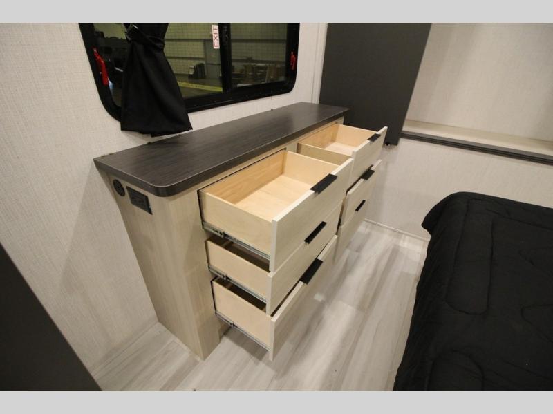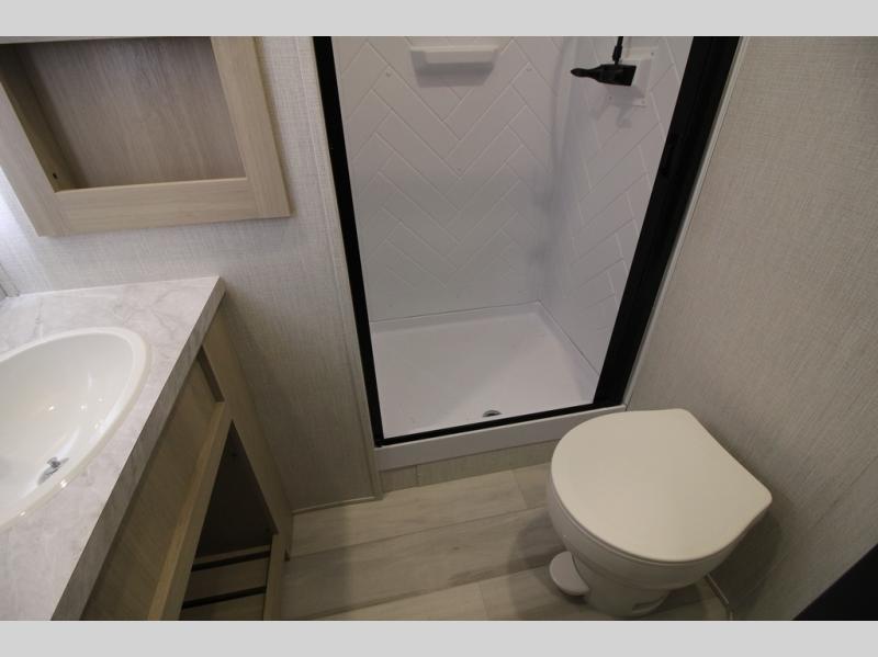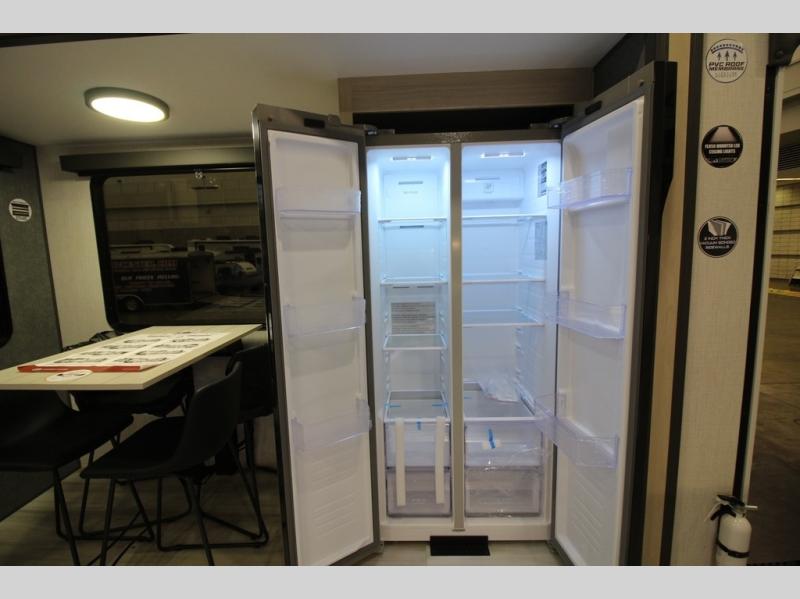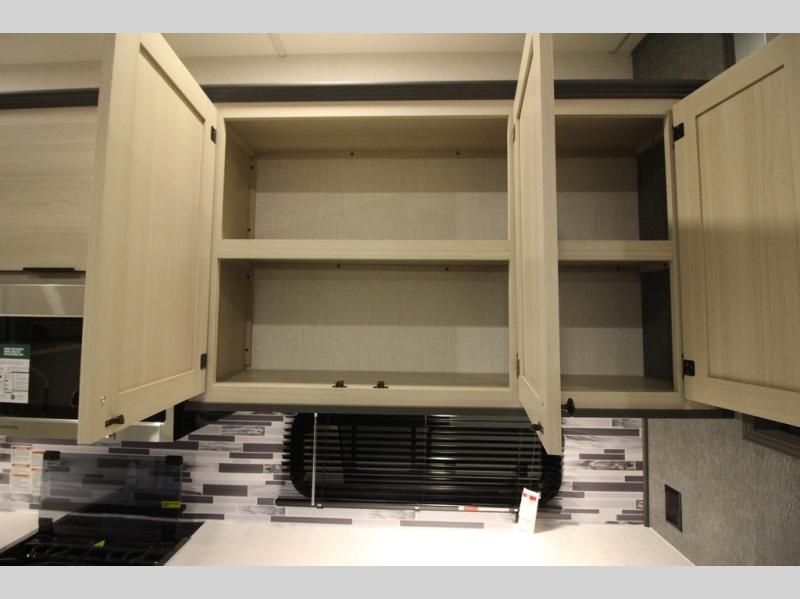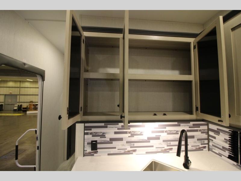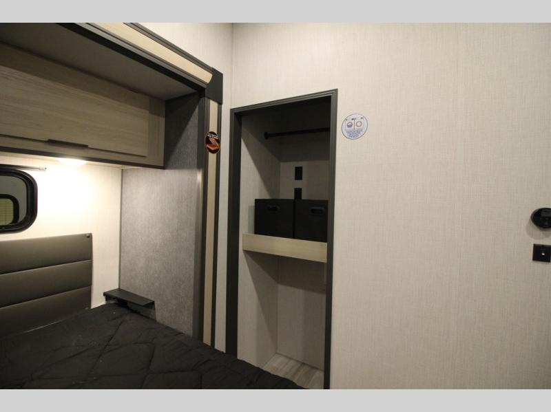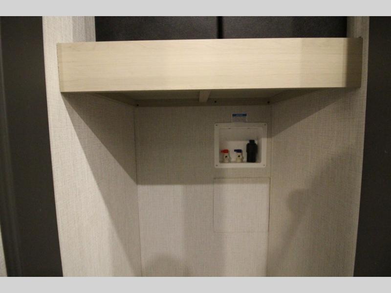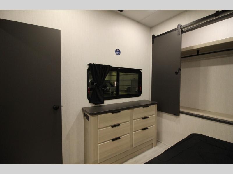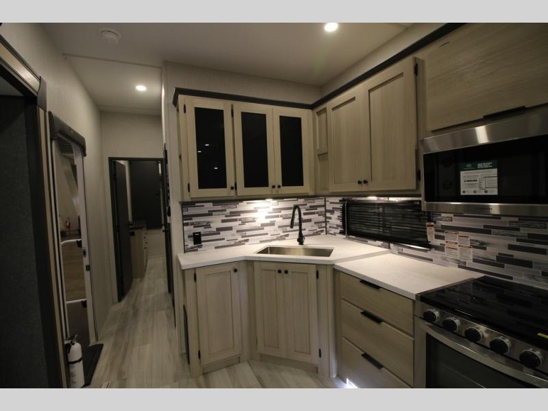 This fifth wheel is packed with features to make each trip enjoyable! The middle kitchen might be your favorite room with wrap-around counter space, a pantry, and a 16 cu. ft. 12V refrigerator for food storage. You can dine at the hi-top table and chairs here, or sit in the front living area on the dual sofas and theater seating! This area can become your guests bedroom at night since there are dual opposing slides and wardrobe storage for their things. You will also find a full-length wardrobe in the rear private bedroom, along with a king bed slide out, plus washer and dryer prep! And of course there is a full bath so everyone can stay clean each day!