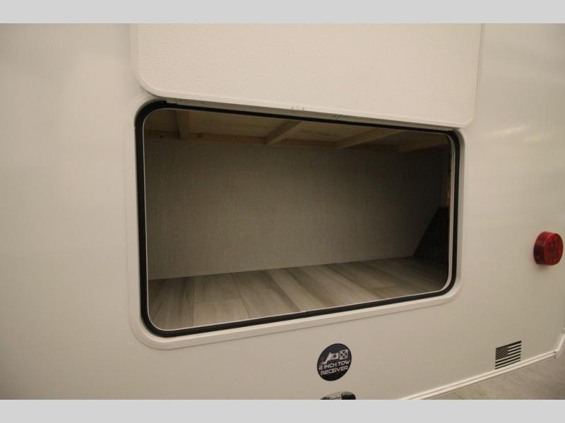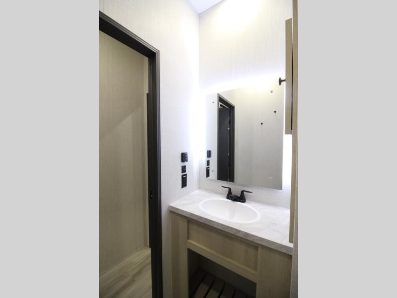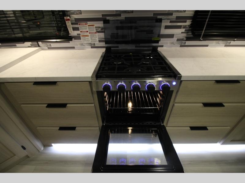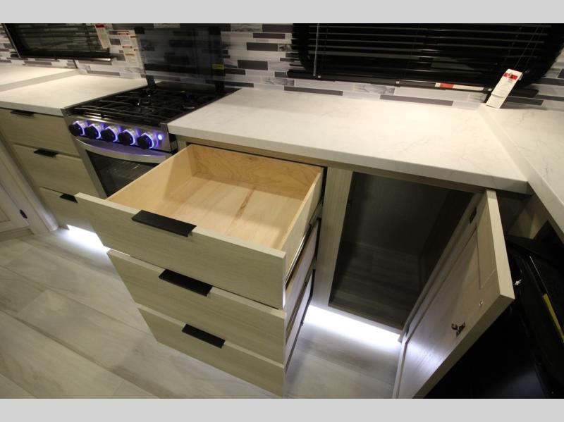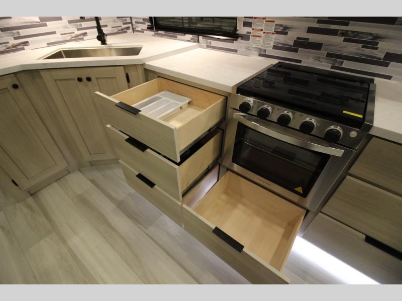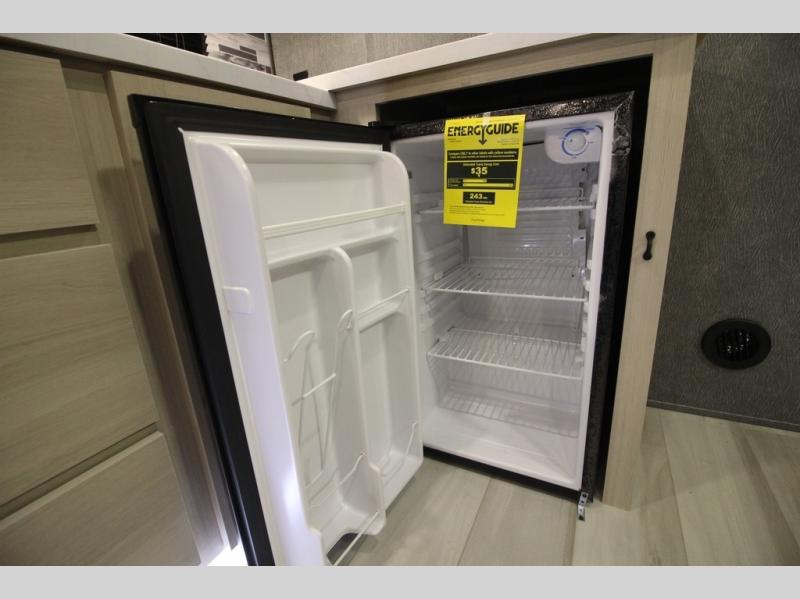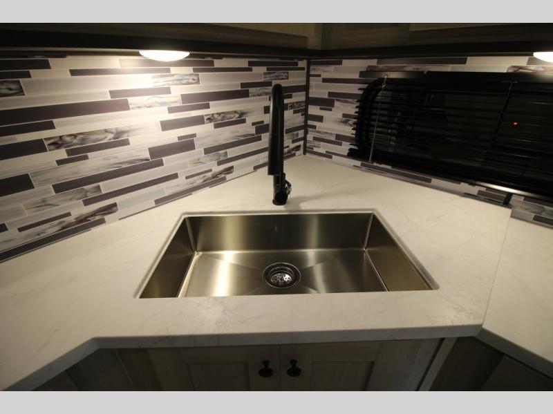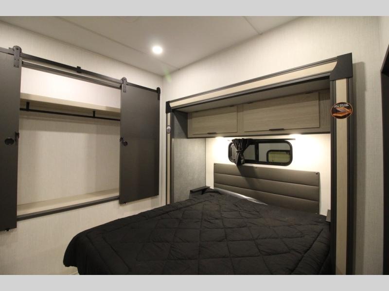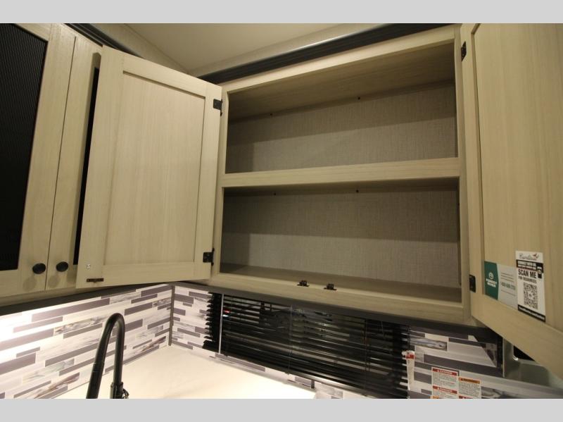 This fifth wheel is packed with features to make each trip enjoyable! The middle kitchen might be your favorite room with wrap-around counter space, a pantry, and a 16 cu. ft. 12V refrigerator for food storage. You can dine at the hi-top table and chairs here, or sit in the front living area on the dual sofas and theater seating! This area can become your guests bedroom at night since there are dual opposing slides and wardrobe storage for their things. You will also find a full-length wardrobe in the rear private bedroom, along with a king bed slide out, plus washer and dryer prep! And of course there is a full bath so everyone can stay clean each day!