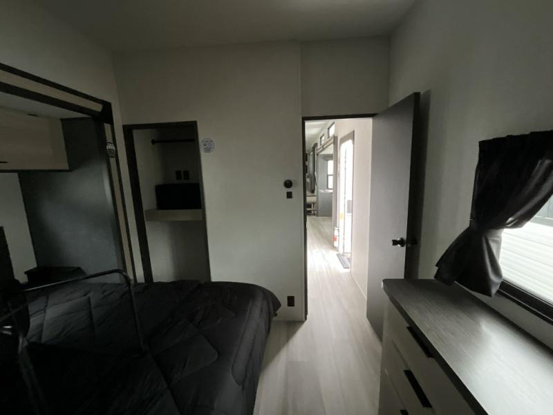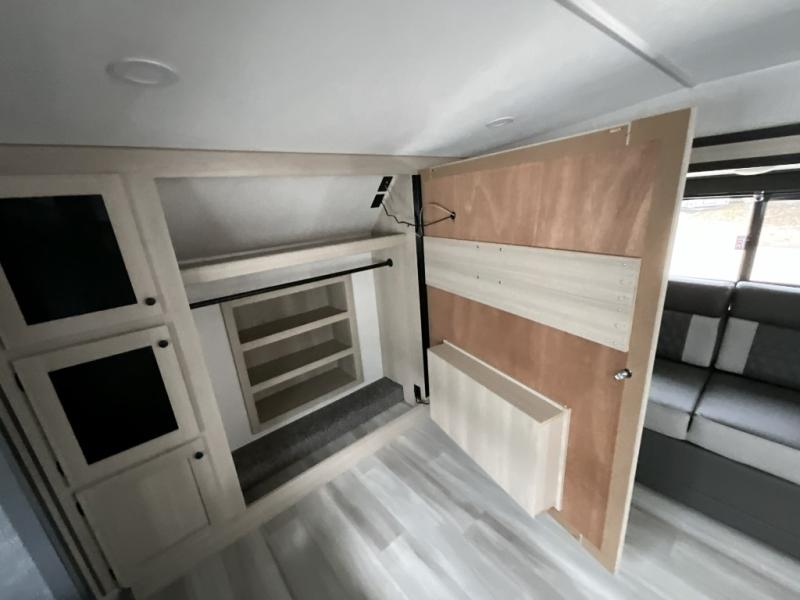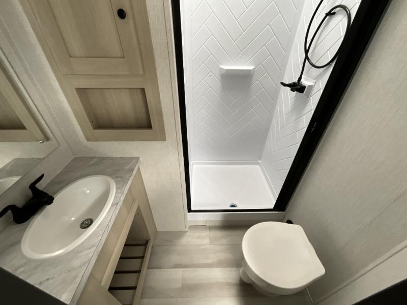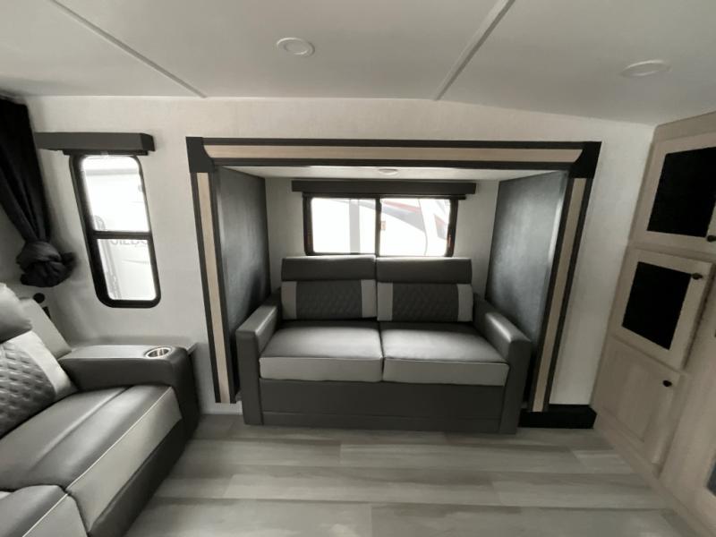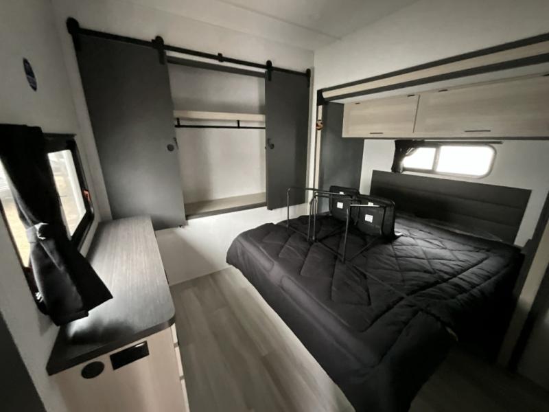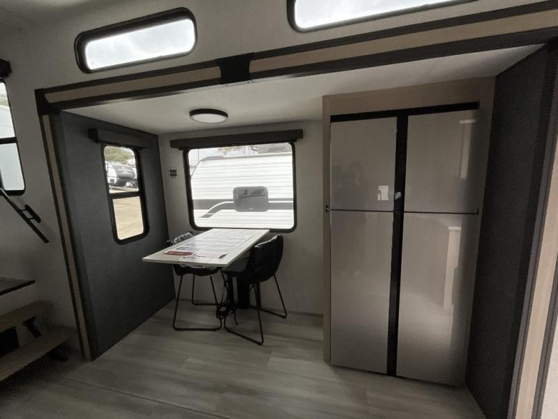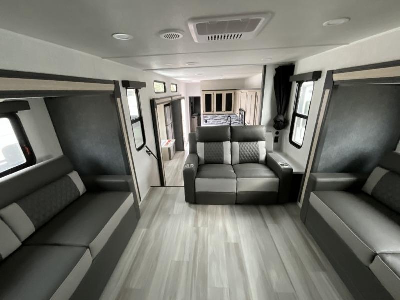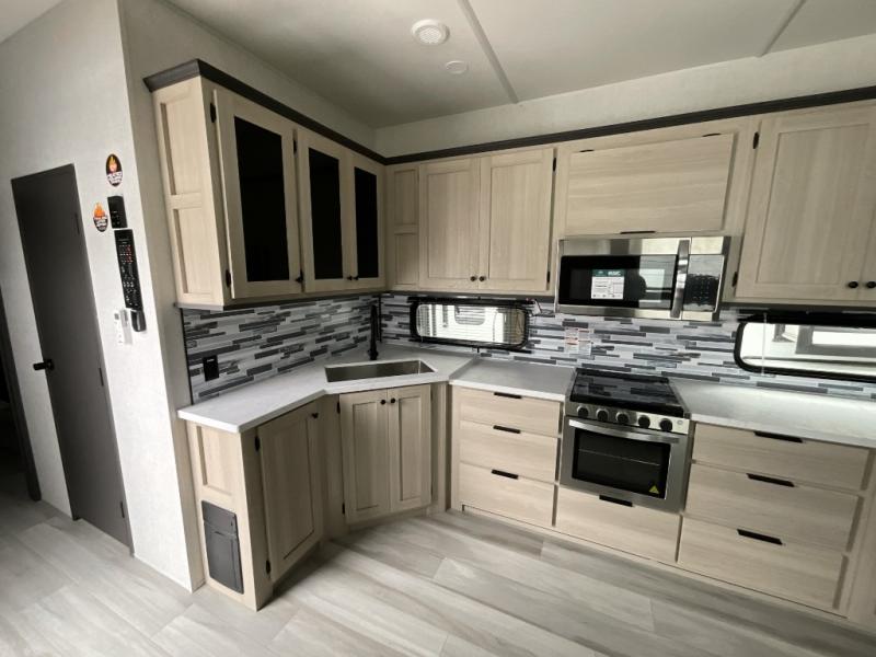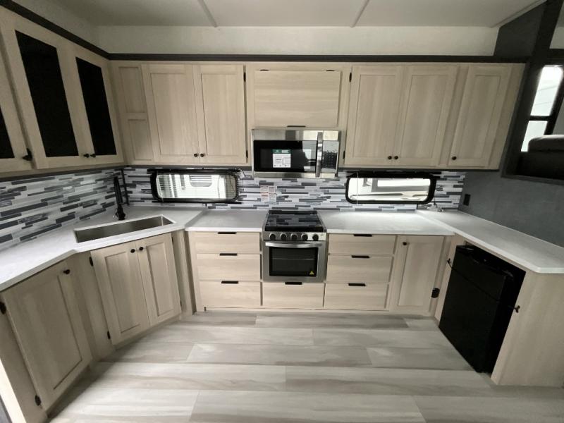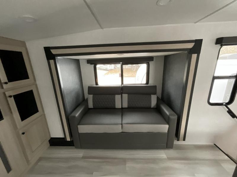 This fifth wheel is packed with features to make each trip enjoyable! The middle kitchen might be your favorite room with wrap-around counter space, a pantry, and a 16 cu. ft. 12V refrigerator for food storage. You can dine at the hi-top table and chairs here, or sit in the front living area on the dual sofas and theater seating! This area can become your guests bedroom at night since there are dual opposing slides and wardrobe storage for their things. You will also find a full-length wardrobe in the rear private bedroom, along with a king bed slide out, plus washer and dryer prep! And of course there is a full bath so everyone can stay clean each day!