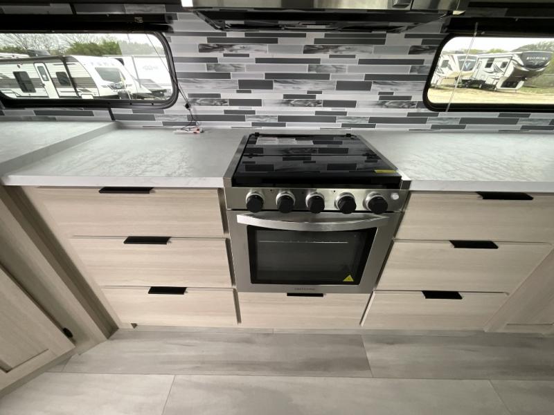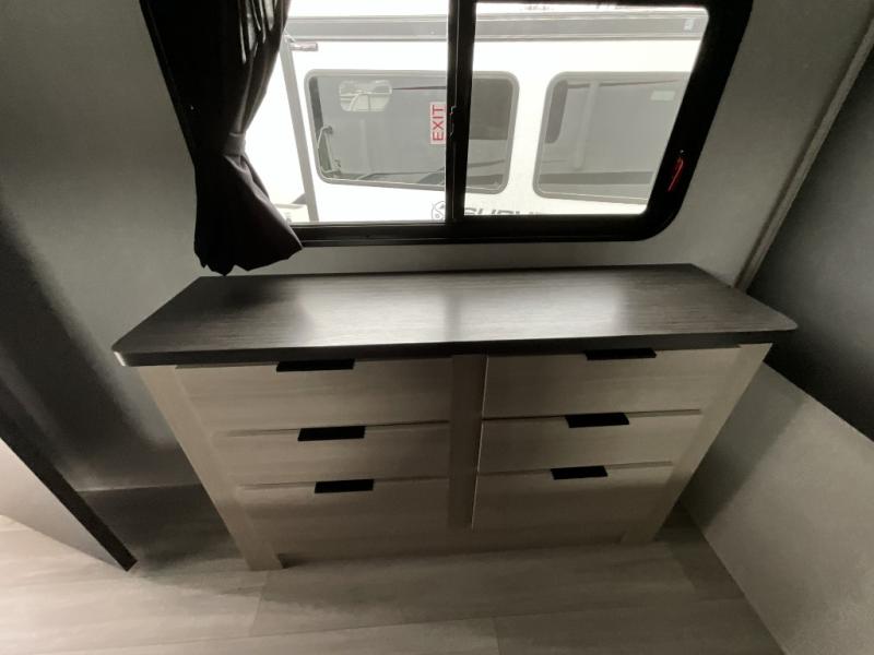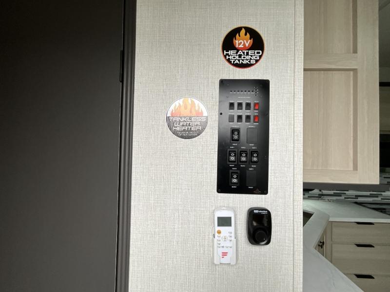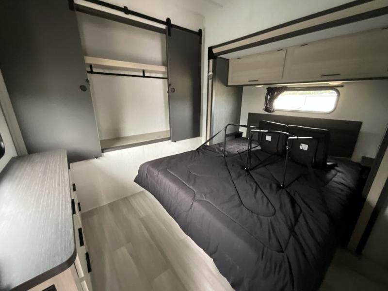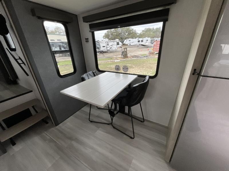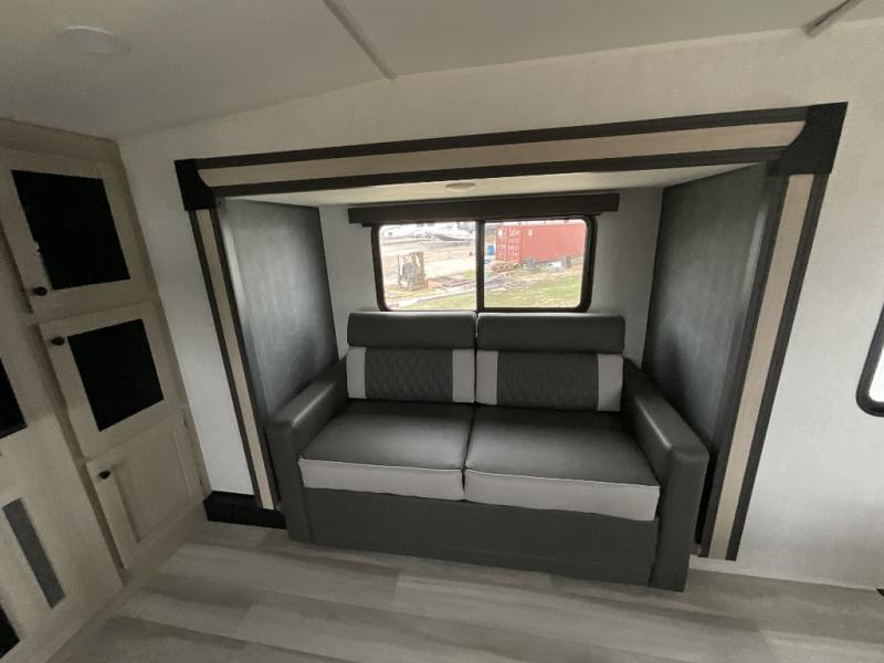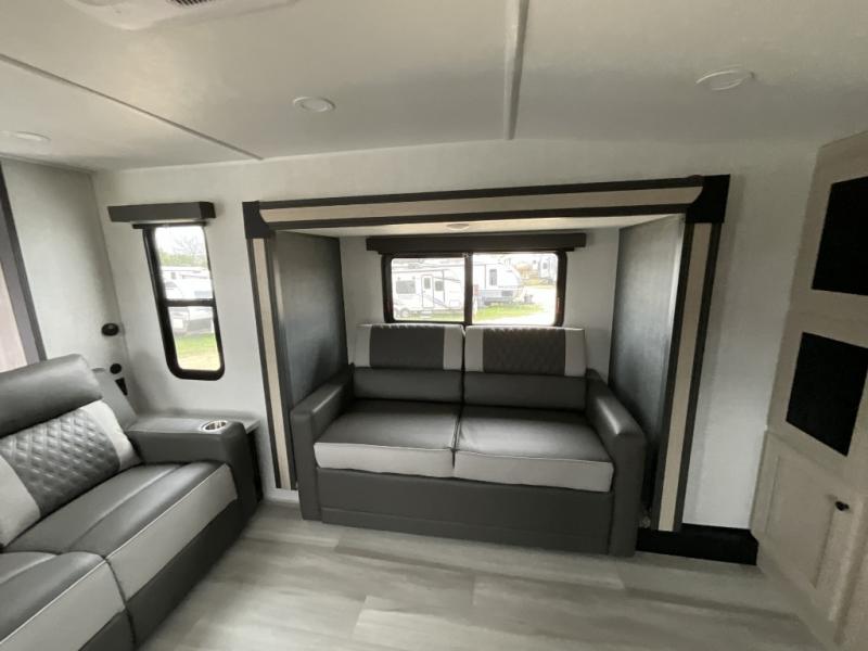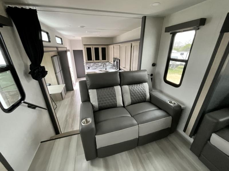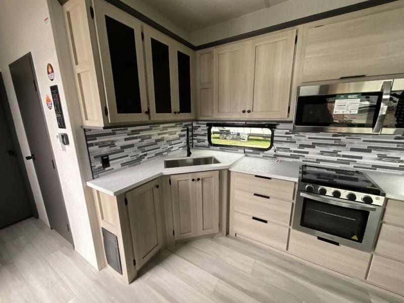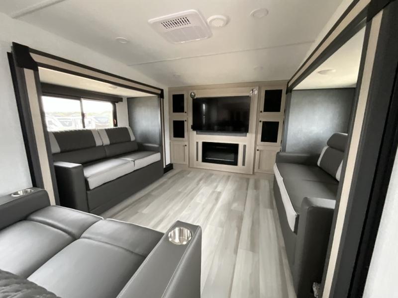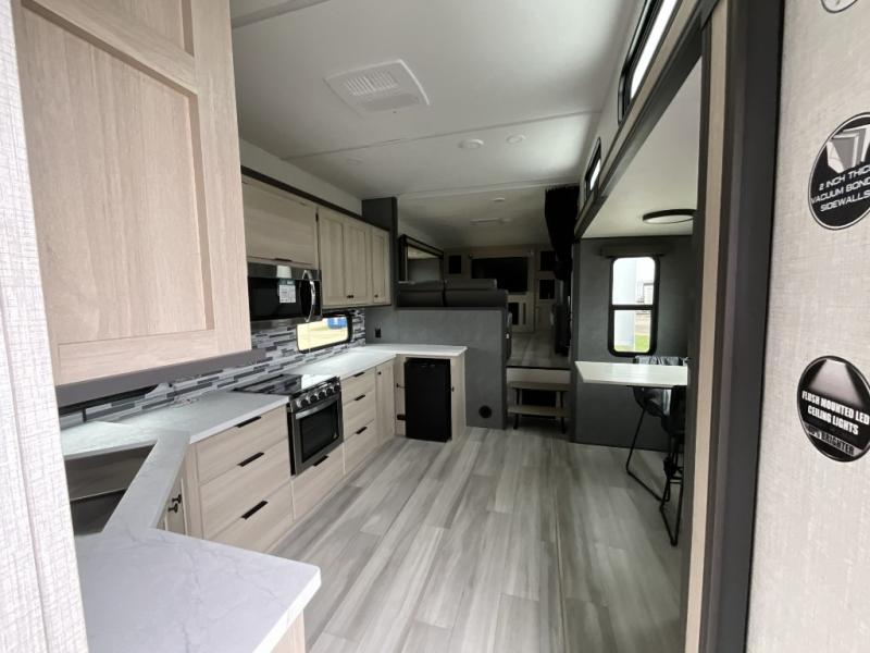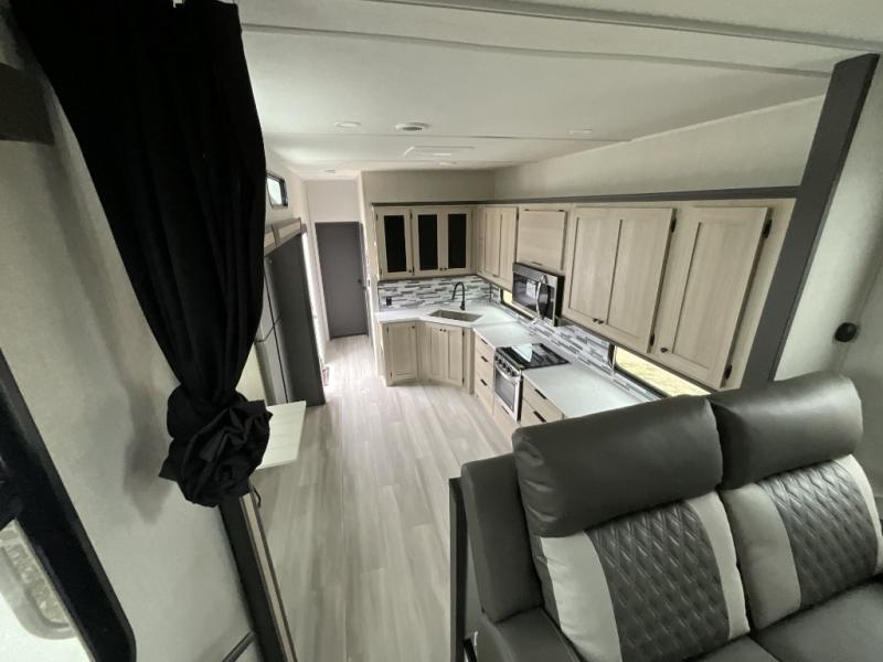 This fifth wheel is packed with features to make each trip enjoyable! The middle kitchen might be your favorite room with wrap-around counter space, a pantry, and a 16 cu. ft. 12V refrigerator for food storage. You can dine at the hi-top table and chairs here, or sit in the front living area on the dual sofas and theater seating! This area can become your guests bedroom at night since there are dual opposing slides and wardrobe storage for their things. You will also find a full-length wardrobe in the rear private bedroom, along with a king bed slide out, plus washer and dryer prep! And of course there is a full bath so everyone can stay clean each day!