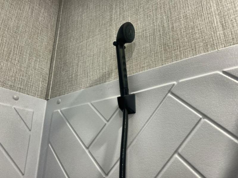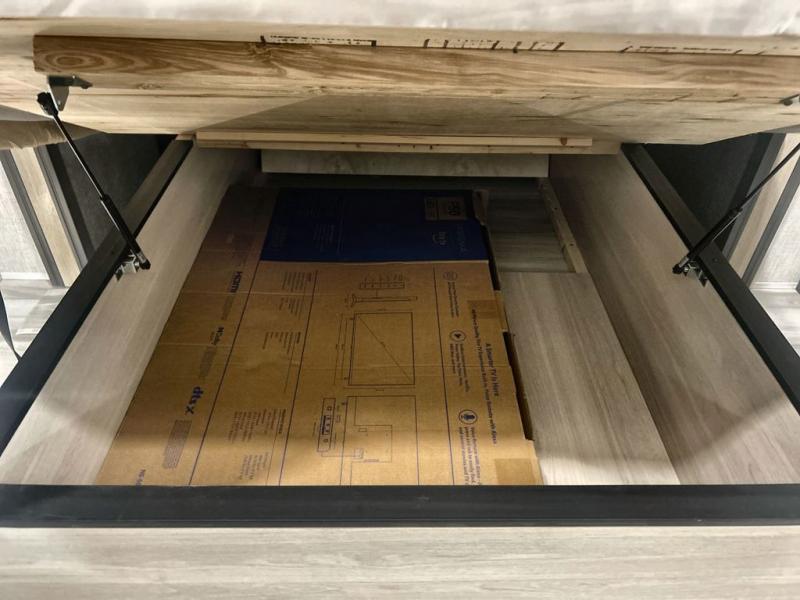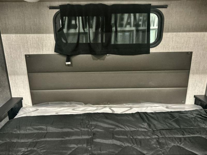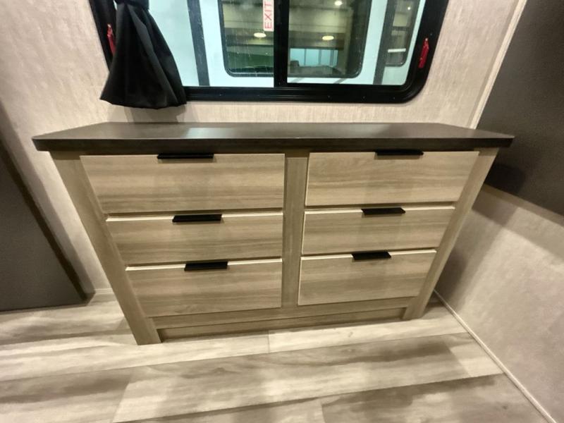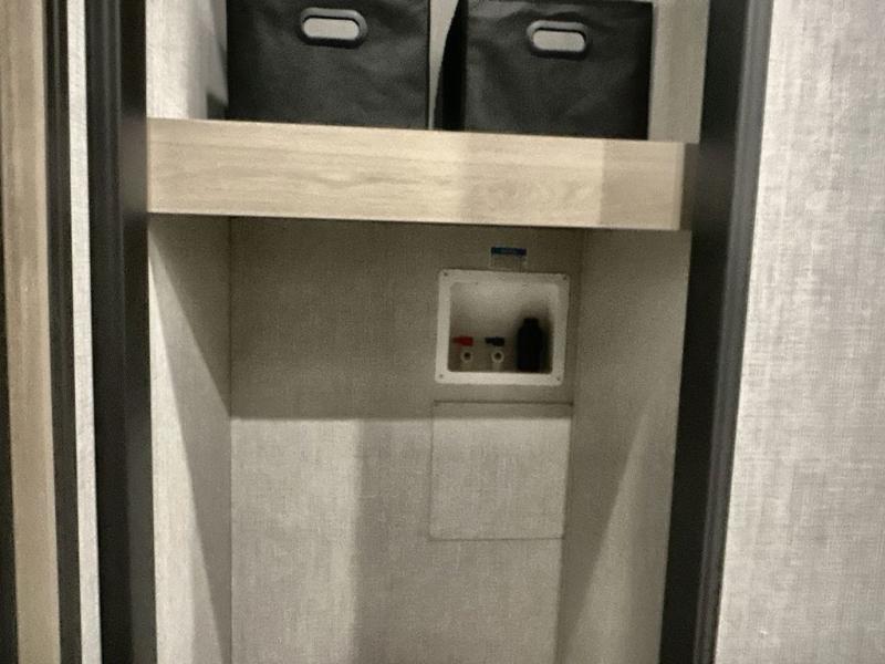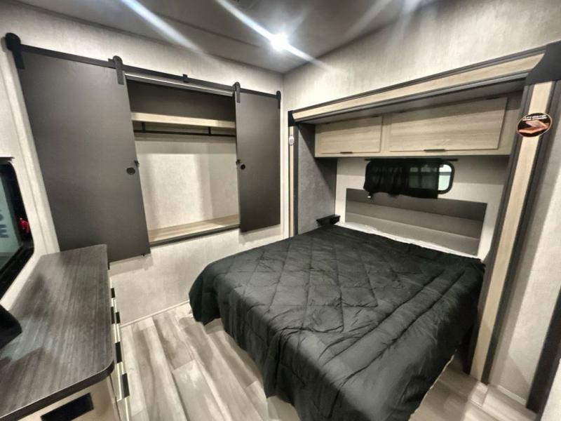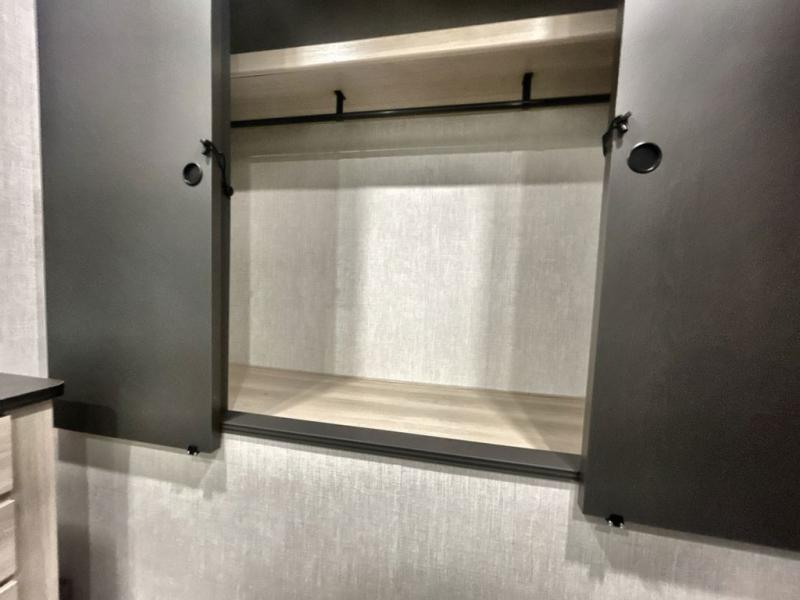 This fifth wheel is packed with features to make each trip enjoyable! The middle kitchen might be your favorite room with wrap-around counter space, a pantry, and a 16 cu. ft. 12V refrigerator for food storage. You can dine at the hi-top table and chairs here, or sit in the front living area on the dual sofas and theater seating! This area can become your guests bedroom at night since there are dual opposing slides and wardrobe storage for their things. You will also find a full-length wardrobe in the rear private bedroom, along with a king bed slide out, plus washer and dryer prep! And of course there is a full bath so everyone can stay clean each day!