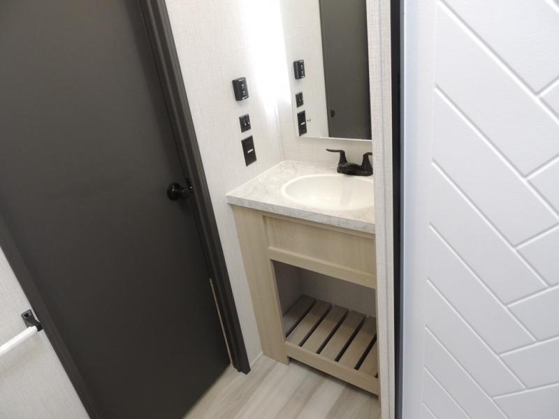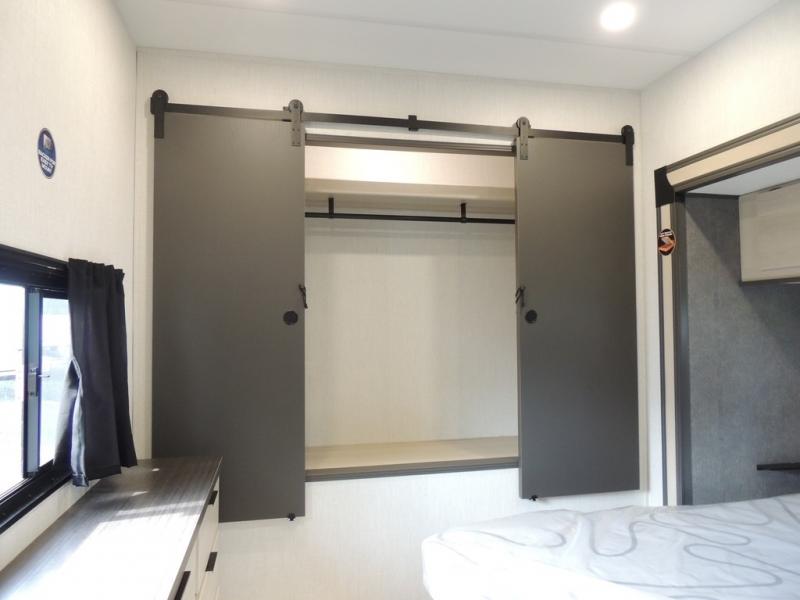 This fifth wheel is packed with features to make each trip enjoyable! The middle kitchen might be your favorite room with wrap-around counter space, a pantry, and a 16-cu. ft. 12V refrigerator for food storage. You can dine at the hi-top table and chairs here or sit in the front living area on the dual sofas and theater seating! This area can become your guest's bedroom at night since there are dual opposing slides and wardrobe storage for their things. You will also find a full-length wardrobe in the rear private bedroom, along with a king bed slide out, plus washer and dryer prep! And of course, there is a full bath so everyone can stay clean each day!