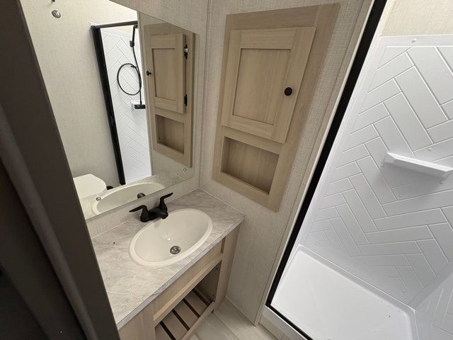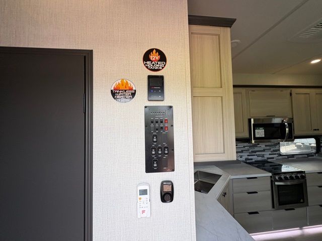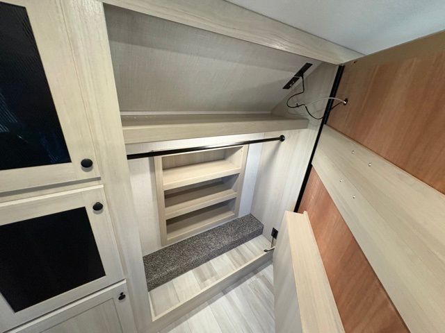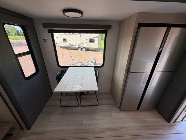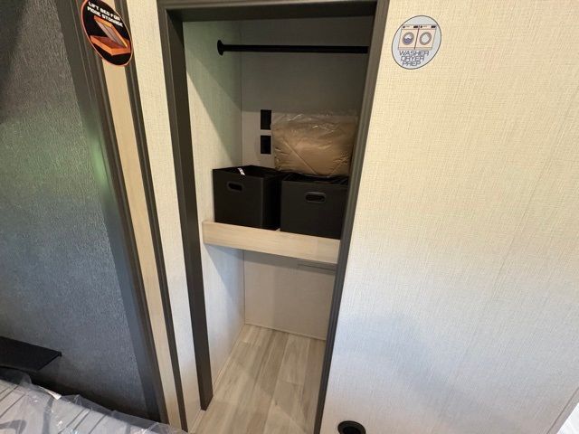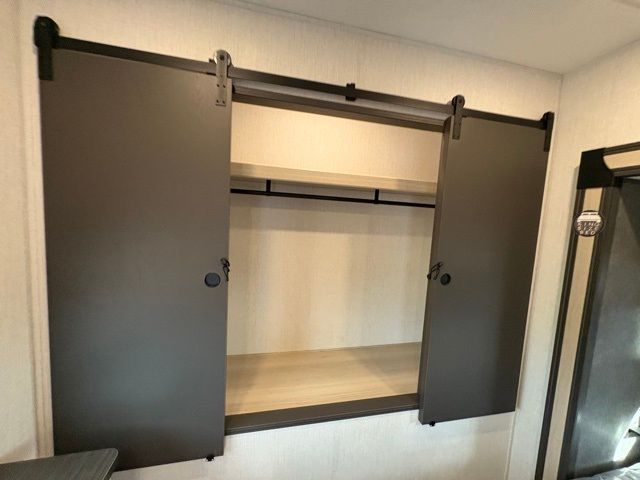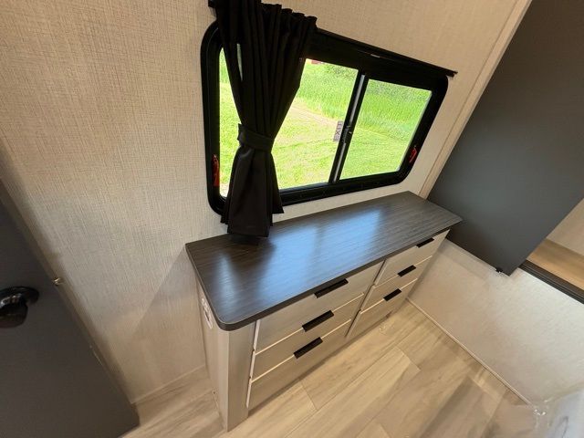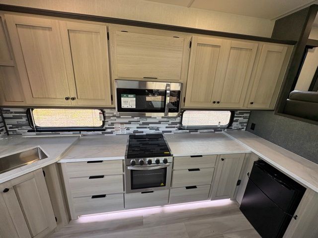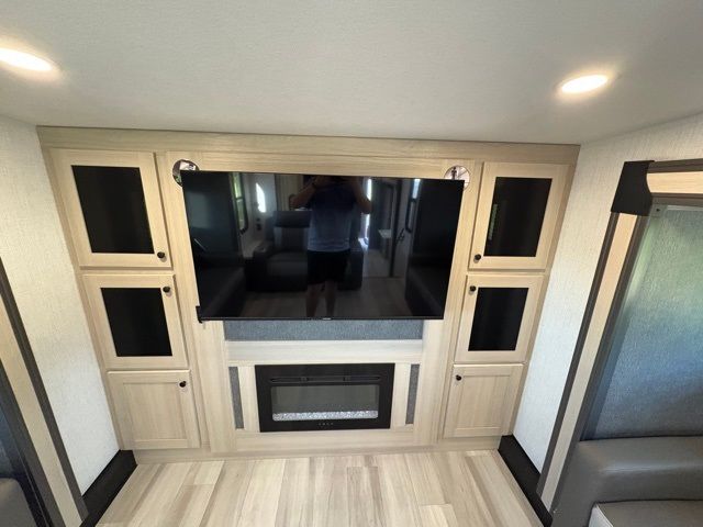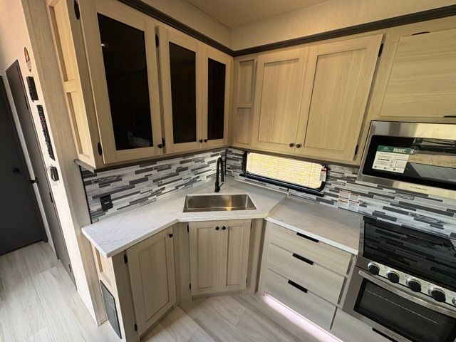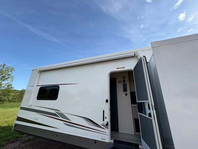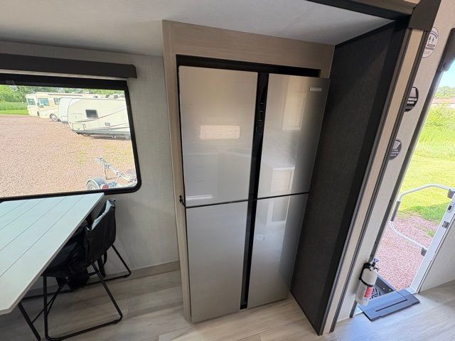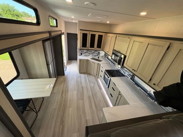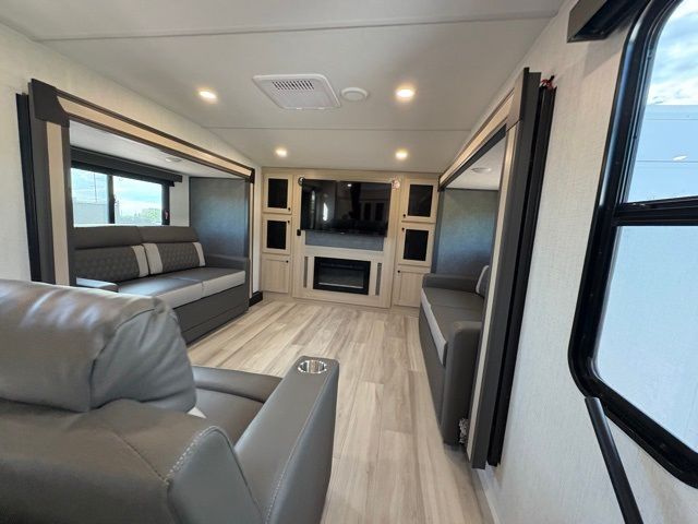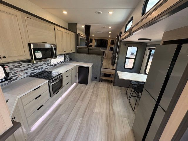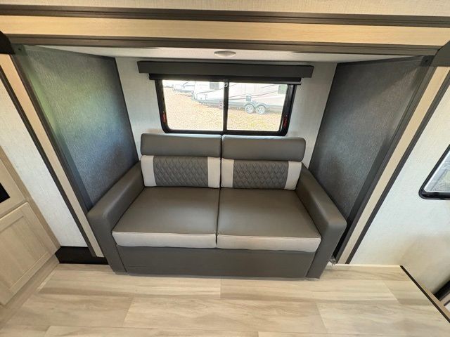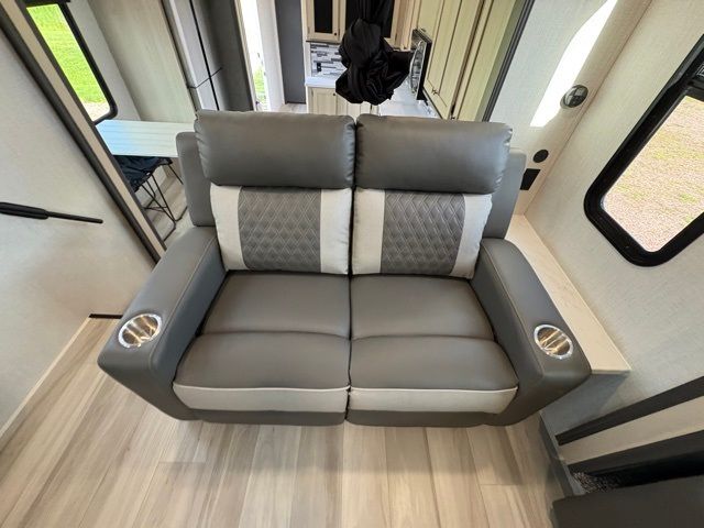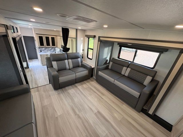 This fifth wheel is packed with features to make each trip enjoyable! The middle kitchen might be your favorite room with wrap-around counter space, a pantry, and a 16-cu. ft. 12V refrigerator for food storage. You can dine at the hi-top table and chairs here or sit in the front living area on the dual sofas and theater seating! This area can become your guest's bedroom at night since there are dual opposing slides and wardrobe storage for their things. You will also find a full-length wardrobe in the rear private bedroom, along with a king bed slide out, plus washer and dryer prep! And of course, there is a full bath so everyone can stay clean each day!