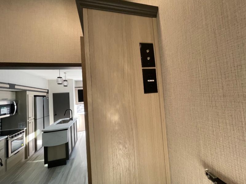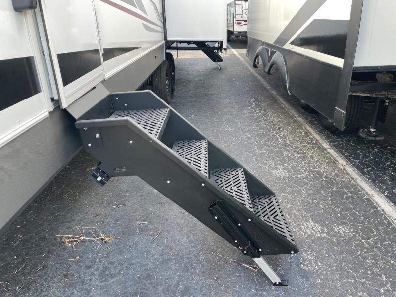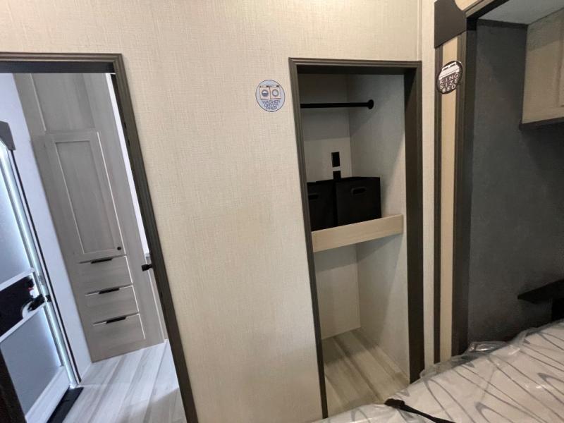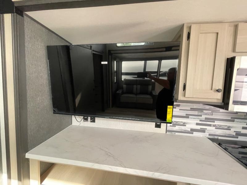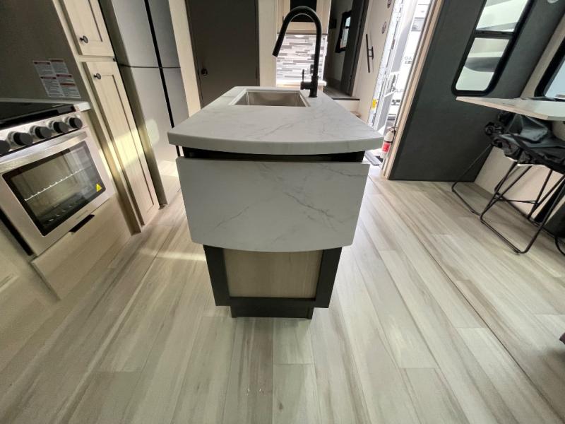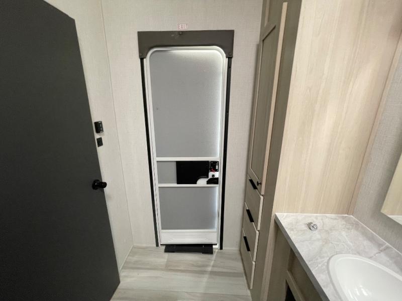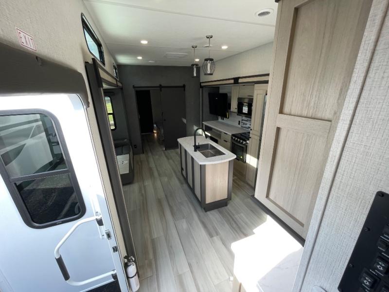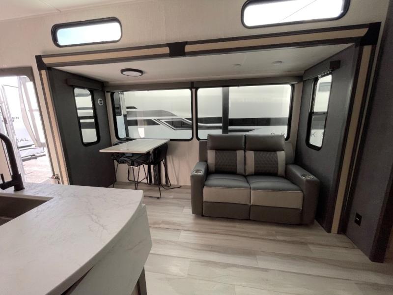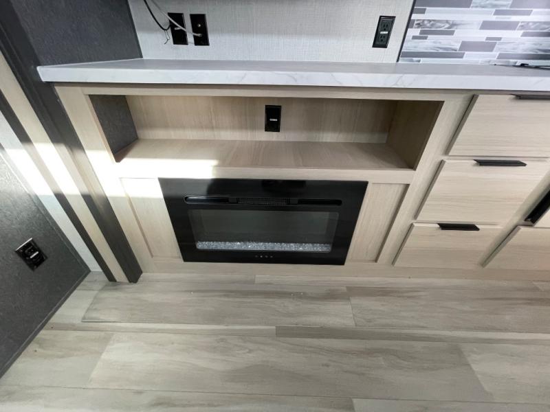 If you're ready for fun, look for further than this dual entry Cardinal fifth wheel! It will be so easy to travel with friends and family since there is a master bedroom with a king bed and a full rear bath, plus a front bunkhouse suite with bunk beds, a queen bed, and a second full bath! The chef of your crew can whip up breakfast in the morning on the 21" 2-in-1 oven range or in the over-the-range microwave. There is also a 16 cu. ft. 12V refrigerator and walk-in pantry for food storage! The theater seating and table with chairs sit across from the entertainment center and fireplace for easy viewing in the evening, or you may just find yourselves outdoors visiting with campground neighbors!
