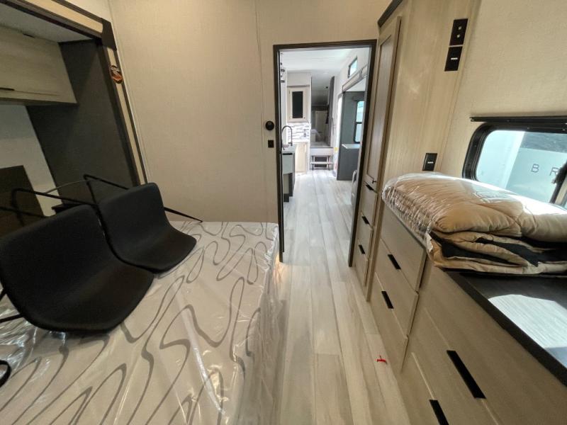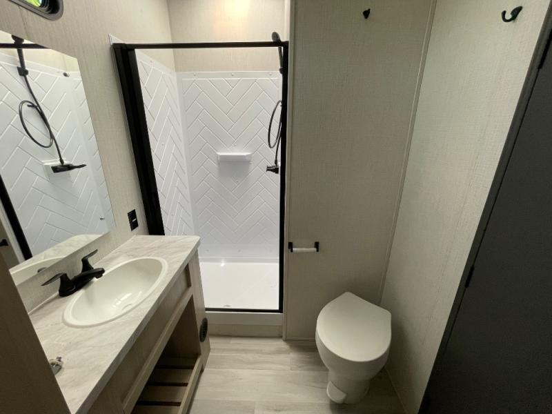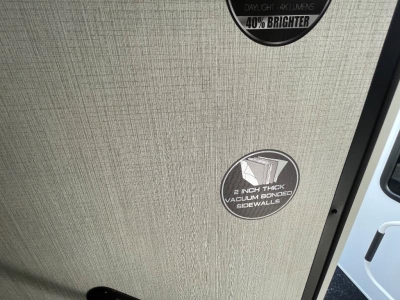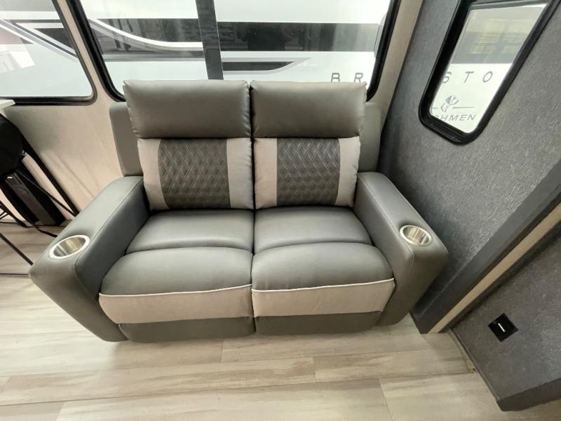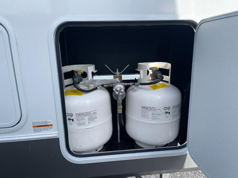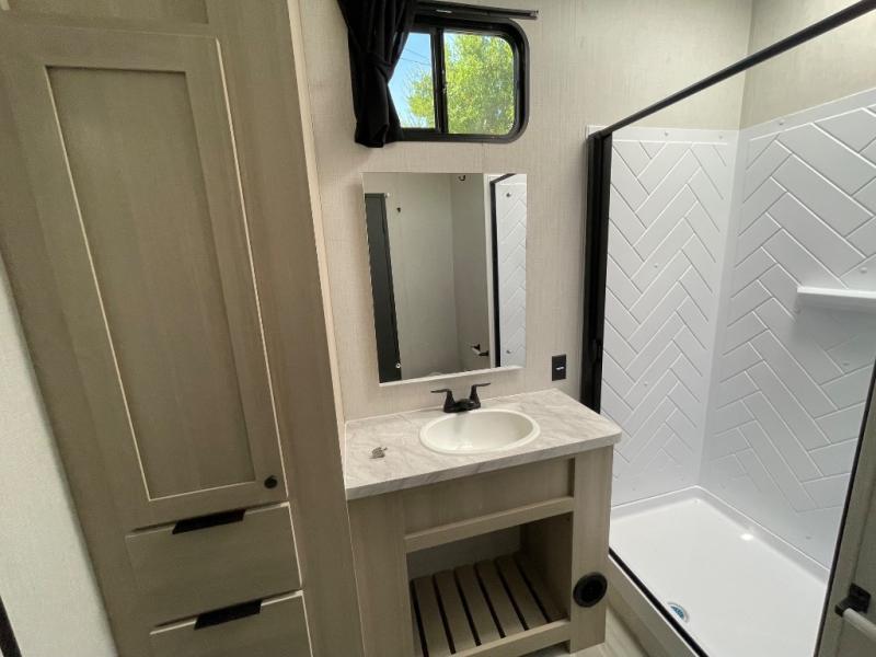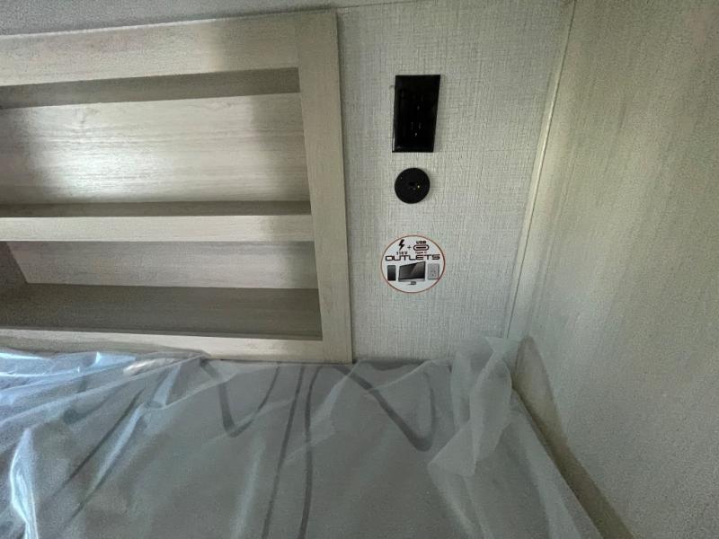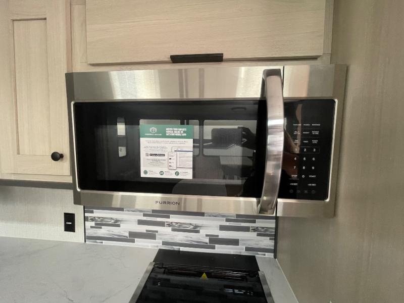 If you're ready for fun, look for further than this dual entry Cardinal fifth wheel! It will be so easy to travel with friends and family since there is a master bedroom with a king bed and a full rear bath, plus a front bunkhouse suite with bunk beds, a queen bed, and a second full bath! The chef of your crew can whip up breakfast in the morning on the 21" 2-in-1 oven range or in the over-the-range microwave. There is also a 16 cu. ft. 12V refrigerator and walk-in pantry for food storage! The theater seating and table with chairs sit across from the entertainment center and fireplace for easy viewing in the evening, or you may just find yourselves outdoors visiting with campground neighbors!