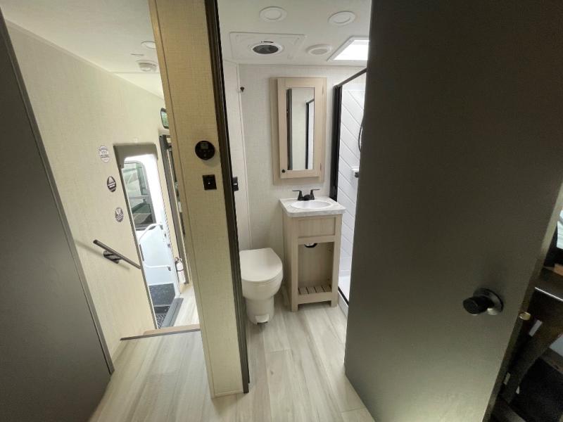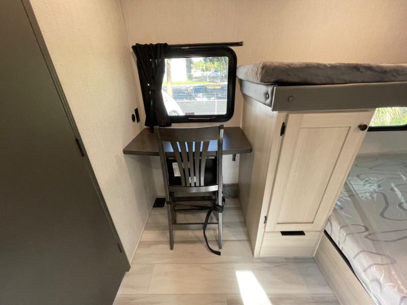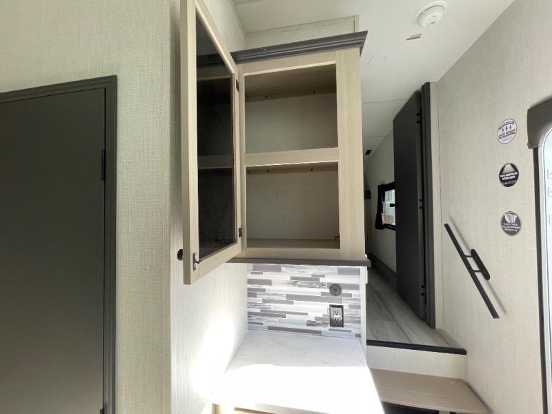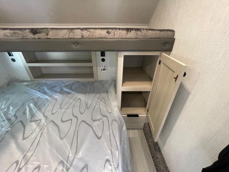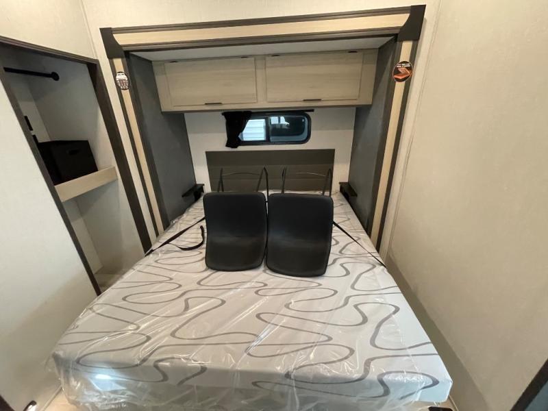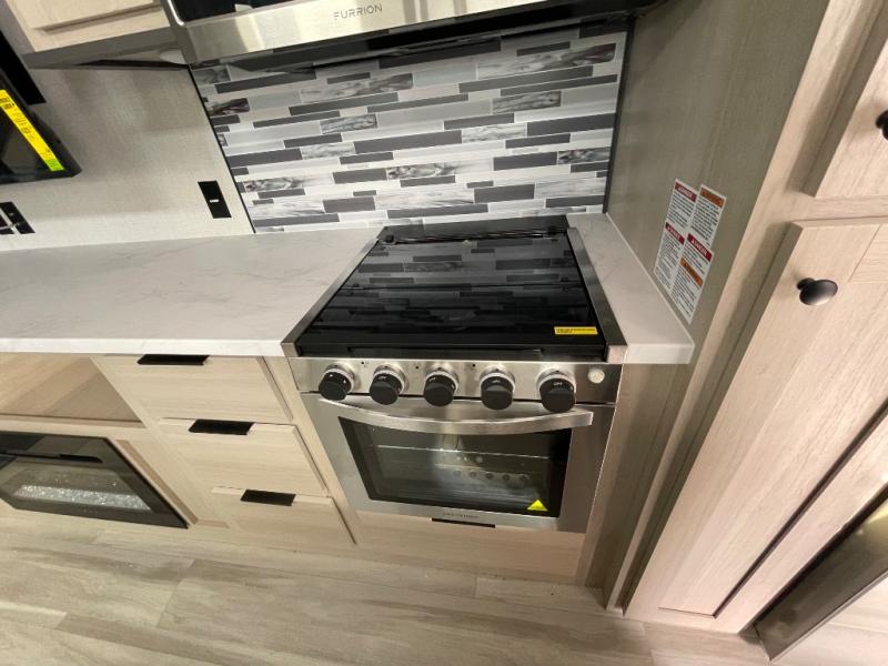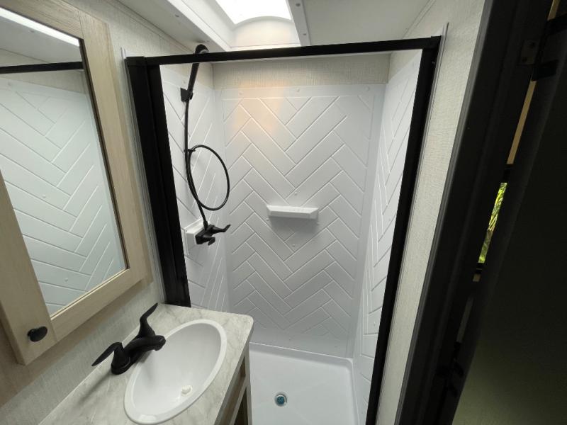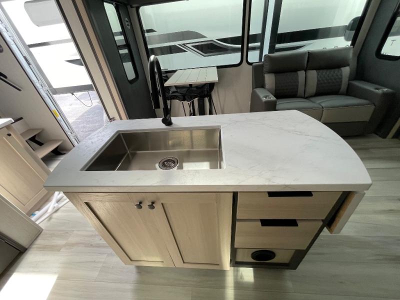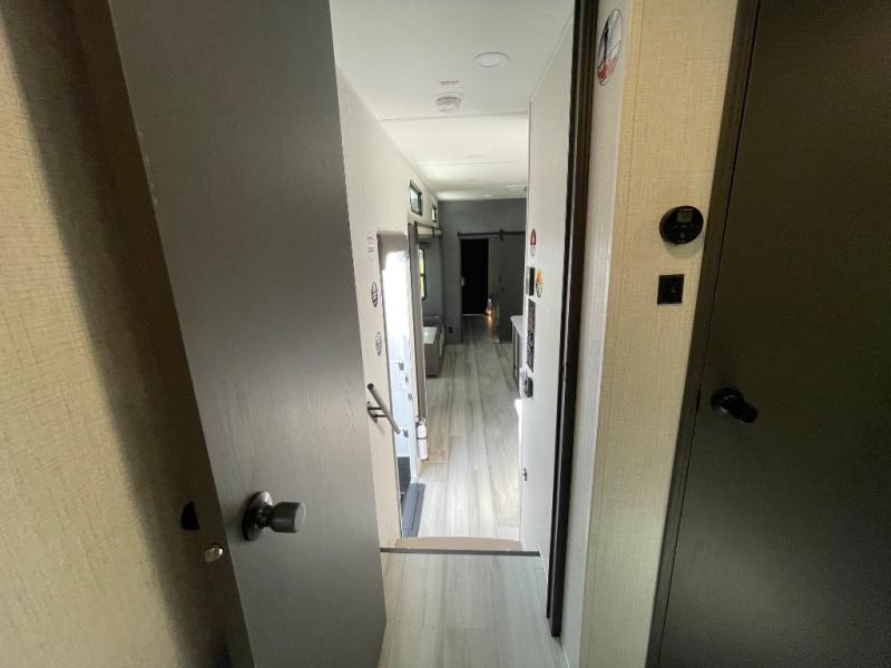 If you're ready for fun, look for further than this dual entry Cardinal fifth wheel! It will be so easy to travel with friends and family since there is a master bedroom with a king bed and a full rear bath, plus a front bunkhouse suite with bunk beds, a queen bed, and a second full bath! The chef of your crew can whip up breakfast in the morning on the 21" 2-in-1 oven range or in the over-the-range microwave. There is also a 16 cu. ft. 12V refrigerator and walk-in pantry for food storage! The theater seating and table with chairs sit across from the entertainment center and fireplace for easy viewing in the evening, or you may just find yourselves outdoors visiting with campground neighbors!
