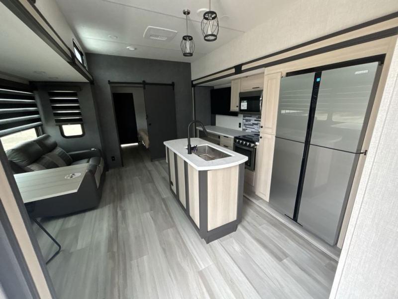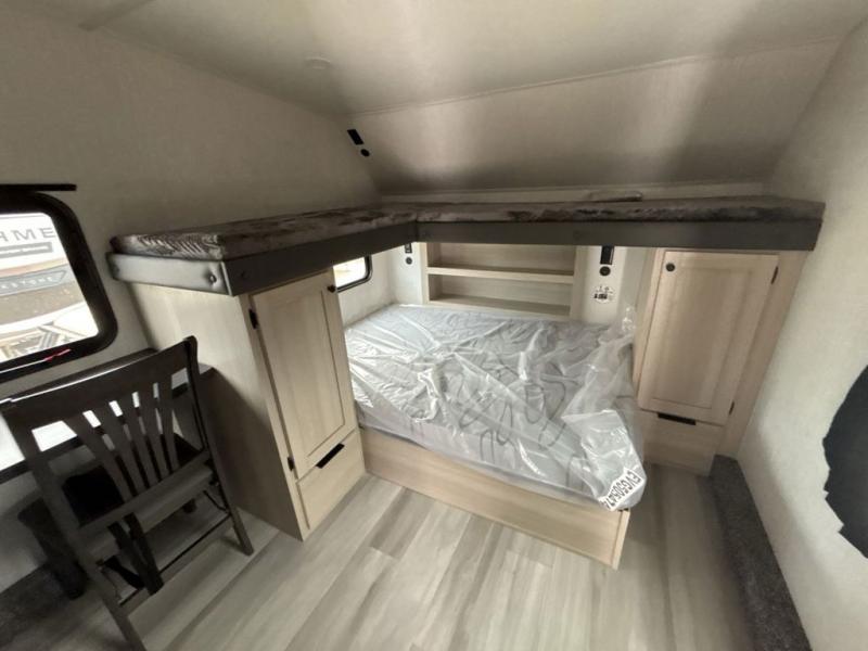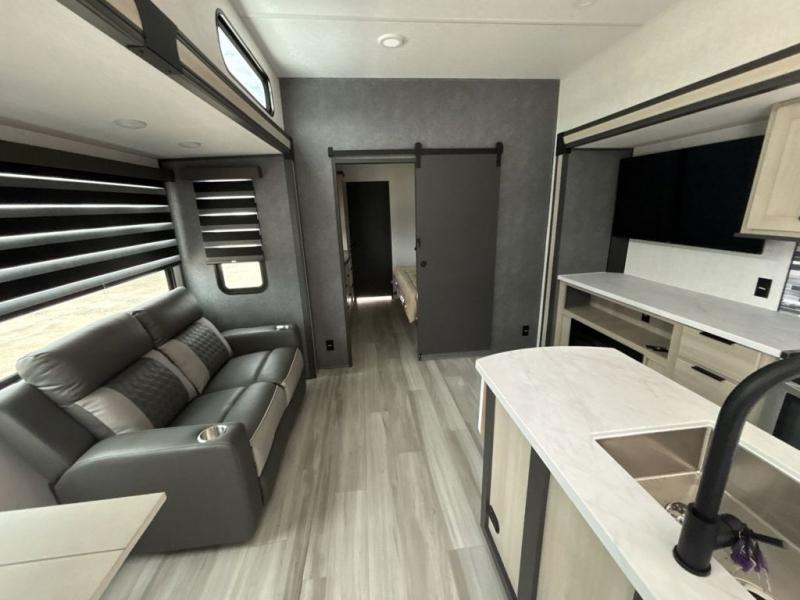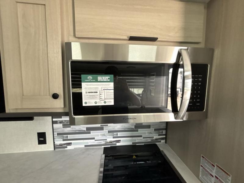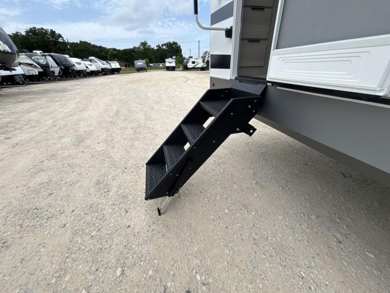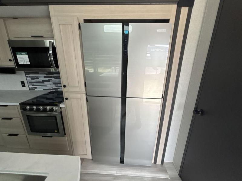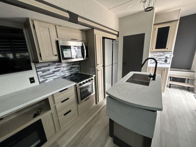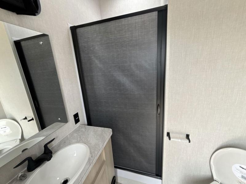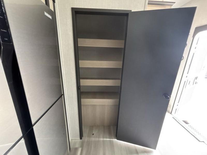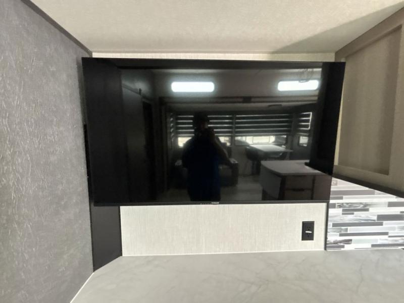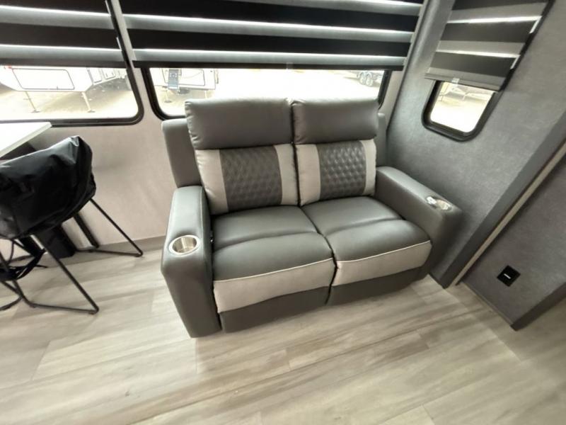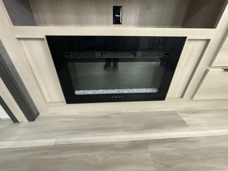 If you're ready for fun, look for further than this dual entry Cardinal fifth wheel! It will be so easy to travel with friends and family since there is a master bedroom with a king bed and a full rear bath, plus a front bunkhouse suite with bunk beds, a queen bed, and a second full bath! The chef of your crew can whip up breakfast in the morning on the 21" 2-in-1 oven range or in the over-the-range microwave. There is also a 16 cu. ft. 12V refrigerator and walk-in pantry for food storage! The theater seating and table with chairs sit across from the entertainment center and fireplace for easy viewing in the evening, or you may just find yourselves outdoors visiting with campground neighbors!