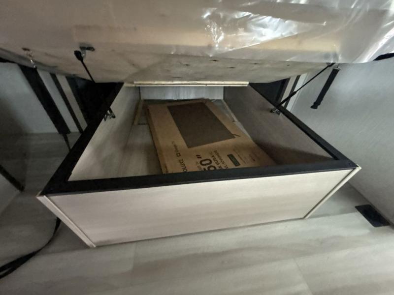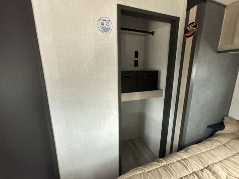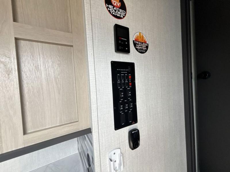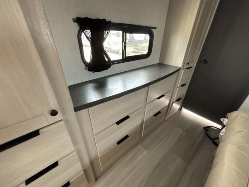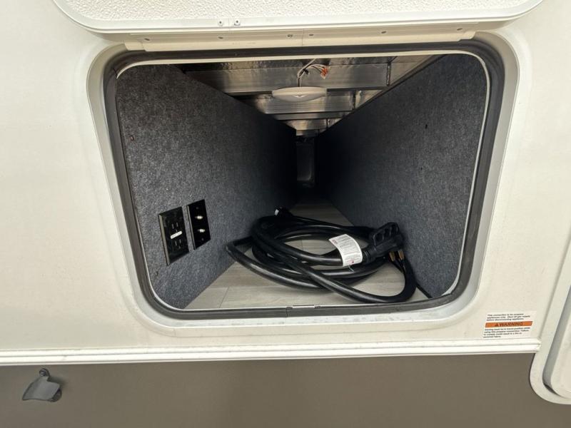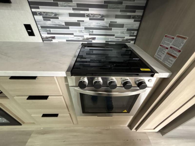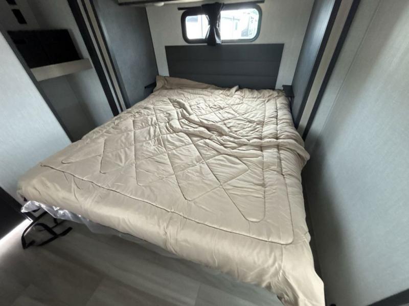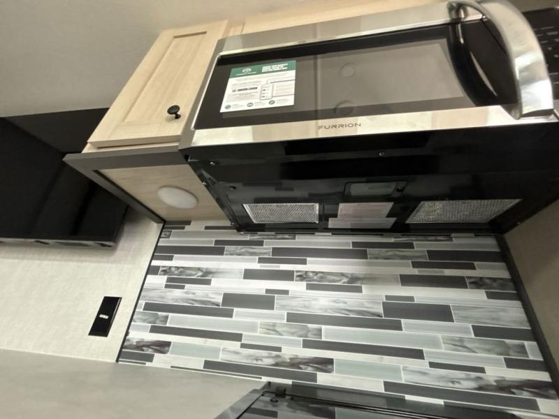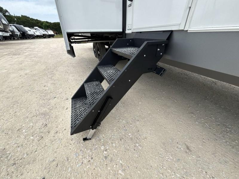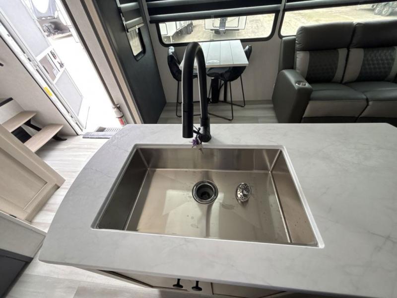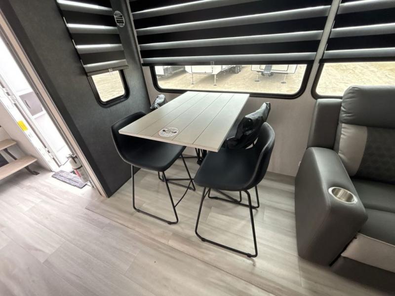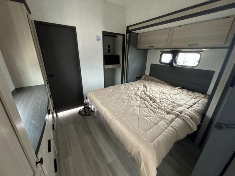 If you're ready for fun, look for further than this dual entry Cardinal fifth wheel! It will be so easy to travel with friends and family since there is a master bedroom with a king bed and a full rear bath, plus a front bunkhouse suite with bunk beds, a queen bed, and a second full bath! The chef of your crew can whip up breakfast in the morning on the 21" 2-in-1 oven range or in the over-the-range microwave. There is also a 16 cu. ft. 12V refrigerator and walk-in pantry for food storage! The theater seating and table with chairs sit across from the entertainment center and fireplace for easy viewing in the evening, or you may just find yourselves outdoors visiting with campground neighbors!