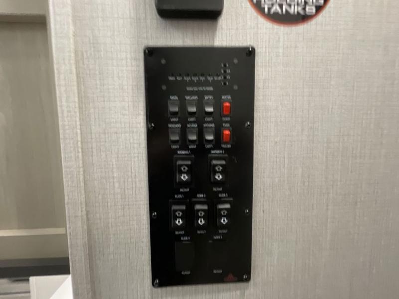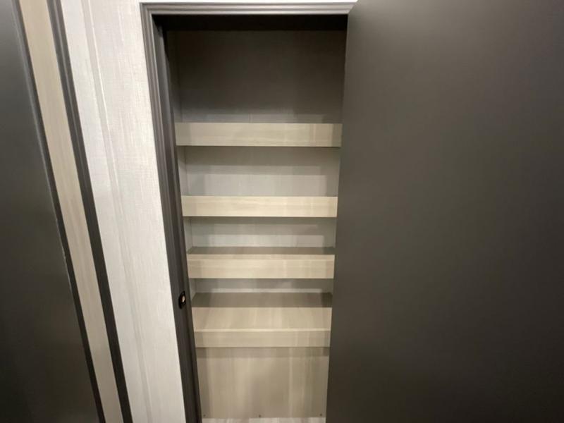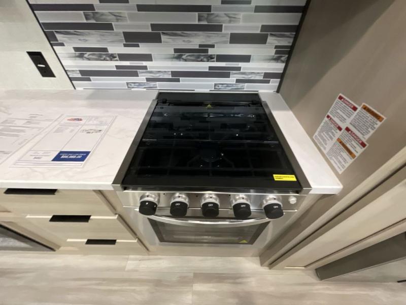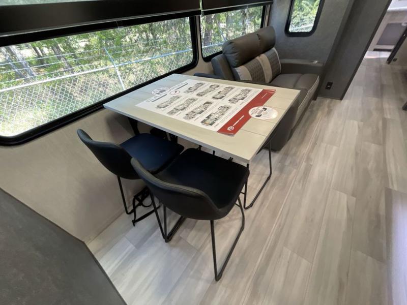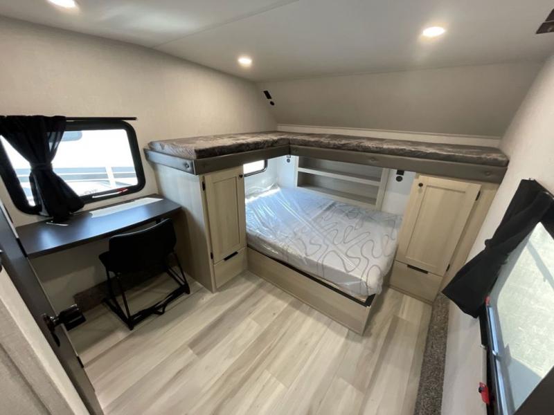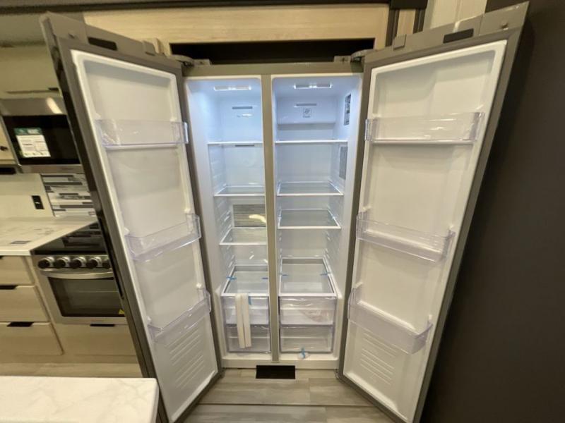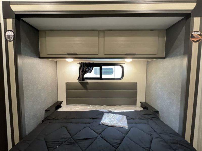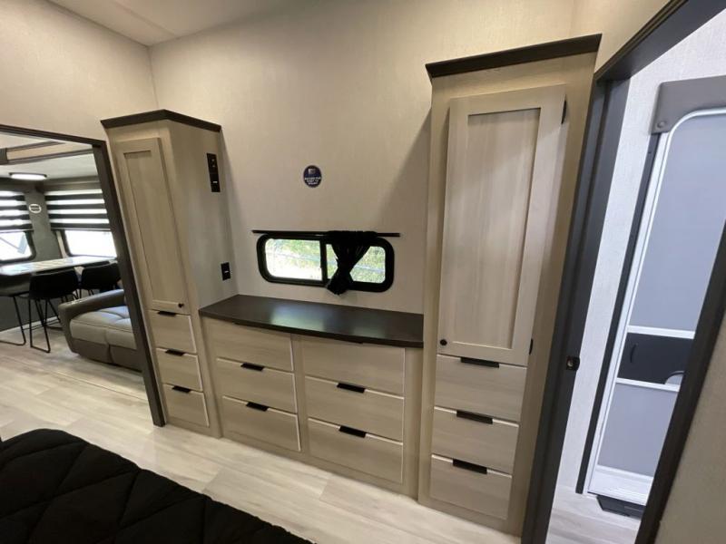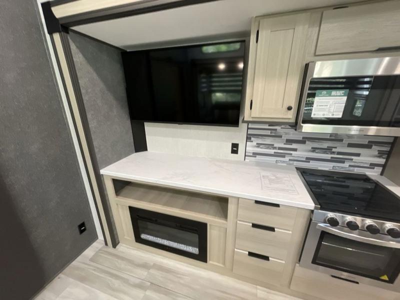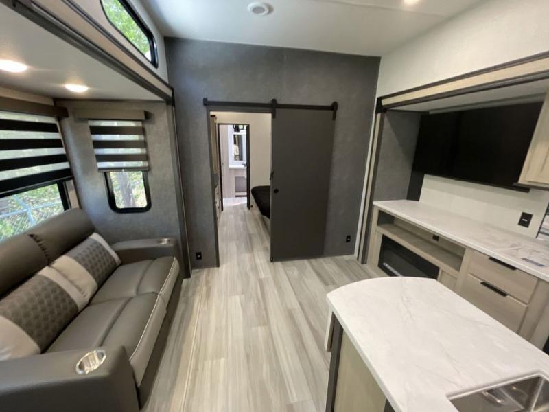 If you're ready for fun, look for further than this dual entry Cardinal fifth wheel! It will be so easy to travel with friends and family since there is a master bedroom with a king bed and a full rear bath, plus a front bunkhouse suite with bunk beds, a queen bed, and a second full bath! The chef of your crew can whip up breakfast in the morning on the 21" 2-in-1 oven range or in the over-the-range microwave. There is also a 16 cu. ft. 12V refrigerator and walk-in pantry for food storage! The theater seating and table with chairs sit across from the entertainment center and fireplace for easy viewing in the evening, or you may just find yourselves outdoors visiting with campground neighbors!