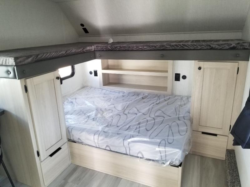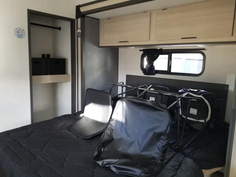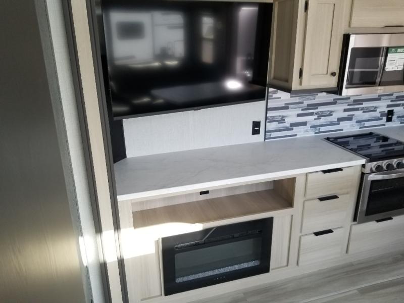 If you're ready for fun, look for further than this dual entry Cardinal fifth wheel! It will be so easy to travel with friends and family since there is a master bedroom with a 66" x 80" king bed and a full rear bath, plus a front bunkhouse suite with bunk beds, a full-size bed, and a second full bath! The chef of your crew can whip up breakfast in the morning on the 21" 2-in-1 oven range or in the over-the-range microwave. There is also a 16-cu. ft. 12V refrigerator and walk-in pantry for food storage! The super sofa slide out sits across from the entertainment center and fireplace for easy viewing in the evening, or you may just find yourselves outdoors visiting with campground neighbors!