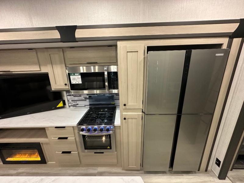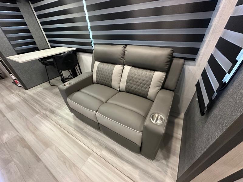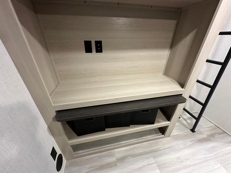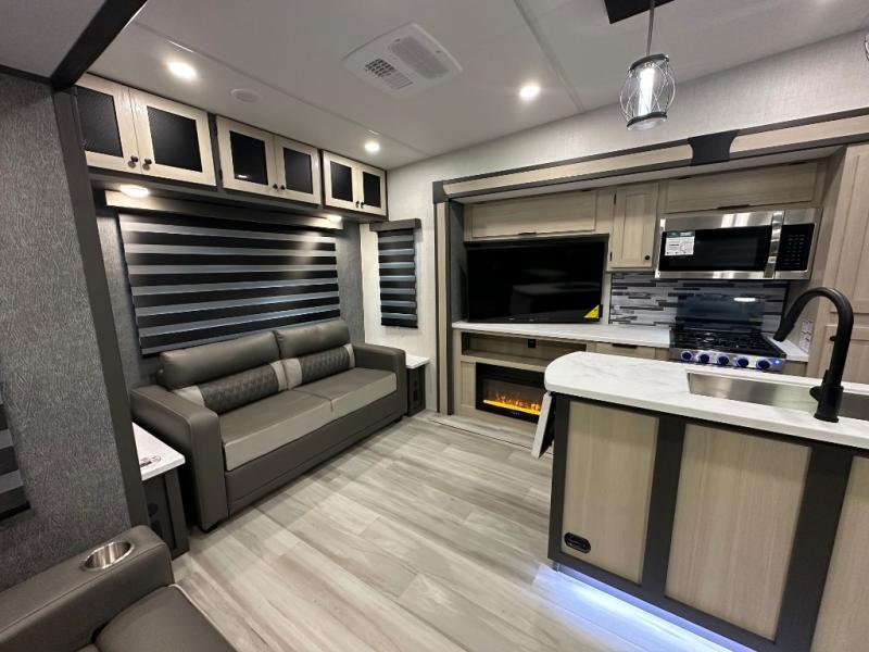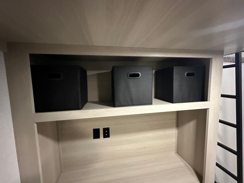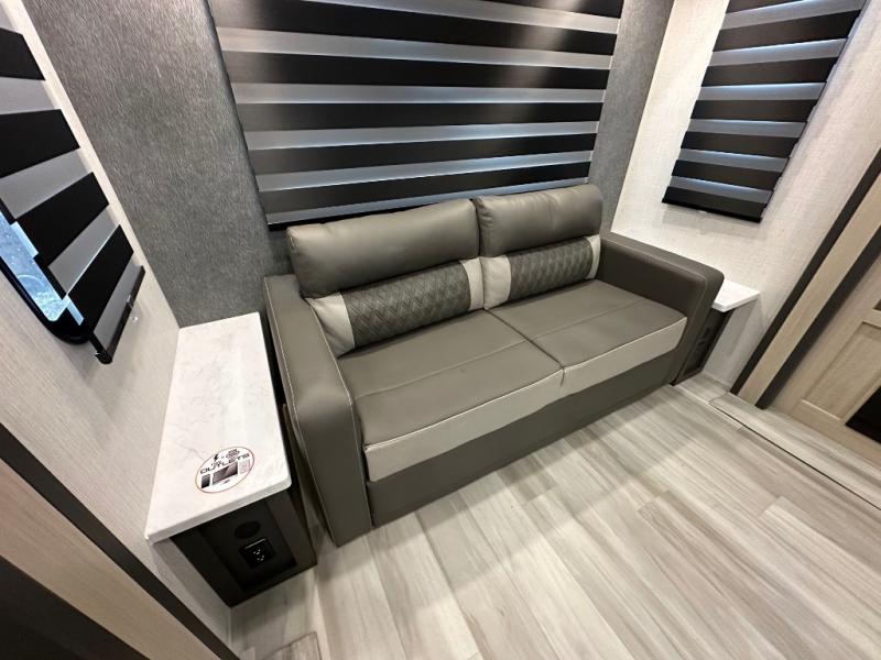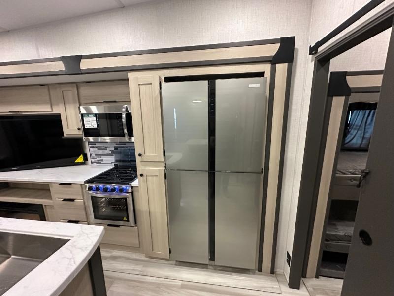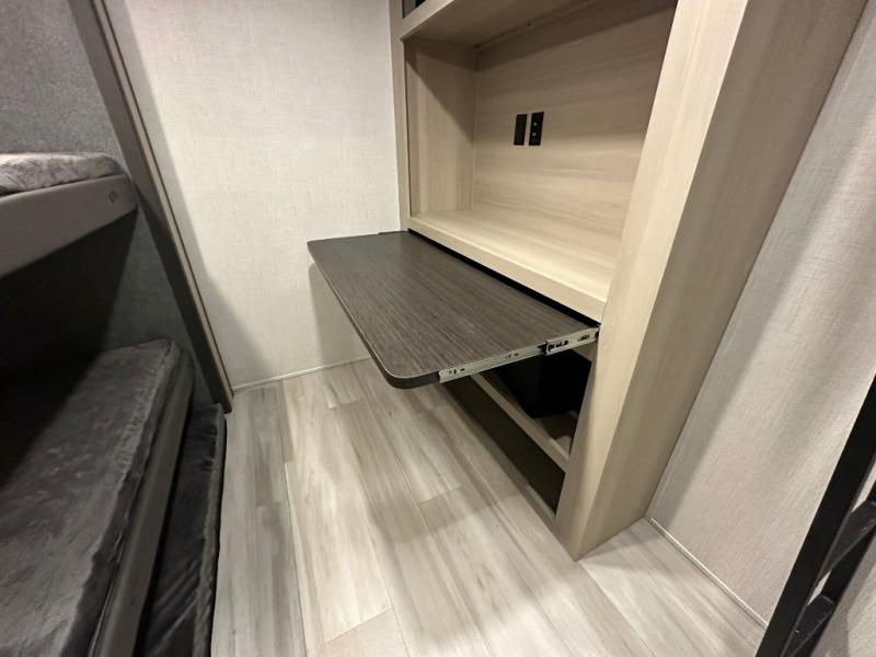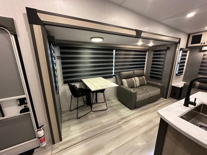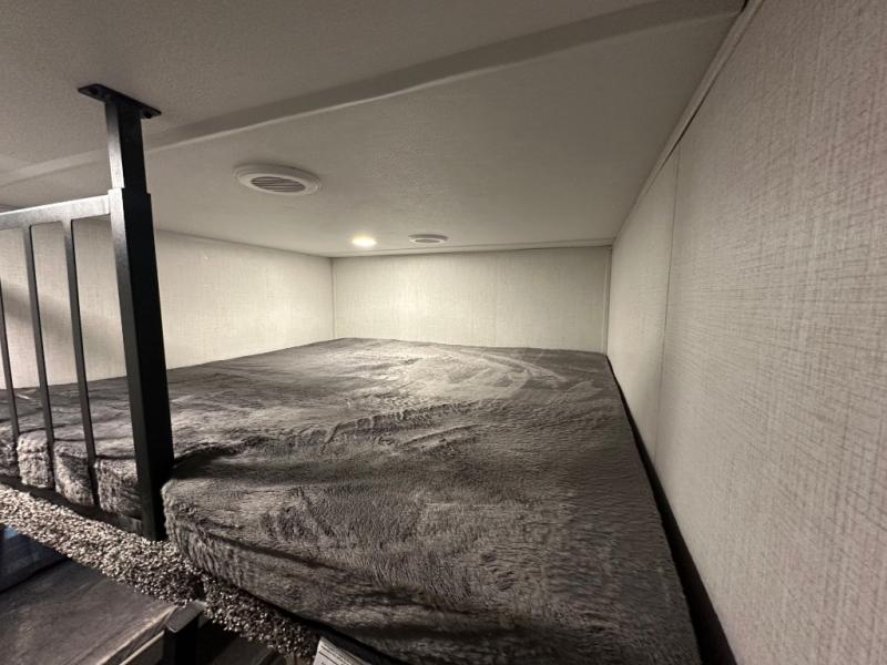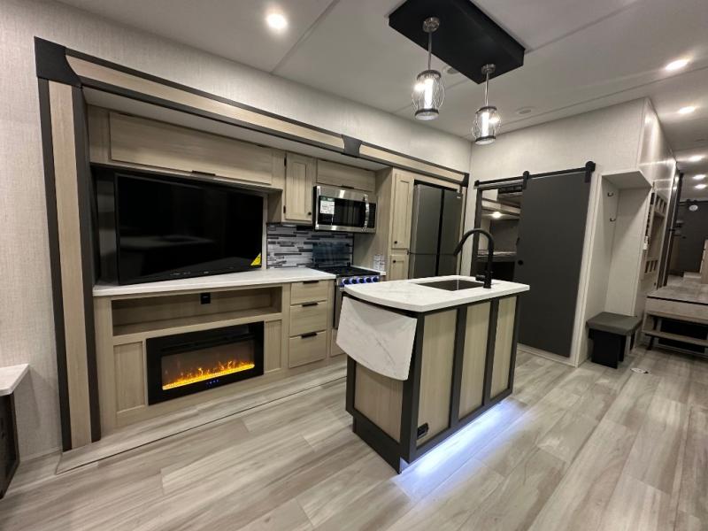 Wow! You won't believe the features found in this luxury fifth wheel that can sleep up to nine each night! Your guests or the kids will absolutely love the middle bunkroom with triple bunks and a loft above for even more sleeping or storage space. There is also a pull-out desk here, which will allow you to utilize this space as an office as well! You'll have your own space in the front private bedroom on the king bed slide out, and there is a walk-in wardrobe to keep your clothes tidy. There is even washer and dryer prep for the option to keep those clothes clean! The chef of your group will have everything they need to prepare meals, including a 21" 2-in-1 oven range, an over-the-range microwave, a 16 cu. ft. 12V refrigerator, plus a kitchen island for more counter space. In the evenings, your crew can get cozy on the rear sofa and theater seats across from the entertainment center and fireplace, or you might just play a game at the hi-top table and chairs!