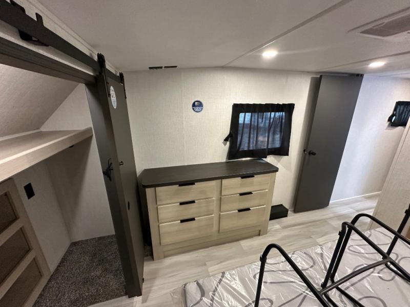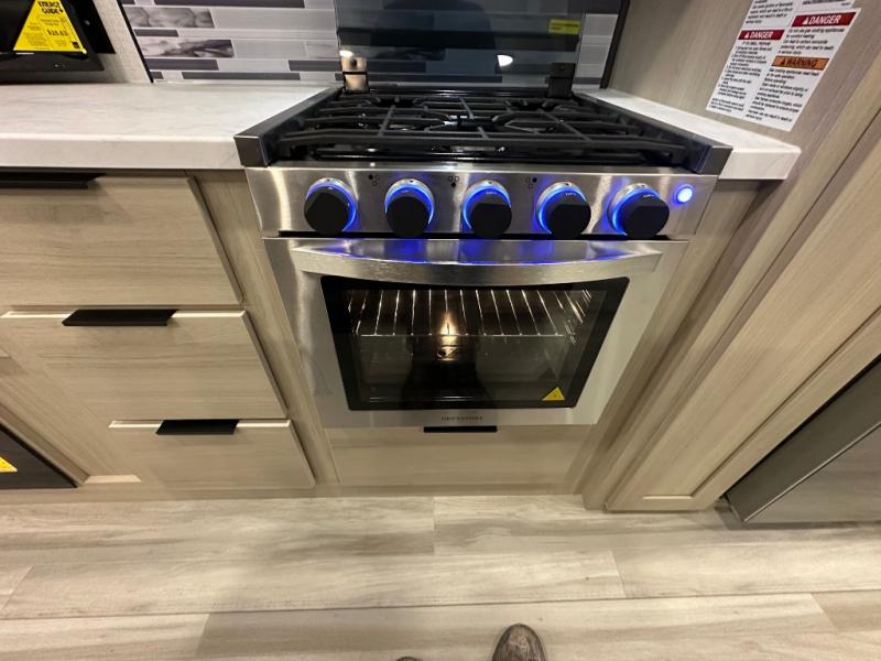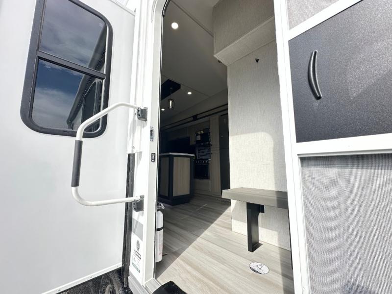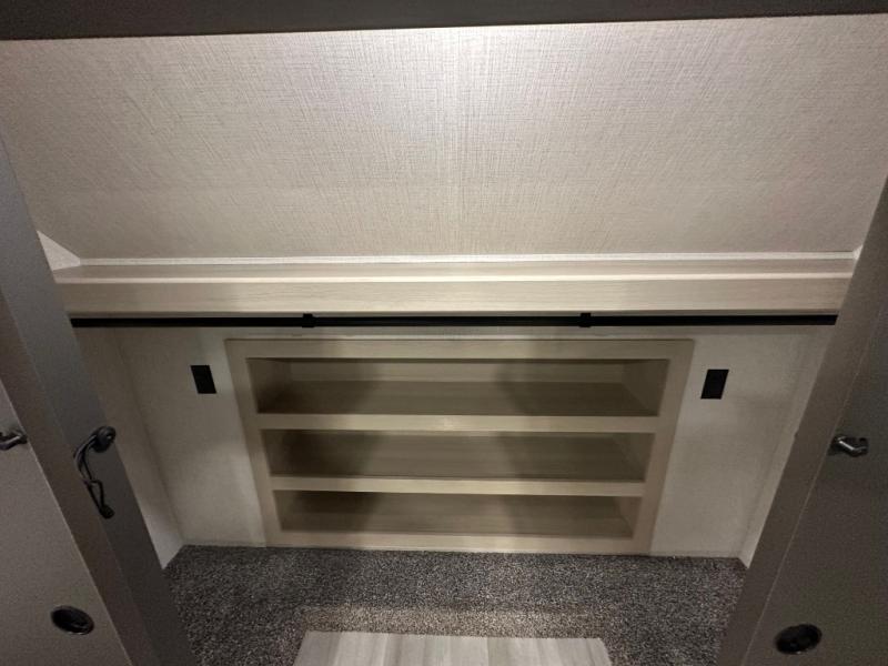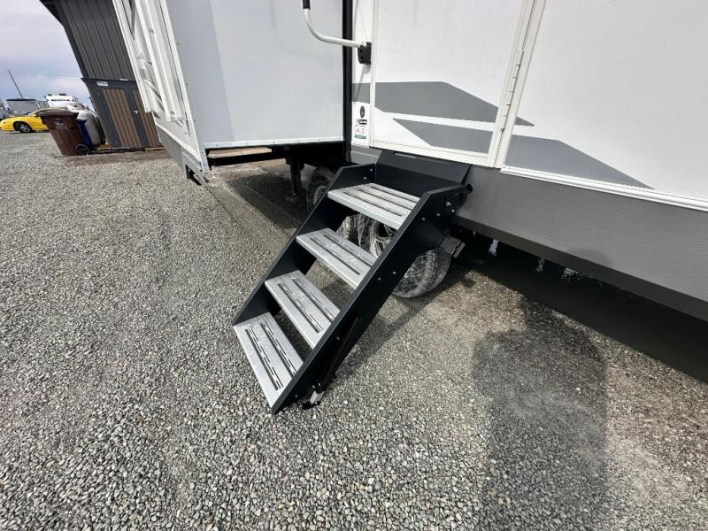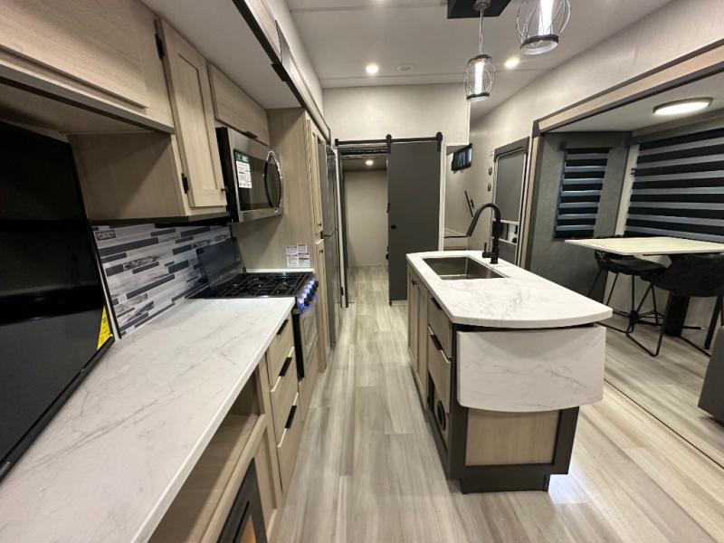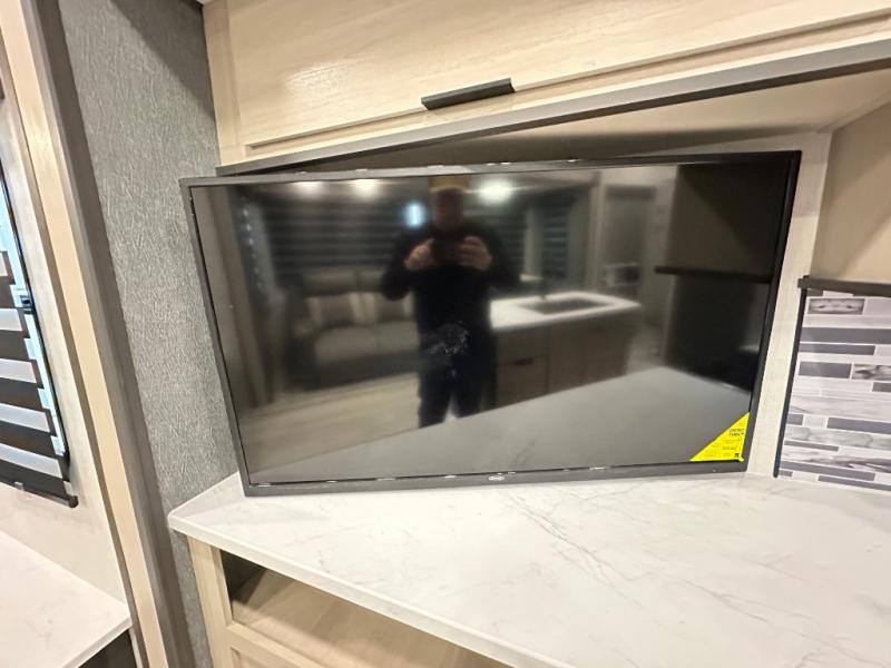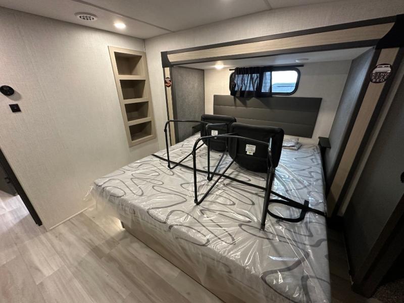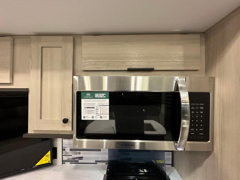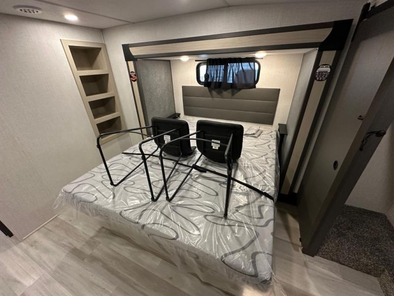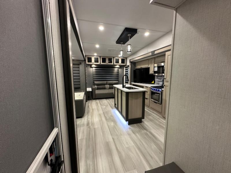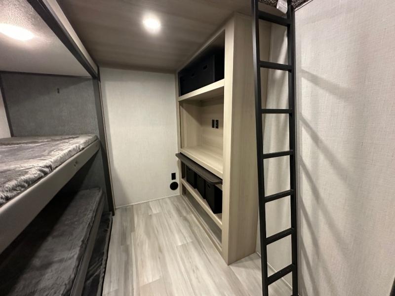 Wow! You won't believe the features found in this luxury fifth wheel that can sleep up to nine each night! Your guests or the kids will absolutely love the middle bunkroom with triple bunks and a loft above for even more sleeping or storage space. There is also a pull-out desk here, which will allow you to utilize this space as an office as well! You'll have your own space in the front private bedroom on the king bed slide out, and there is a walk-in wardrobe to keep your clothes tidy. There is even washer and dryer prep for the option to keep those clothes clean! The chef of your group will have everything they need to prepare meals, including a 21" 2-in-1 oven range, an over-the-range microwave, a 16 cu. ft. 12V refrigerator, plus a kitchen island for more counter space. In the evenings, your crew can get cozy on the rear sofa and theater seats across from the entertainment center and fireplace, or you might just play a game at the hi-top table and chairs!