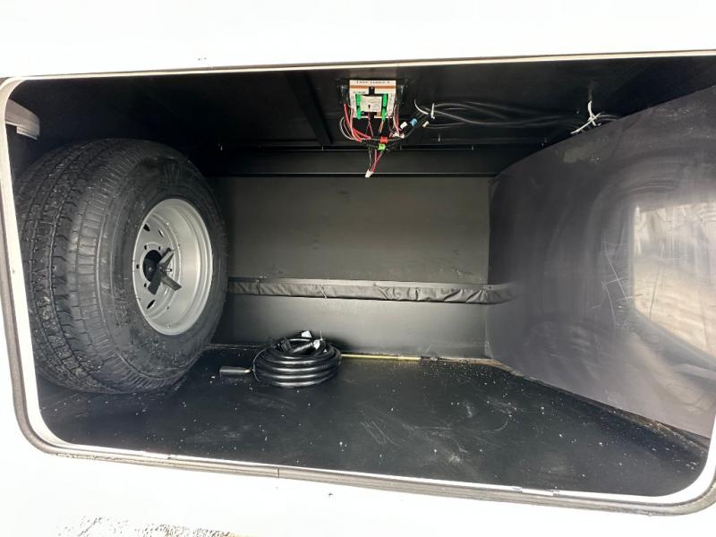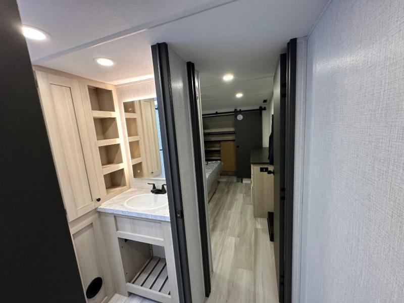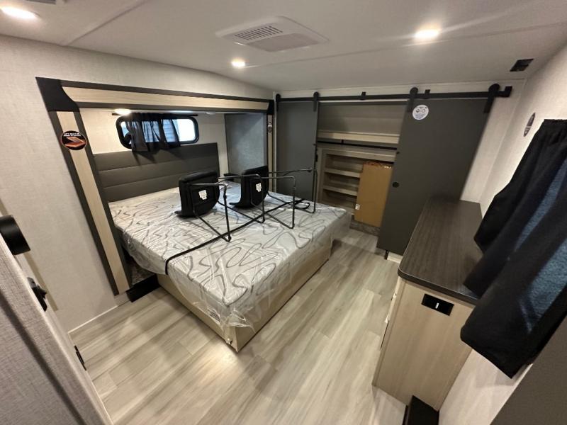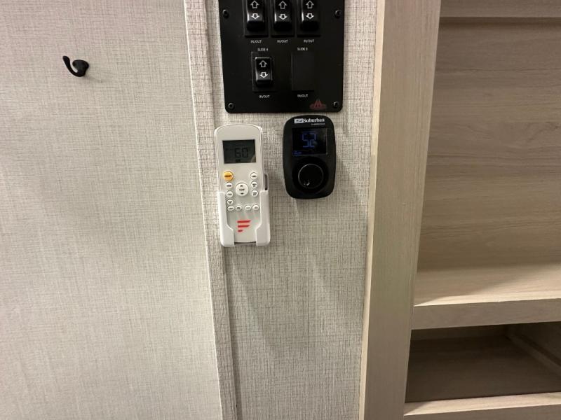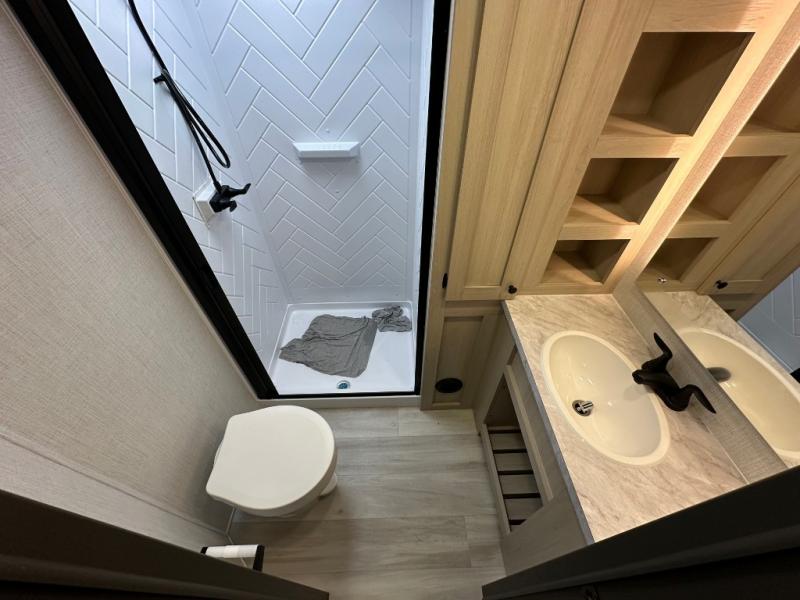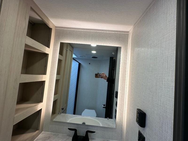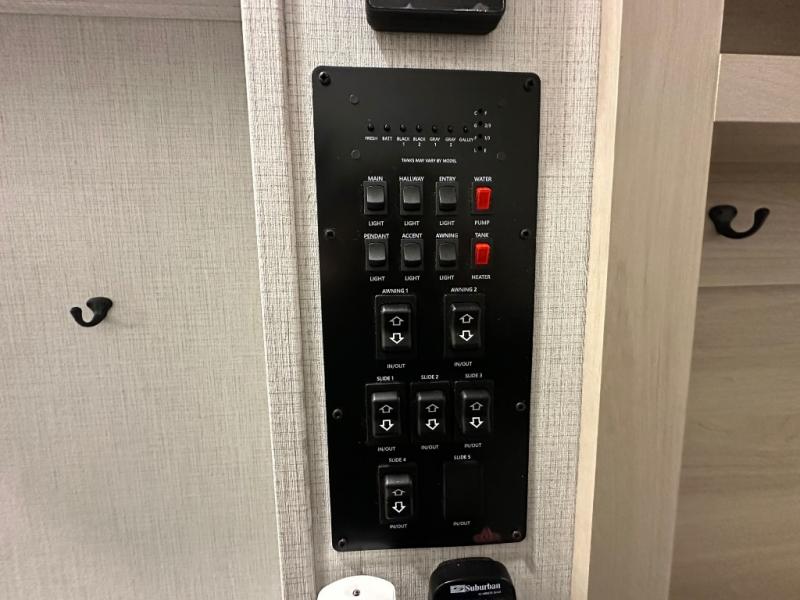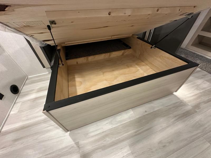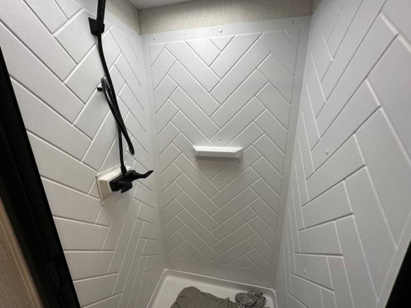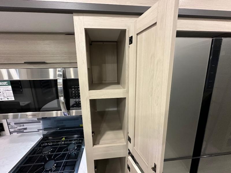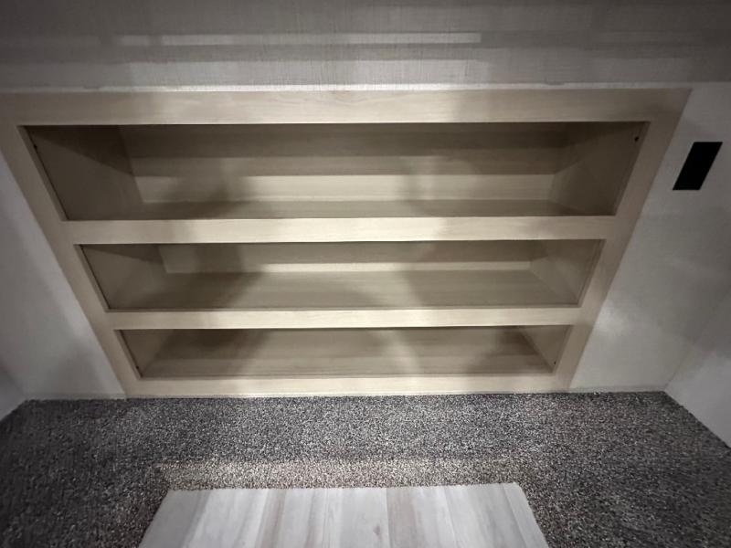 Wow! You won't believe the features found in this luxury fifth wheel that can sleep up to nine each night! Your guests or the kids will absolutely love the middle bunkroom with triple bunks and a loft above for even more sleeping or storage space. There is also a pull-out desk here, which will allow you to utilize this space as an office as well! You'll have your own space in the front private bedroom on the king bed slide out, and there is a walk-in wardrobe to keep your clothes tidy. There is even washer and dryer prep for the option to keep those clothes clean! The chef of your group will have everything they need to prepare meals, including a 21" 2-in-1 oven range, an over-the-range microwave, a 16 cu. ft. 12V refrigerator, plus a kitchen island for more counter space. In the evenings, your crew can get cozy on the rear sofa and theater seats across from the entertainment center and fireplace, or you might just play a game at the hi-top table and chairs!