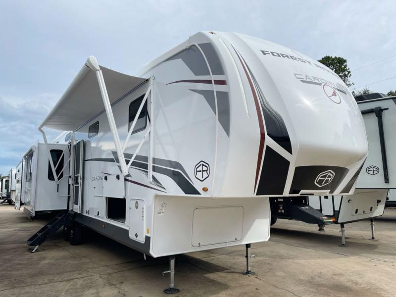 With any Cardinal fifth wheel by Forest River you will enjoy affordable luxury at every turn. These models are constructed with residential fiberglass insulation in the roof and floor, a sectioned ABS plastic underbelly armor, and a vacuum bonded, welded aluminum structure for added strength and durability. You will also find seamless roto-cast holding tanks, an outdoor shower, and 4-point auto leveling for quick and easy setup. There are carpet-free living spaces, residential backsplash, motion lighting throughout, and many more comforts!