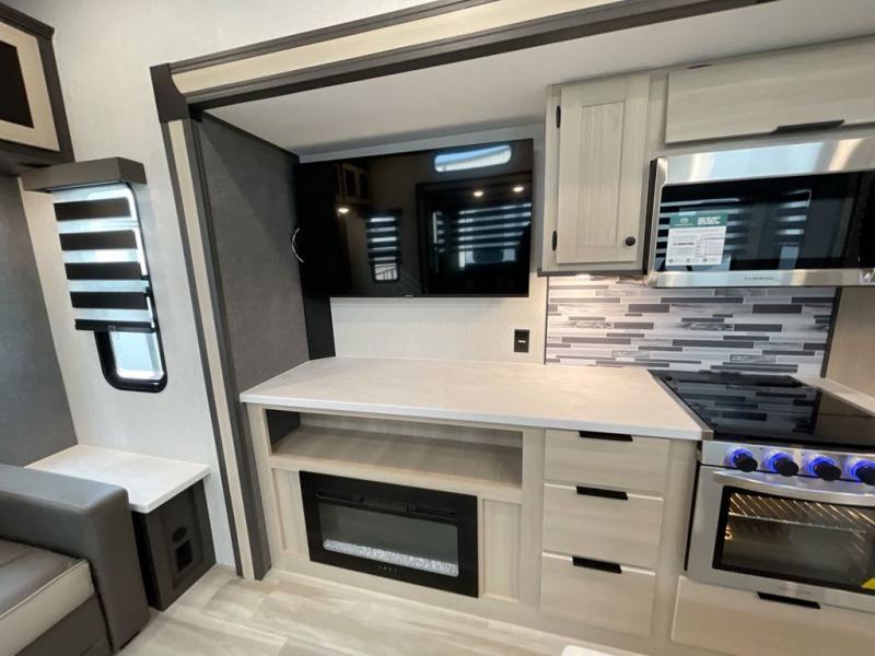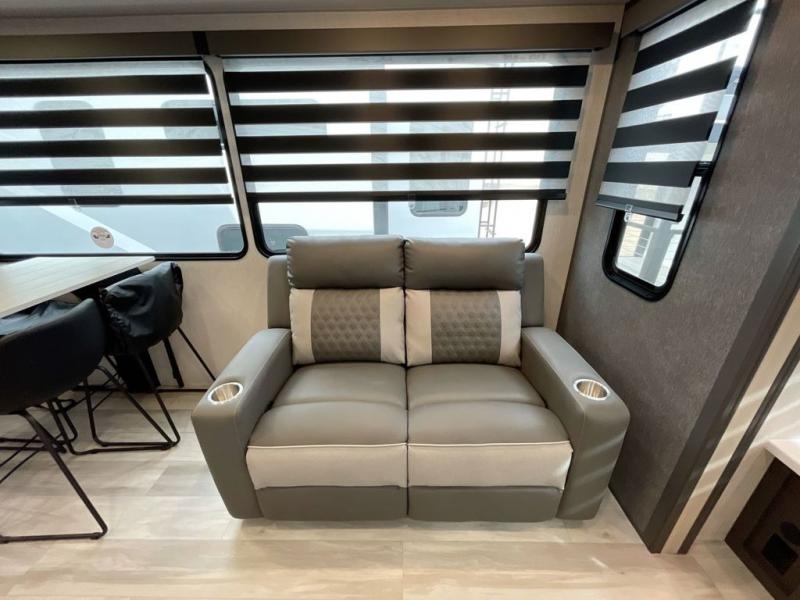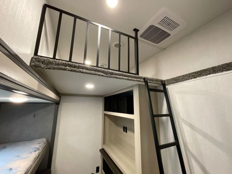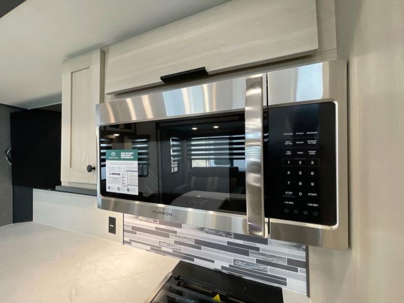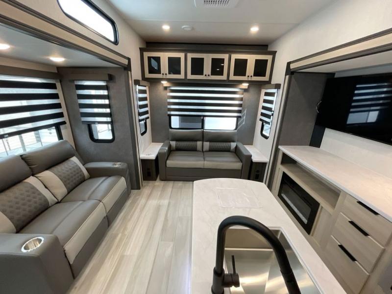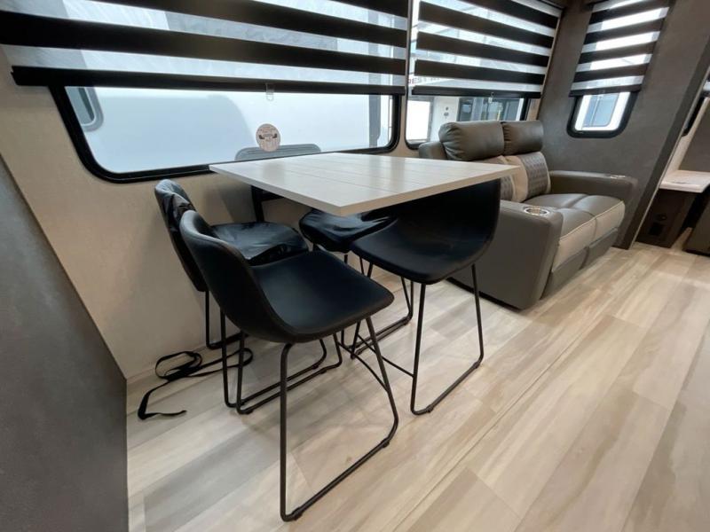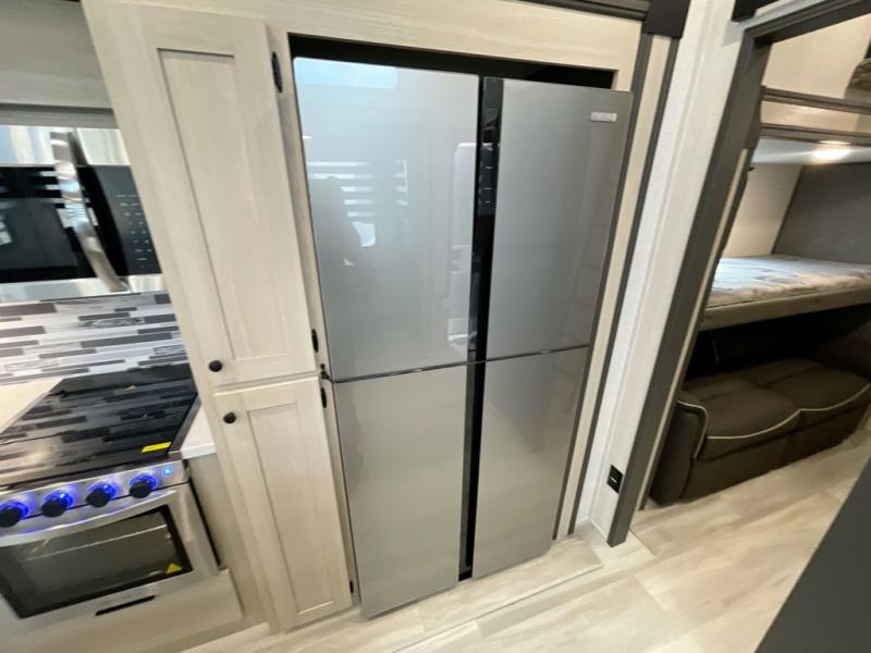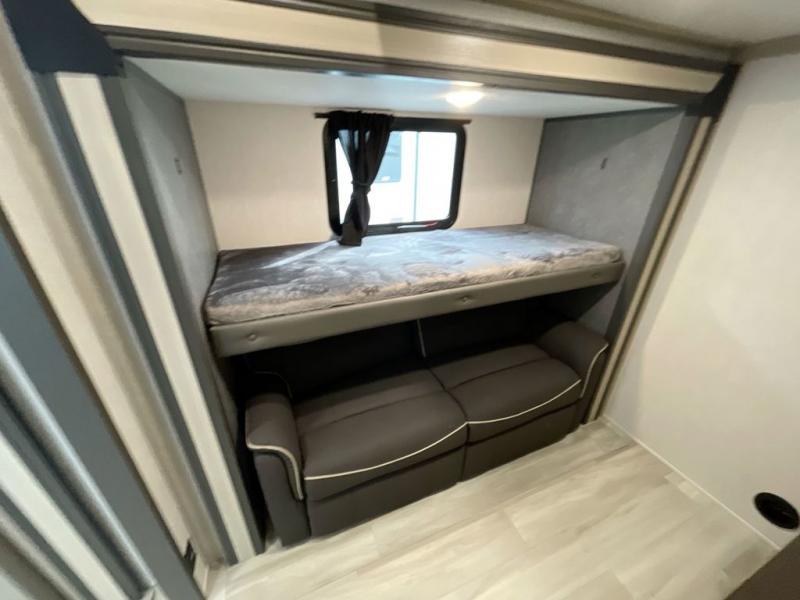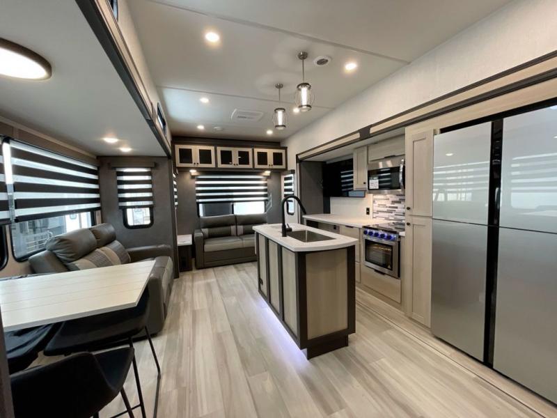 Wow! You won't believe the features found in this luxury fifth wheel that can sleep up to nine each night! Your guests or the kids will absolutely love the middle bunkroom with a hide-a-bed sofa and bunk beds plus a loft above for even more sleeping or storage space. There is also a desk/wardrobe here, which will allow you to utilize this space as an office as well! You'll have your own space in the front private bedroom on the king bed slide out, and there is a walk-in wardrobe to keep your clothes tidy. There is even washer and dryer prep for the option to keep those clothes clean! The chef of your group will have everything they need to prepare meals, including a 21" 2-in-1 oven range, an over-the-range microwave, a 16 cu. ft. 12V refrigerator, plus a kitchen island for more counter space. In the evenings, your crew can get cozy on the rear sofa and theater seats across from the entertainment center and fireplace, or you might just play a game at the hi-top table and chairs!