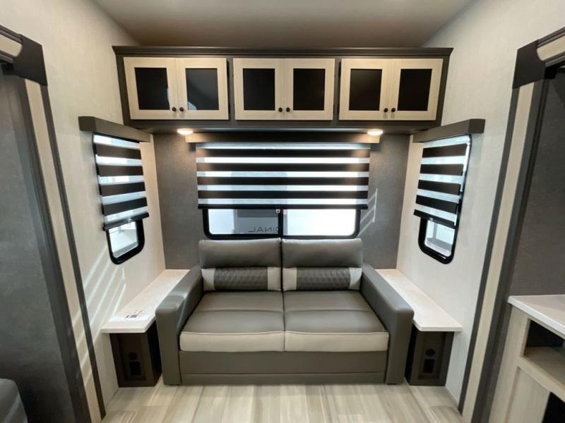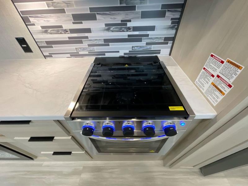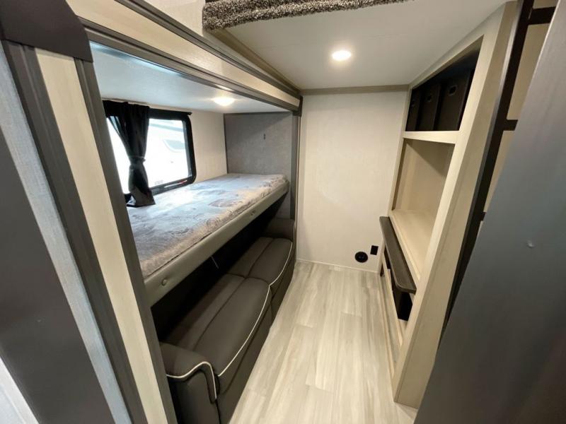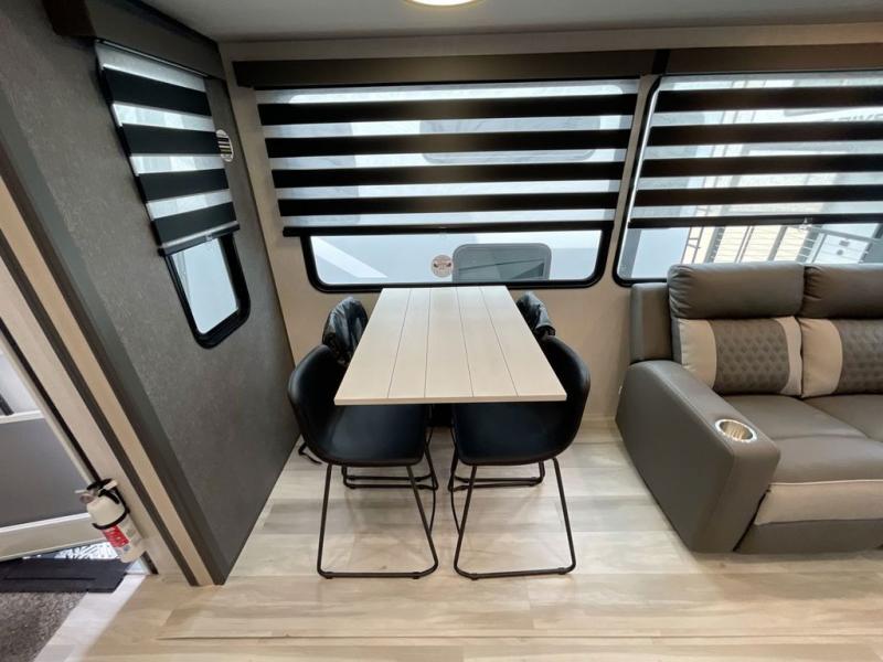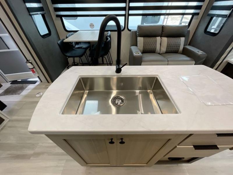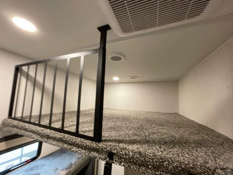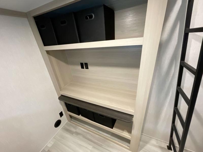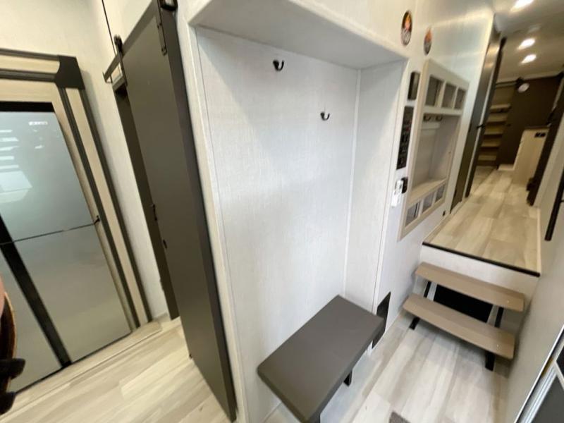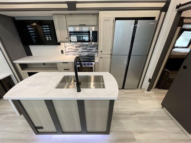 Wow! You won't believe the features found in this luxury fifth wheel that can sleep up to nine each night! Your guests or the kids will absolutely love the middle bunkroom with a hide-a-bed sofa and bunk beds plus a loft above for even more sleeping or storage space. There is also a desk/wardrobe here, which will allow you to utilize this space as an office as well! You'll have your own space in the front private bedroom on the king bed slide out, and there is a walk-in wardrobe to keep your clothes tidy. There is even washer and dryer prep for the option to keep those clothes clean! The chef of your group will have everything they need to prepare meals, including a 21" 2-in-1 oven range, an over-the-range microwave, a 16 cu. ft. 12V refrigerator, plus a kitchen island for more counter space. In the evenings, your crew can get cozy on the rear sofa and theater seats across from the entertainment center and fireplace, or you might just play a game at the hi-top table and chairs!