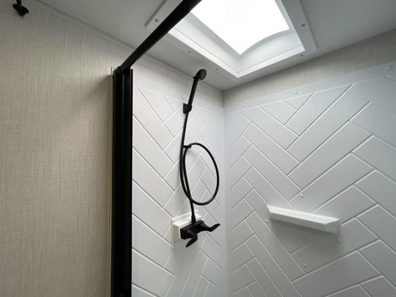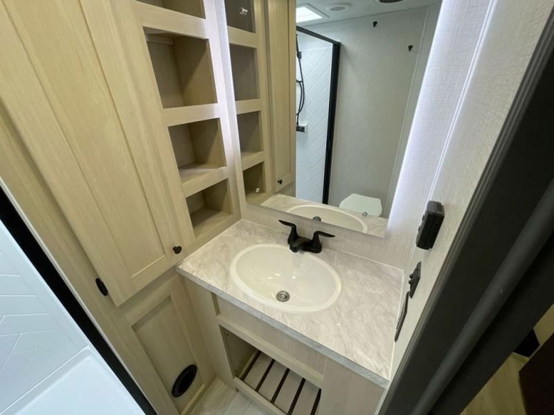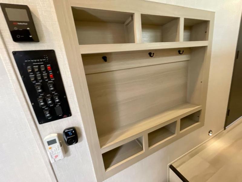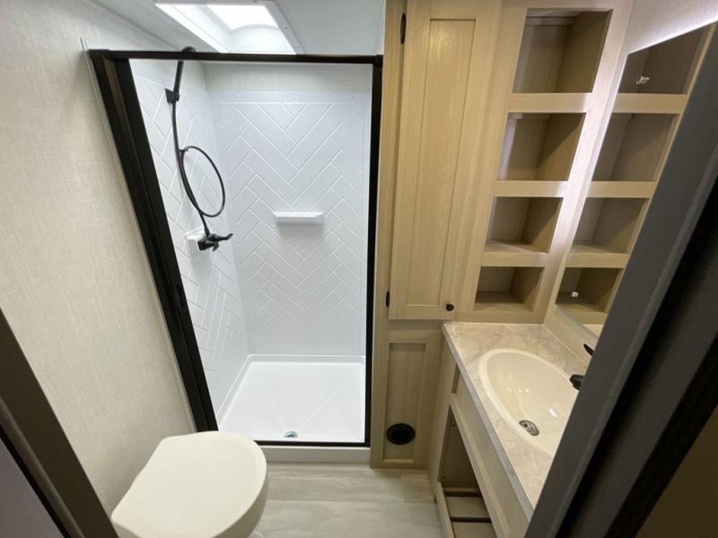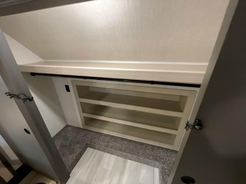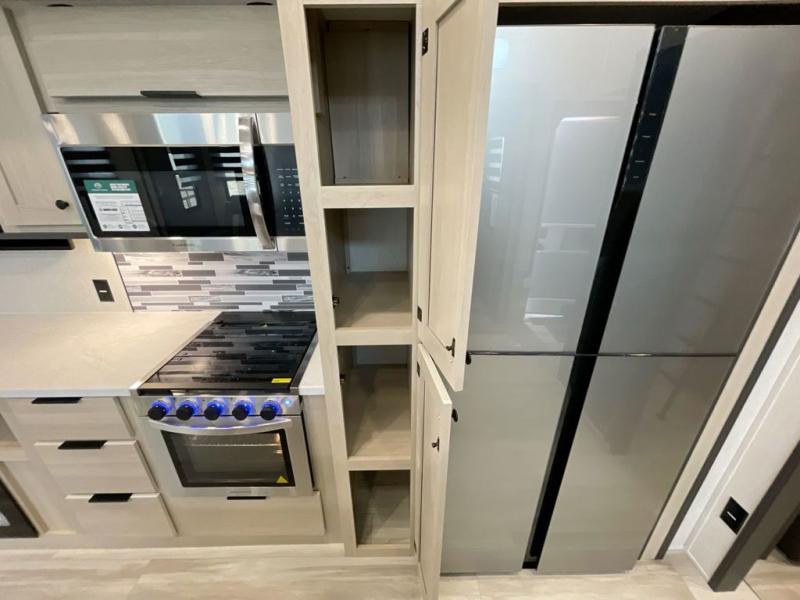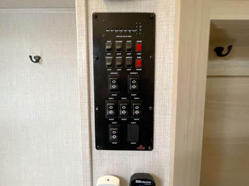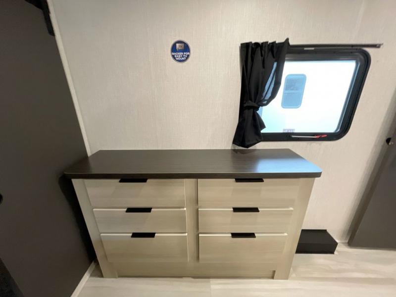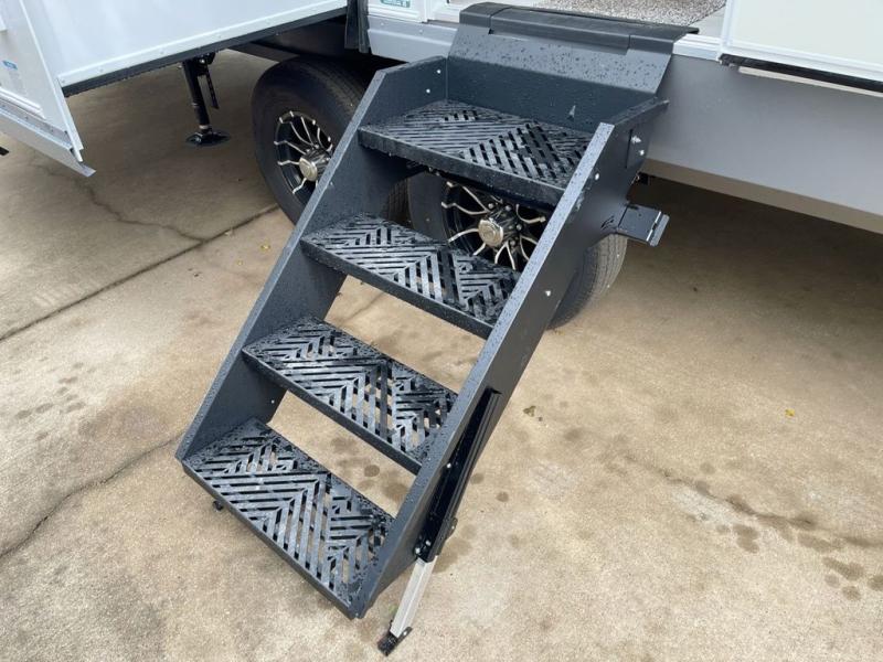 Wow! You won't believe the features found in this luxury fifth wheel that can sleep up to nine each night! Your guests or the kids will absolutely love the middle bunkroom with a hide-a-bed sofa and bunk beds plus a loft above for even more sleeping or storage space. There is also a desk/wardrobe here, which will allow you to utilize this space as an office as well! You'll have your own space in the front private bedroom on the king bed slide out, and there is a walk-in wardrobe to keep your clothes tidy. There is even washer and dryer prep for the option to keep those clothes clean! The chef of your group will have everything they need to prepare meals, including a 21" 2-in-1 oven range, an over-the-range microwave, a 16 cu. ft. 12V refrigerator, plus a kitchen island for more counter space. In the evenings, your crew can get cozy on the rear sofa and theater seats across from the entertainment center and fireplace, or you might just play a game at the hi-top table and chairs!