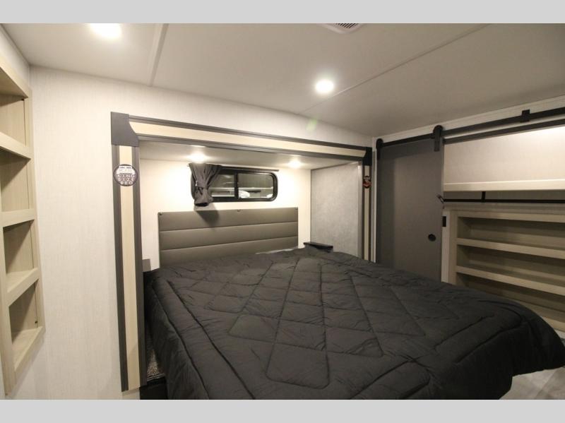 Wow! You won't believe the features found in this luxury fifth wheel that can sleep up to nine each night! Your guests or the kids will absolutely love the middle bunkroom with a hide-a-bed sofa and bunk beds plus a loft above for even more sleeping or storage space. There is also a desk/wardrobe here, which will allow you to utilize this space as an office as well! You'll have your own space in the front private bedroom on the king bed slide out, and there is a walk-in wardrobe to keep your clothes tidy. There is even washer and dryer prep for the option to keep those clothes clean! The chef of your group will have everything they need to prepare meals, including a 21" 2-in-1 oven range, an over-the-range microwave, a 16 cu. ft. 12V refrigerator, plus a kitchen island for more counter space. In the evenings, your crew can get cozy on the rear sofa and theater seats across from the entertainment center and fireplace, or you might just play a game at the hi-top table and chairs!