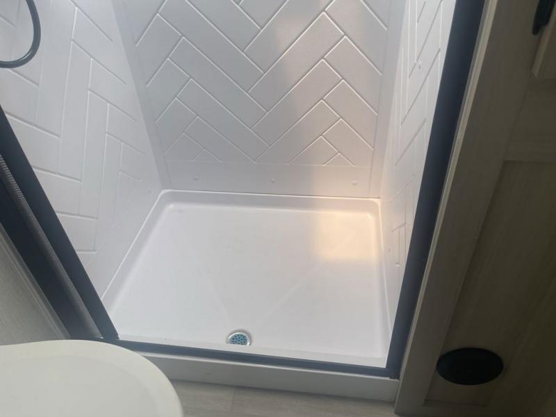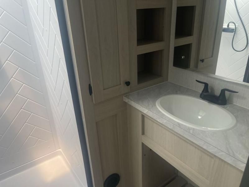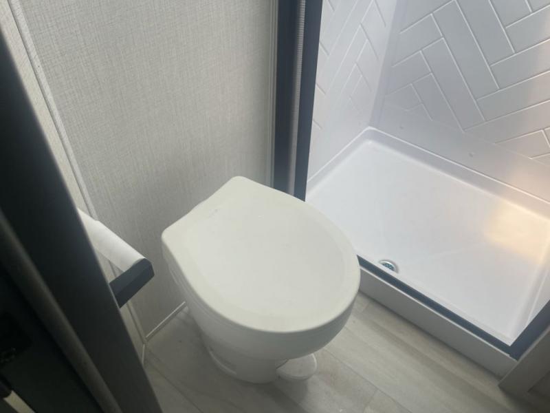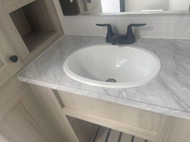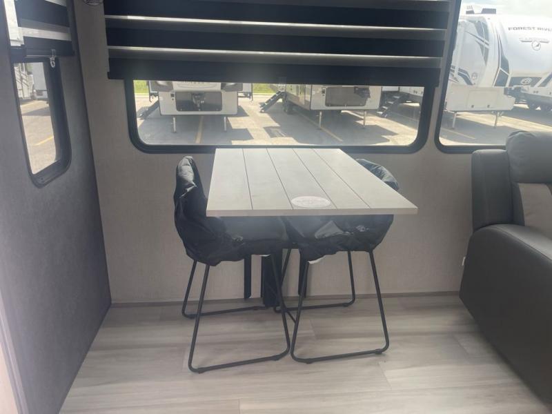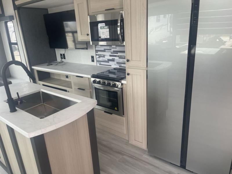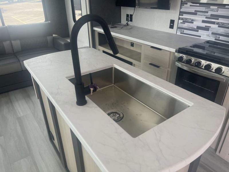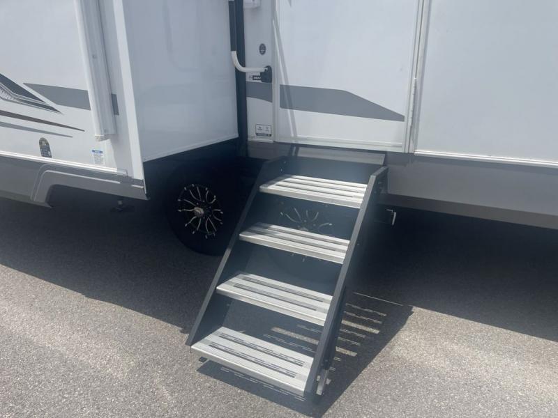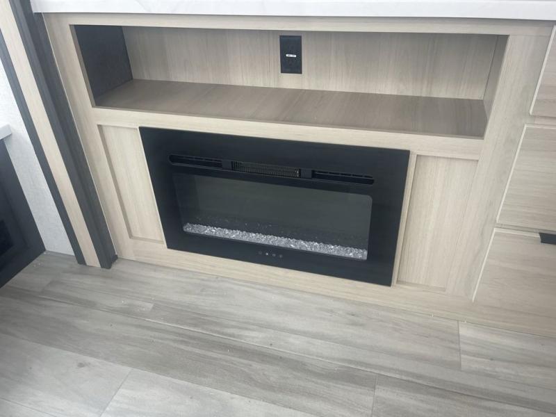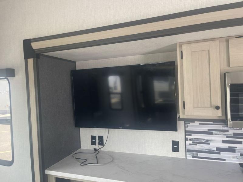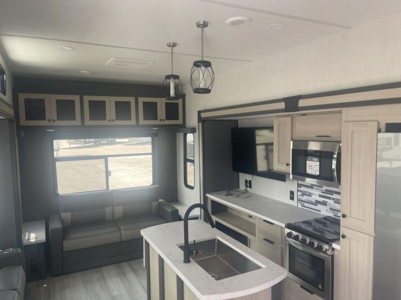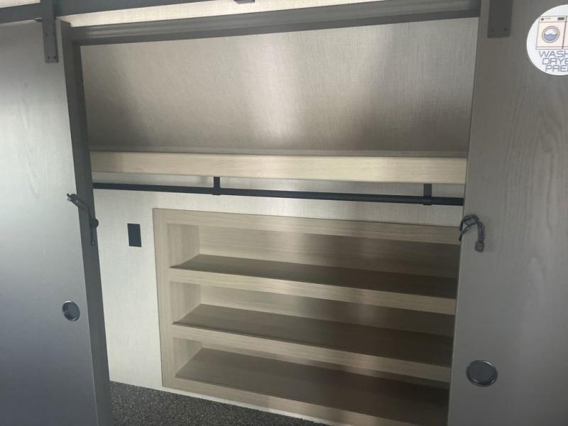 Wow! You won't believe the features found in this luxury fifth wheel that can sleep up to nine each night! Your guests or the kids will absolutely love the middle bunkroom with a hide-a-bed sofa and bunk beds plus a loft above for even more sleeping or storage space. There is also a desk/wardrobe here, which will allow you to utilize this space as an office as well! You'll have your own space in the front private bedroom on the king bed slide out, and there is a walk-in wardrobe to keep your clothes tidy. There is even washer and dryer prep for the option to keep those clothes clean! The chef of your group will have everything they need to prepare meals, including a 21" 2-in-1 oven range, an over-the-range microwave, a 16 cu. ft. 12V refrigerator, plus a kitchen island for more counter space. In the evenings, your crew can get cozy on the rear sofa and theater seats across from the entertainment center and fireplace, or you might just play a game at the hi-top table and chairs!