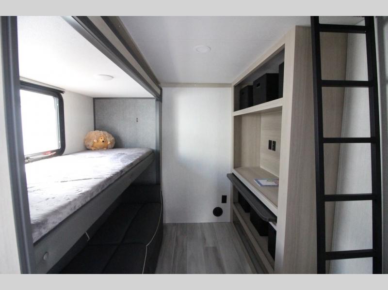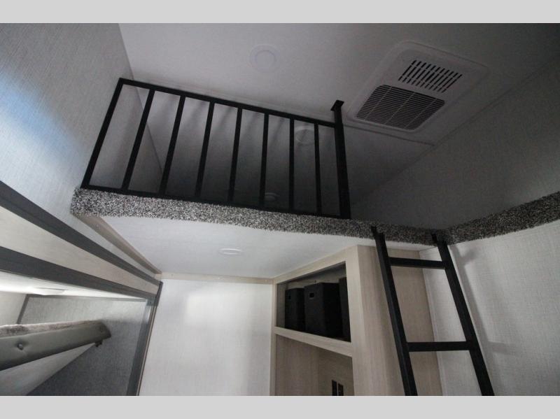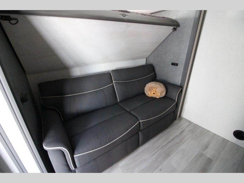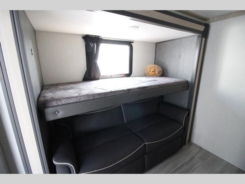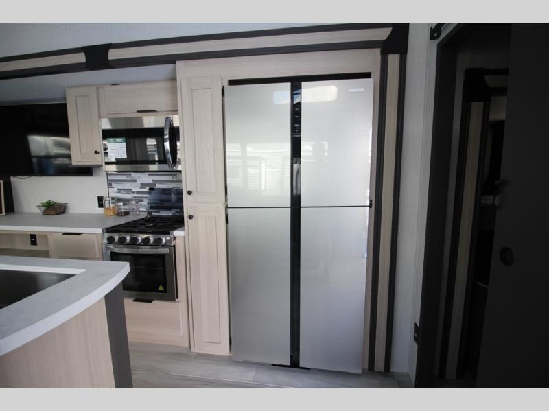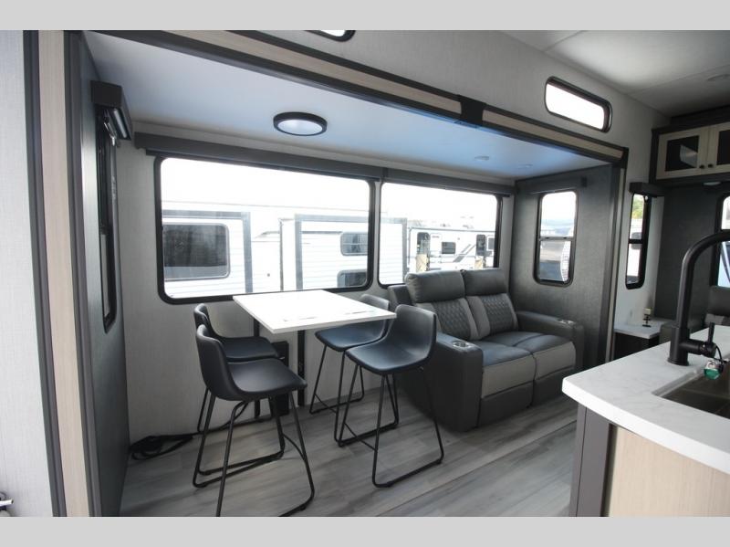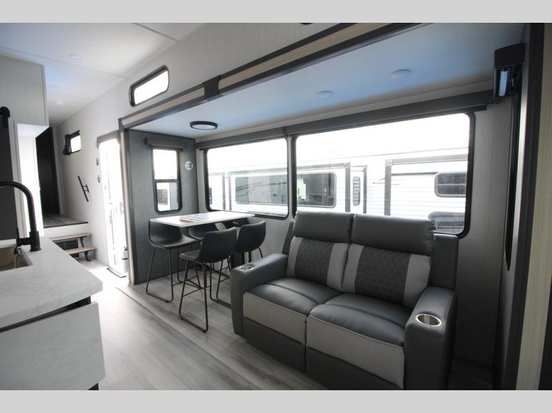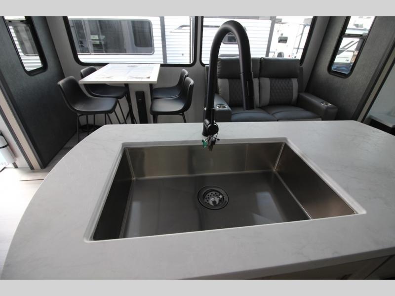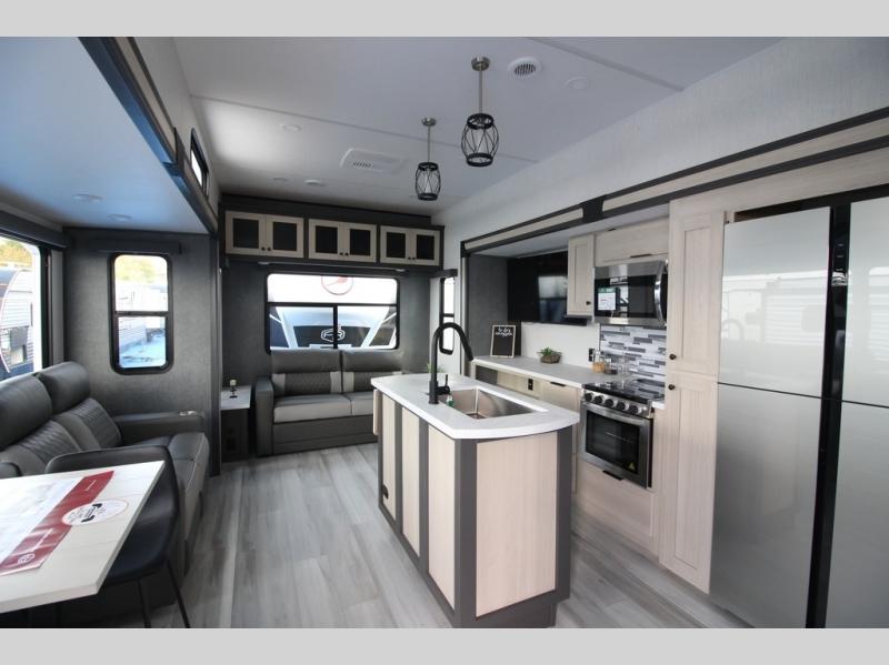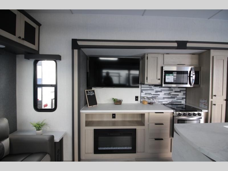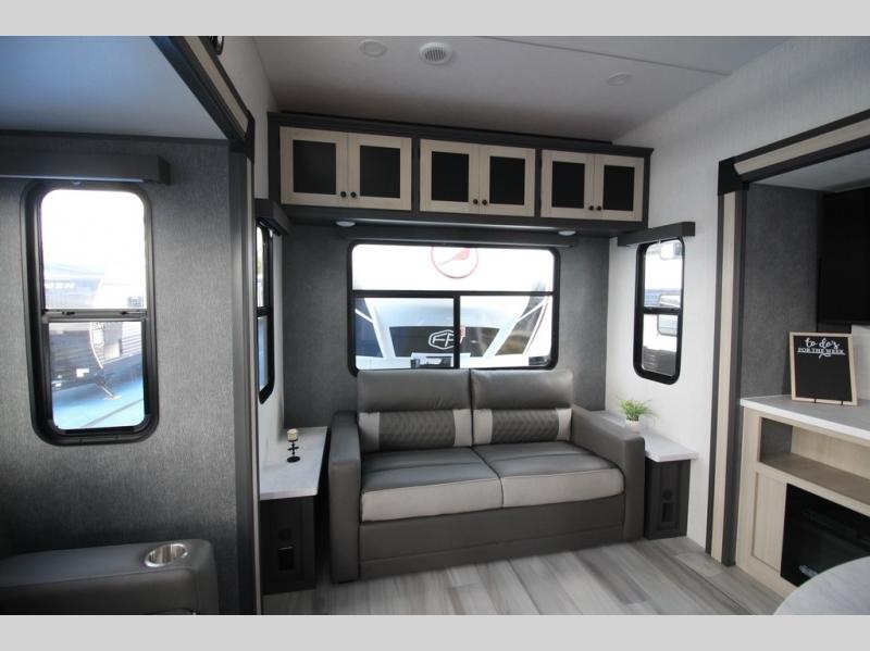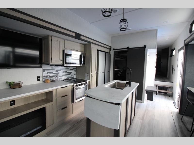 Wow! You won't believe the features found in this luxury fifth wheel that can sleep up to nine each night! Your guests or the kids will absolutely love the middle bunkroom with a hide-a-bed sofa and bunk beds plus a loft above for even more sleeping or storage space. There is also a desk/wardrobe here, which will allow you to utilize this space as an office as well! You'll have your own space in the front private bedroom on the king bed slide out, and there is a walk-in wardrobe to keep your clothes tidy. There is even washer and dryer prep for the option to keep those clothes clean! The chef of your group will have everything they need to prepare meals, including a 21" 2-in-1 oven range, an over-the-range microwave, a 16 cu. ft. 12V refrigerator, plus a kitchen island for more counter space. In the evenings, your crew can get cozy on the rear sofa and theater seats across from the entertainment center and fireplace, or you might just play a game at the hi-top table and chairs!