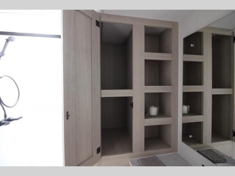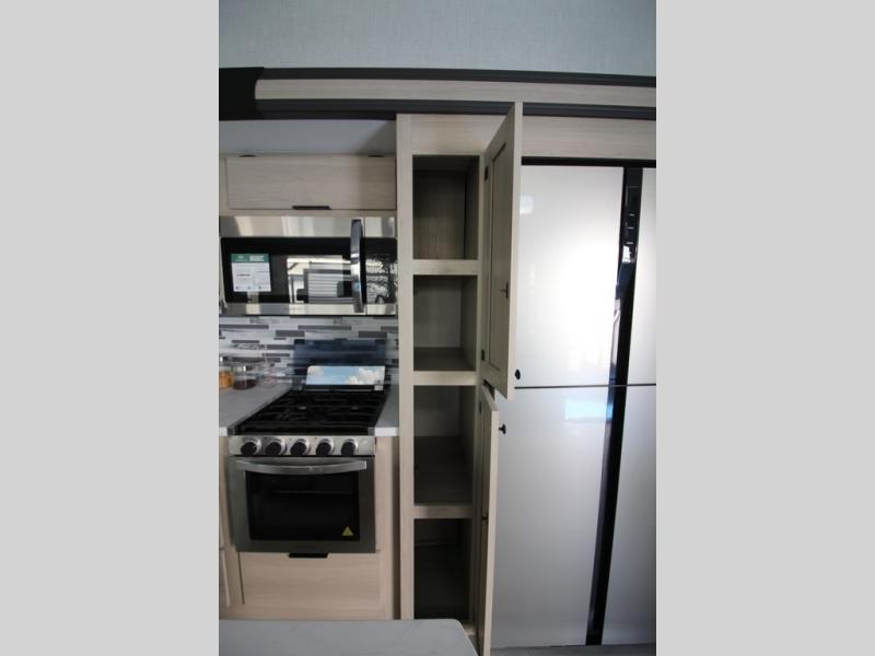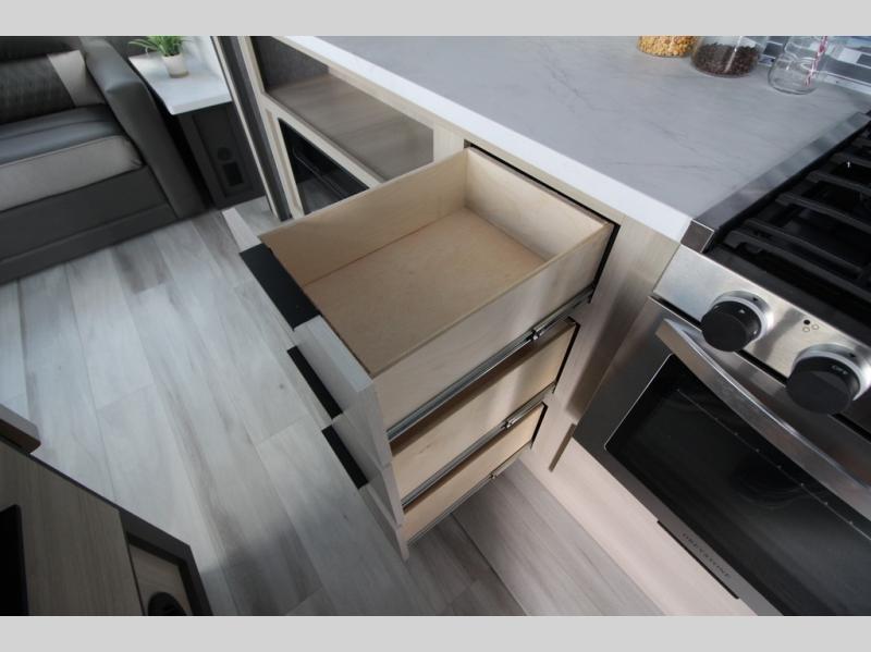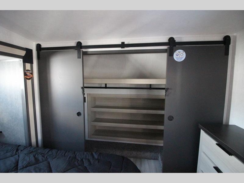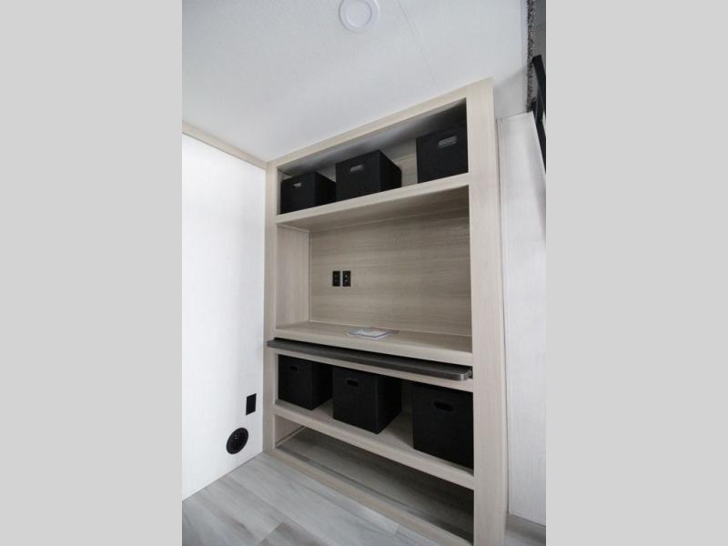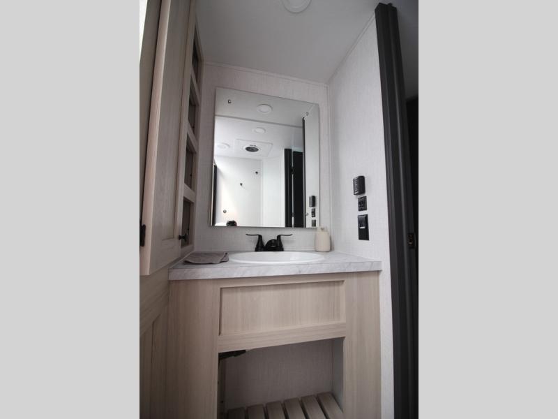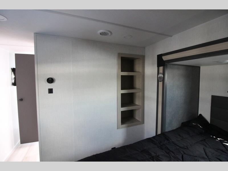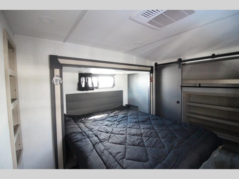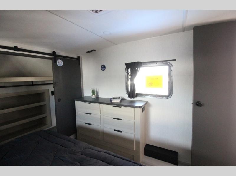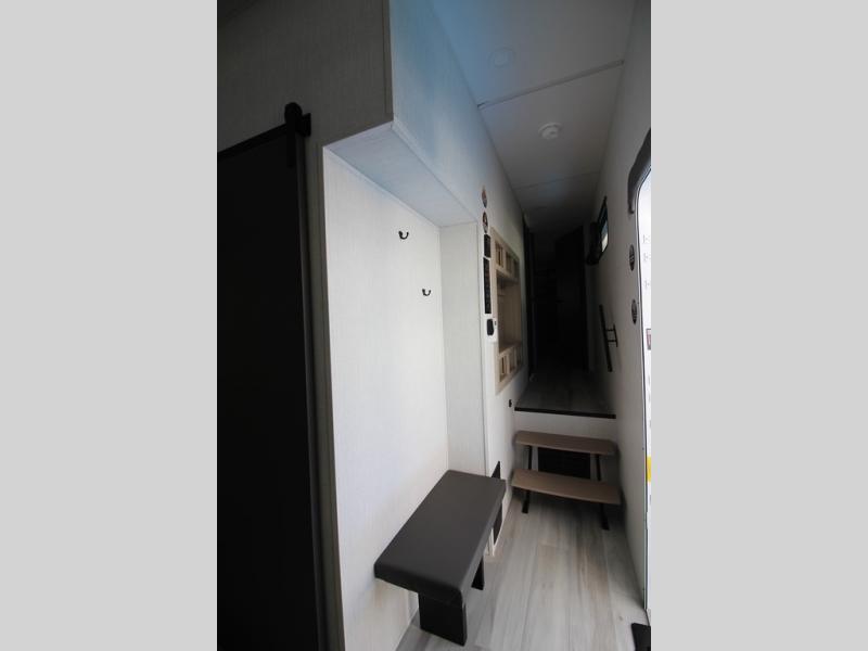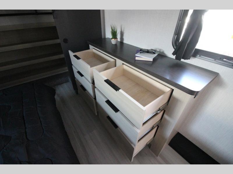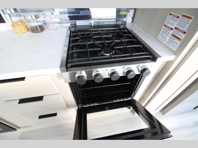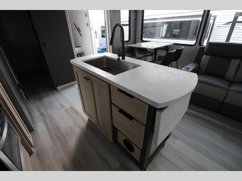 Wow! You won't believe the features found in this luxury fifth wheel that can sleep up to nine each night! Your guests or the kids will absolutely love the middle bunkroom with a hide-a-bed sofa and bunk beds plus a loft above for even more sleeping or storage space. There is also a desk/wardrobe here, which will allow you to utilize this space as an office as well! You'll have your own space in the front private bedroom on the king bed slide out, and there is a walk-in wardrobe to keep your clothes tidy. There is even washer and dryer prep for the option to keep those clothes clean! The chef of your group will have everything they need to prepare meals, including a 21" 2-in-1 oven range, an over-the-range microwave, a 16 cu. ft. 12V refrigerator, plus a kitchen island for more counter space. In the evenings, your crew can get cozy on the rear sofa and theater seats across from the entertainment center and fireplace, or you might just play a game at the hi-top table and chairs!