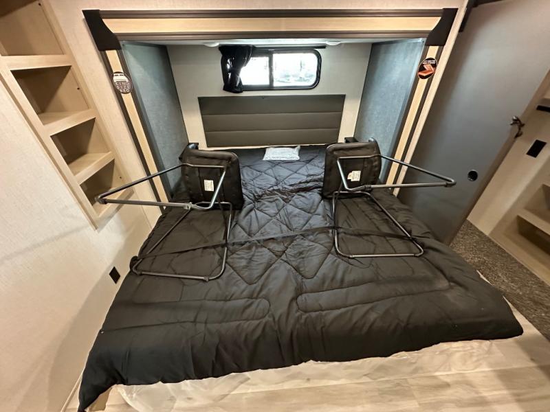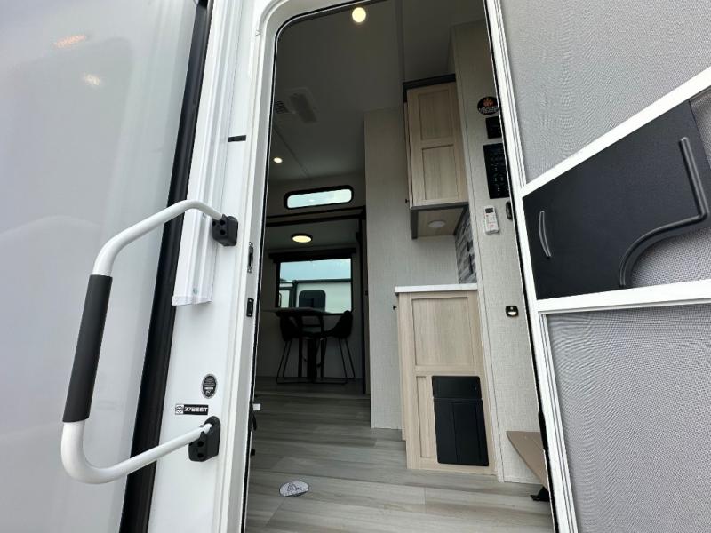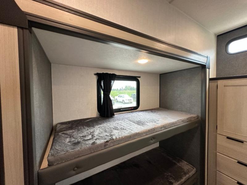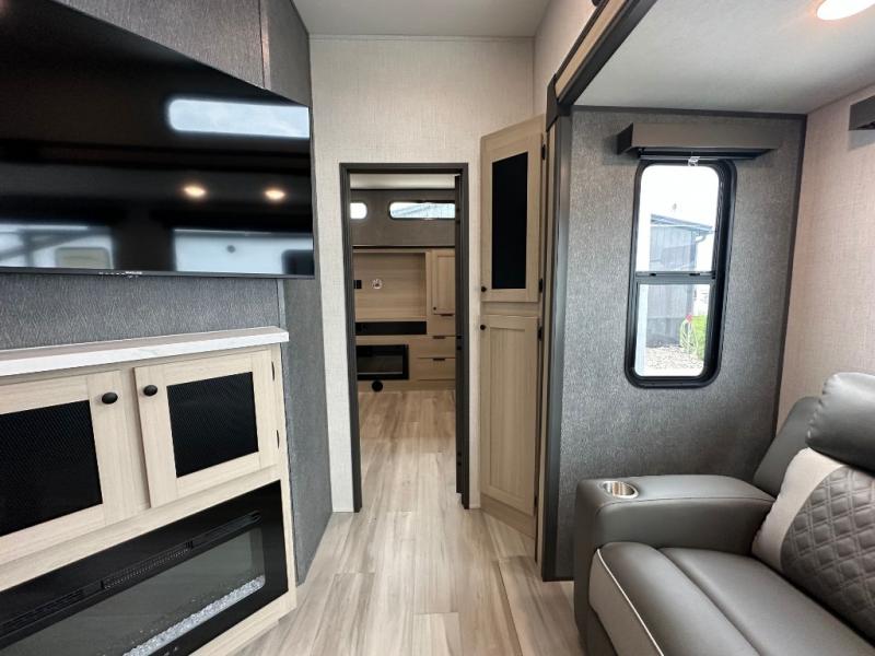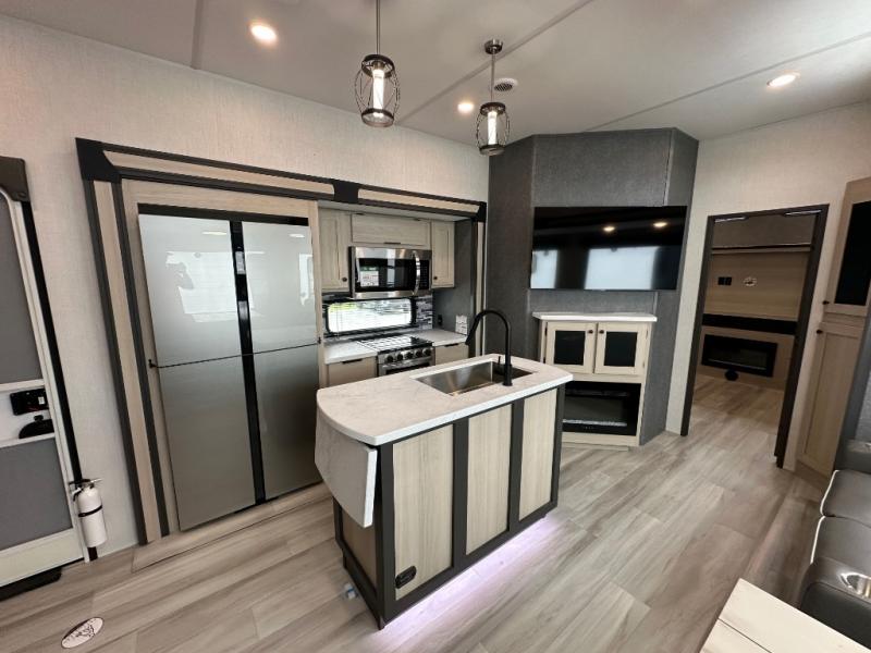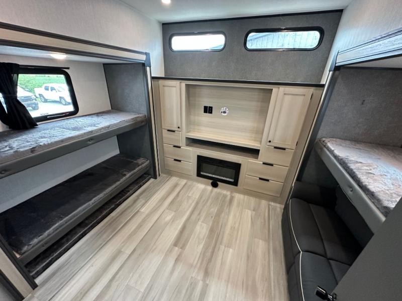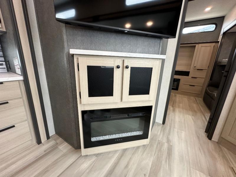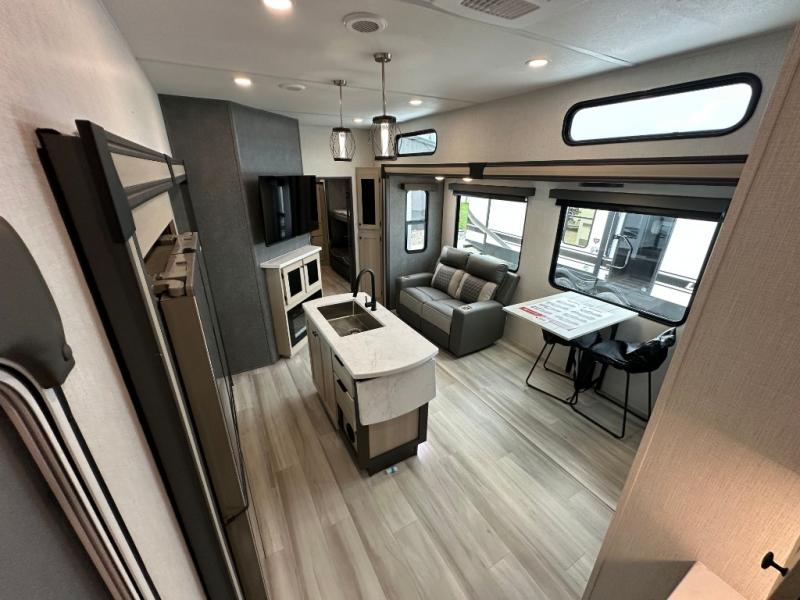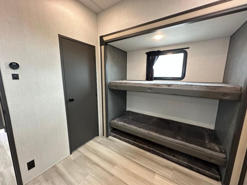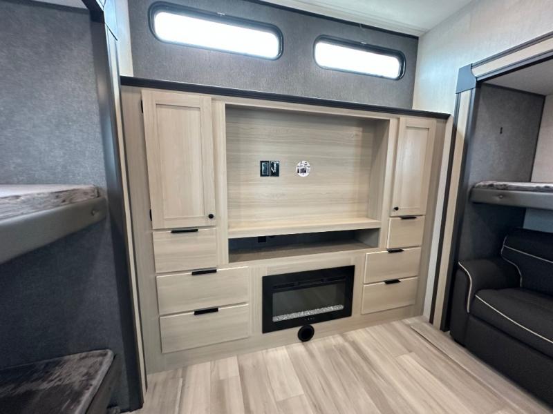 This fifth wheel's name describes it perfectly; it's the best! Your guests will love the rear private bunkhouse with dual opposing slides, bunk beds, plus a hide-a-bed sofa and an entertainment center with dual wardrobes. There is even a half bath with its own exterior entry door! You will have the front private bedroom all to yourselves with a king bed slide out and a walk-in wardrobe with washer and dryer prep. And the full bath is close by for easy nighttime use. The combined middle kitchen and living room will be a space everyone can meet in since there is a hi-top table and chairs and theater seating, an entertainment center with a fireplace, plus a kitchen island where snacks can be set out.