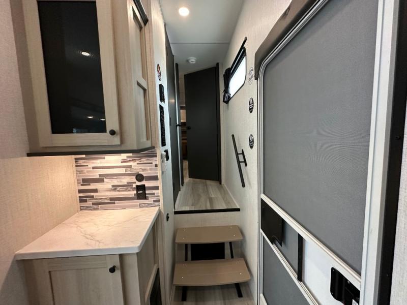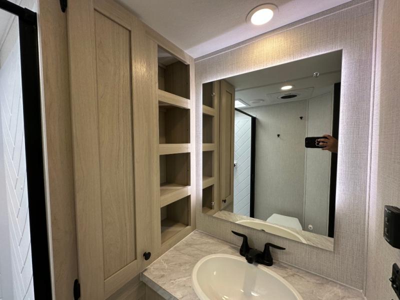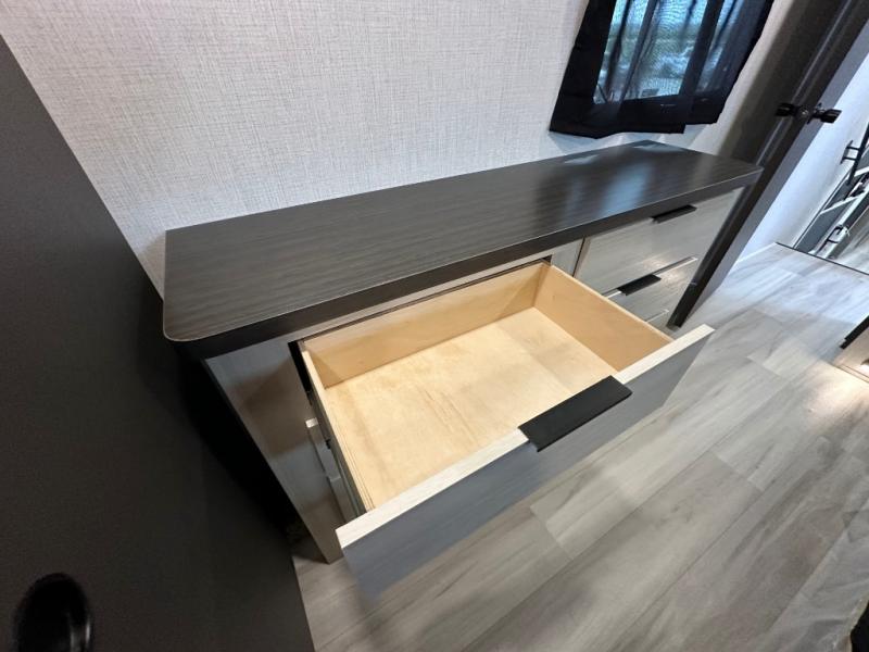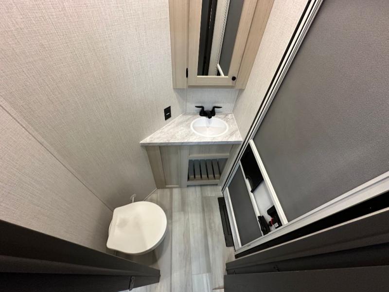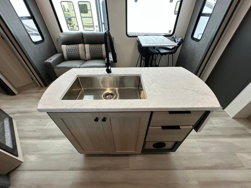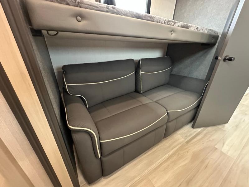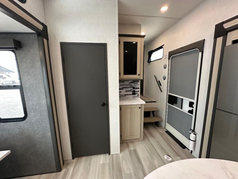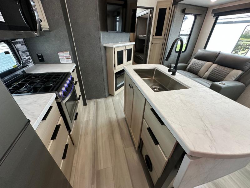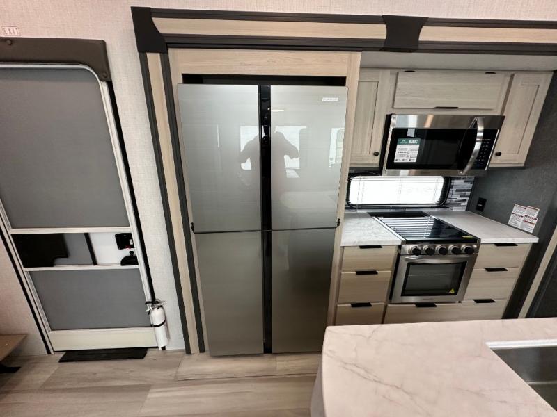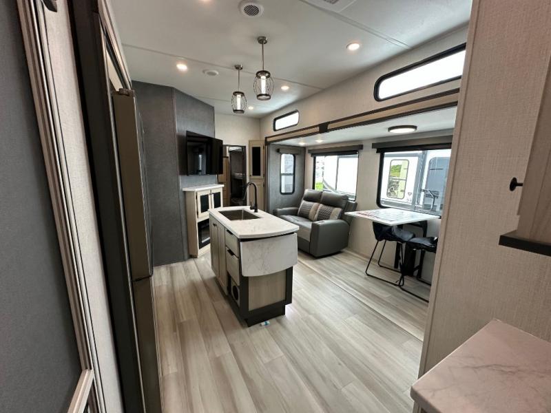 This fifth wheel's name describes it perfectly; it's the best! Your guests will love the rear private bunkhouse with dual opposing slides, bunk beds, plus a hide-a-bed sofa and an entertainment center with dual wardrobes. There is even a half bath with its own exterior entry door! You will have the front private bedroom all to yourselves with a king bed slide out and a walk-in wardrobe with washer and dryer prep. And the full bath is close by for easy nighttime use. The combined middle kitchen and living room will be a space everyone can meet in since there is a hi-top table and chairs and theater seating, an entertainment center with a fireplace, plus a kitchen island where snacks can be set out.