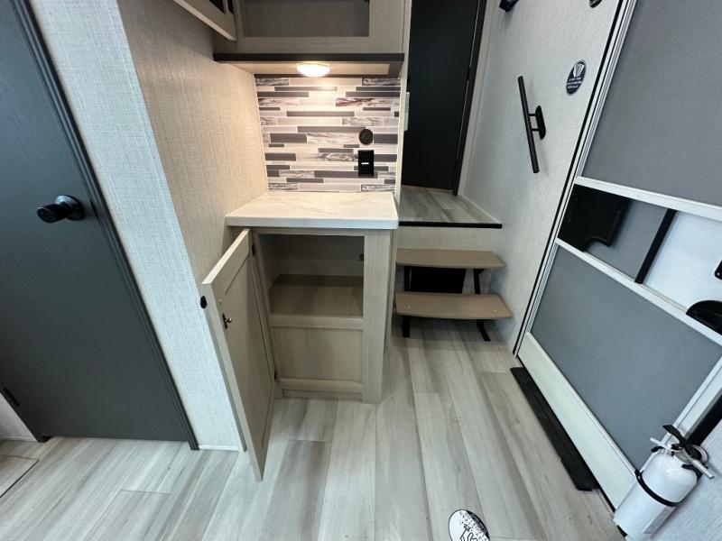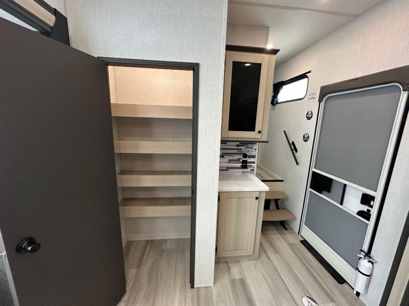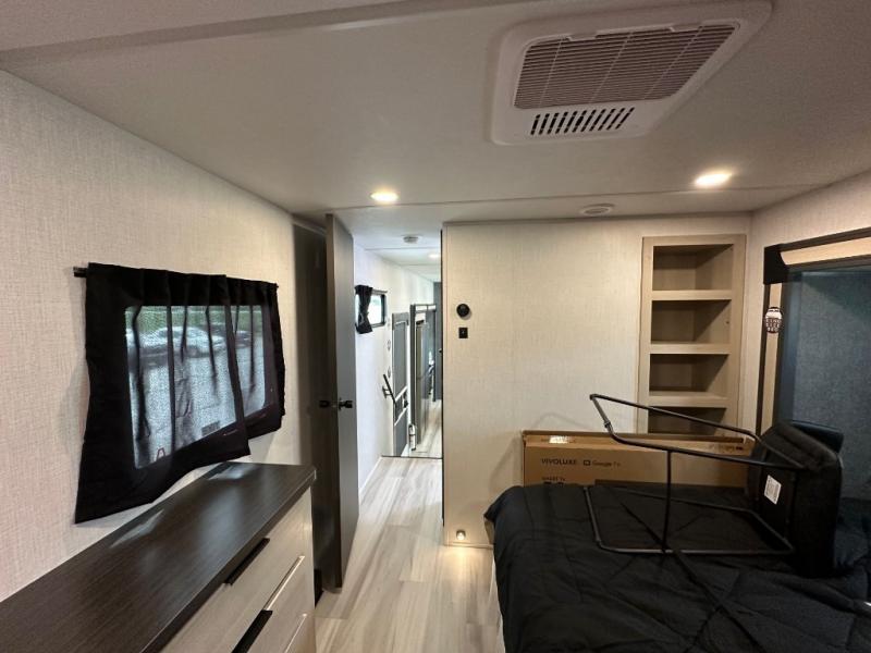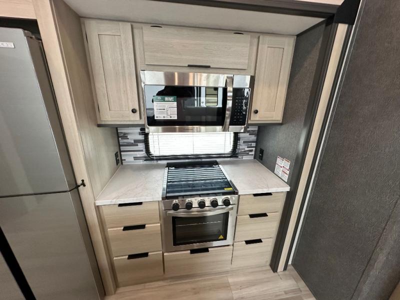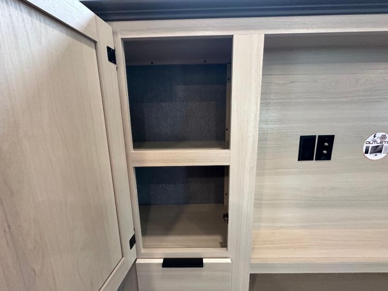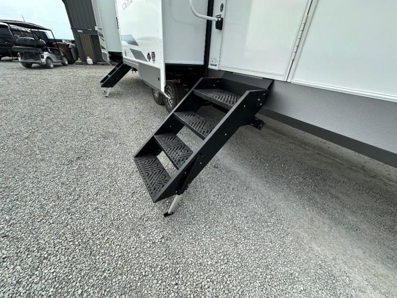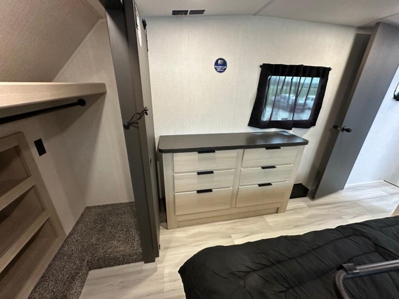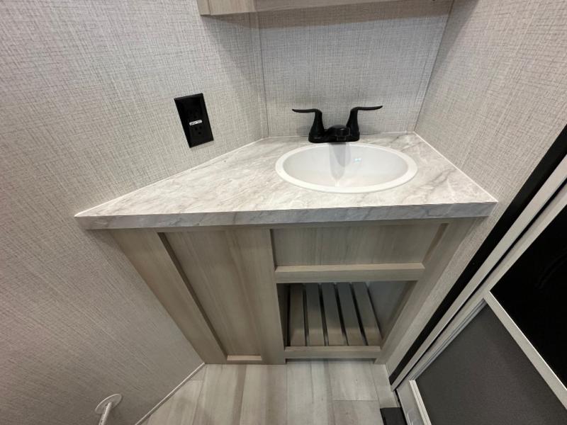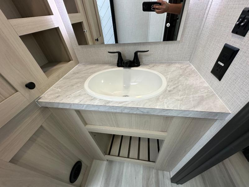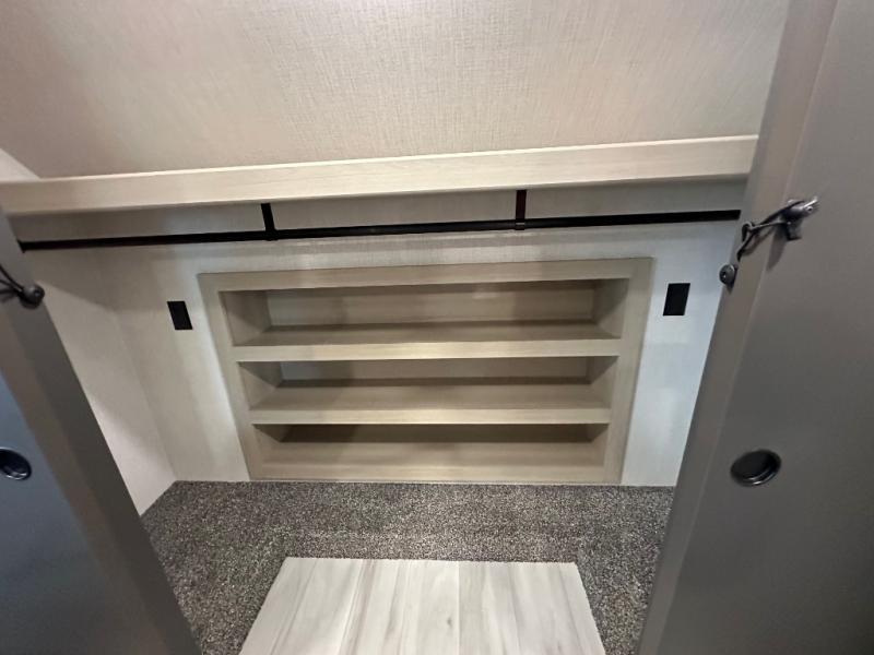 This fifth wheel's name describes it perfectly; it's the best! Your guests will love the rear private bunkhouse with dual opposing slides, bunk beds, plus a hide-a-bed sofa and an entertainment center with dual wardrobes. There is even a half bath with its own exterior entry door! You will have the front private bedroom all to yourselves with a king bed slide out and a walk-in wardrobe with washer and dryer prep. And the full bath is close by for easy nighttime use. The combined middle kitchen and living room will be a space everyone can meet in since there is a hi-top table and chairs and theater seating, an entertainment center with a fireplace, plus a kitchen island where snacks can be set out.