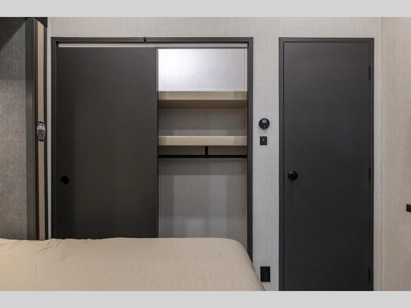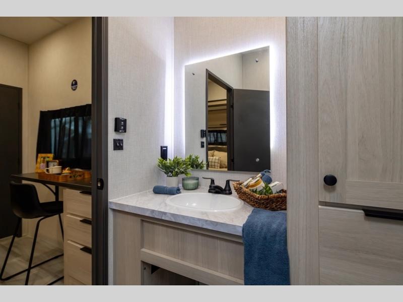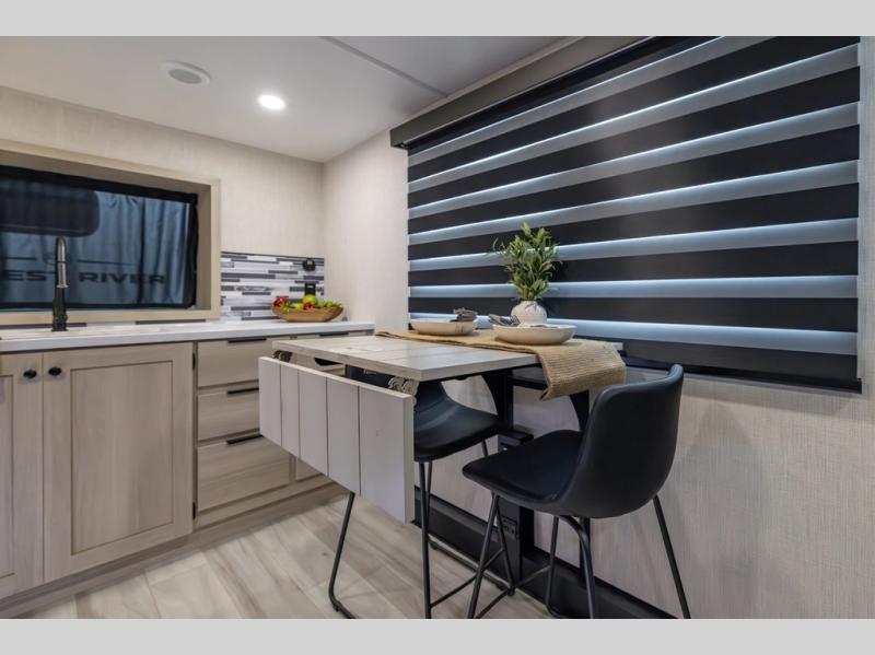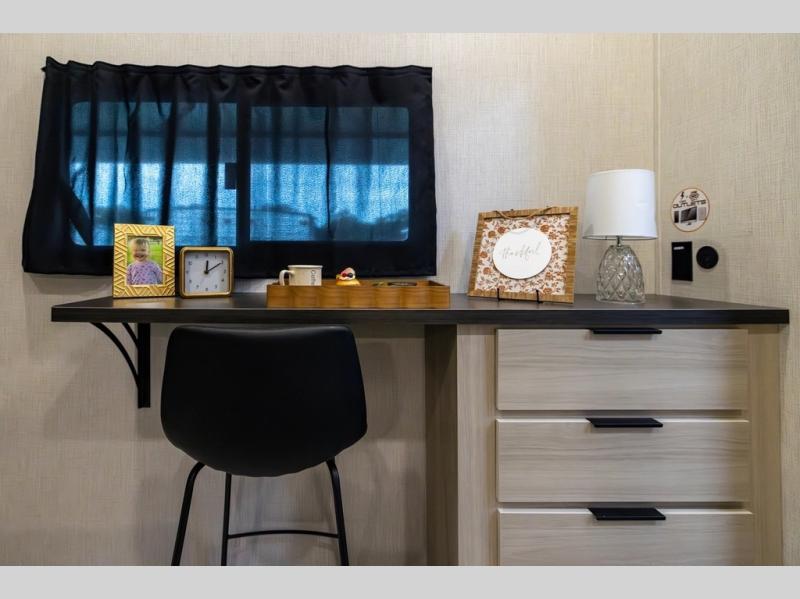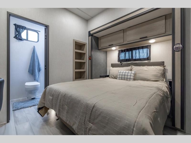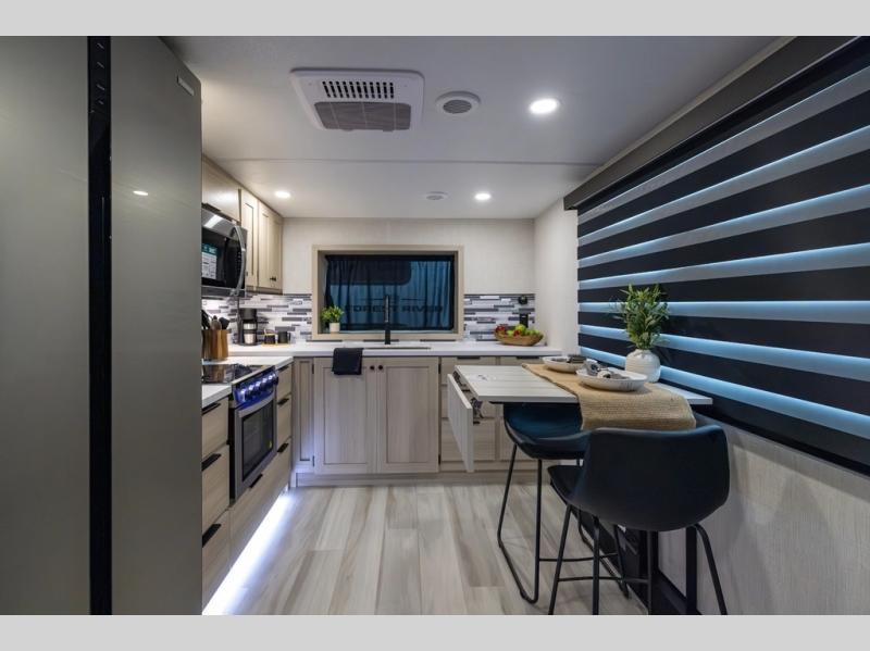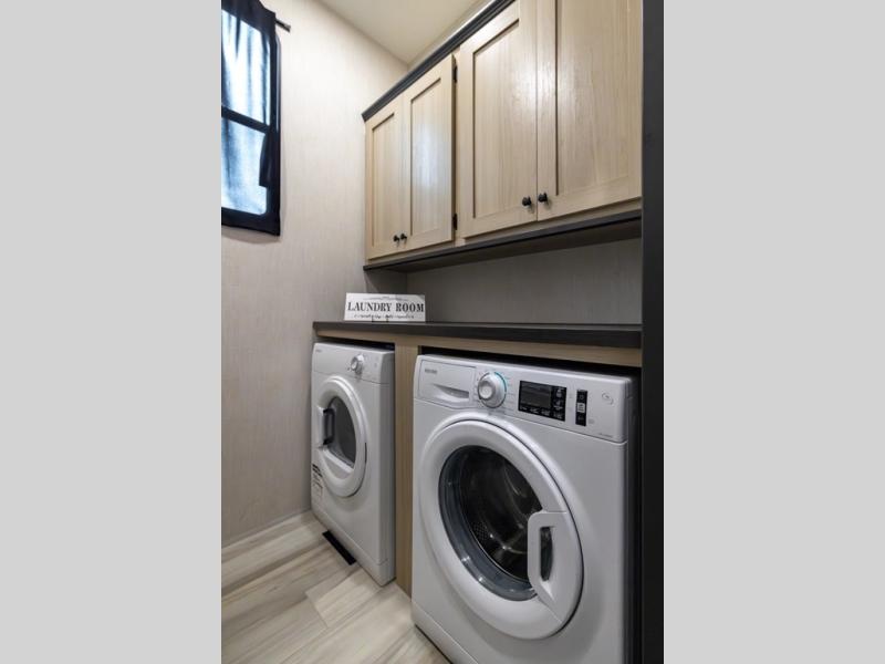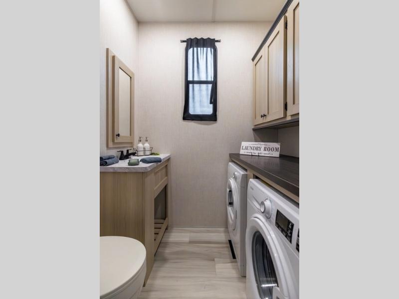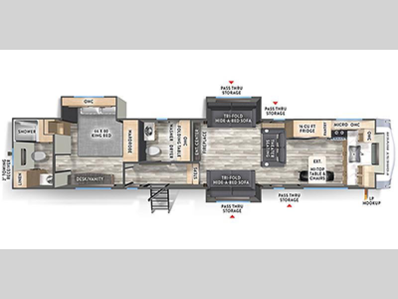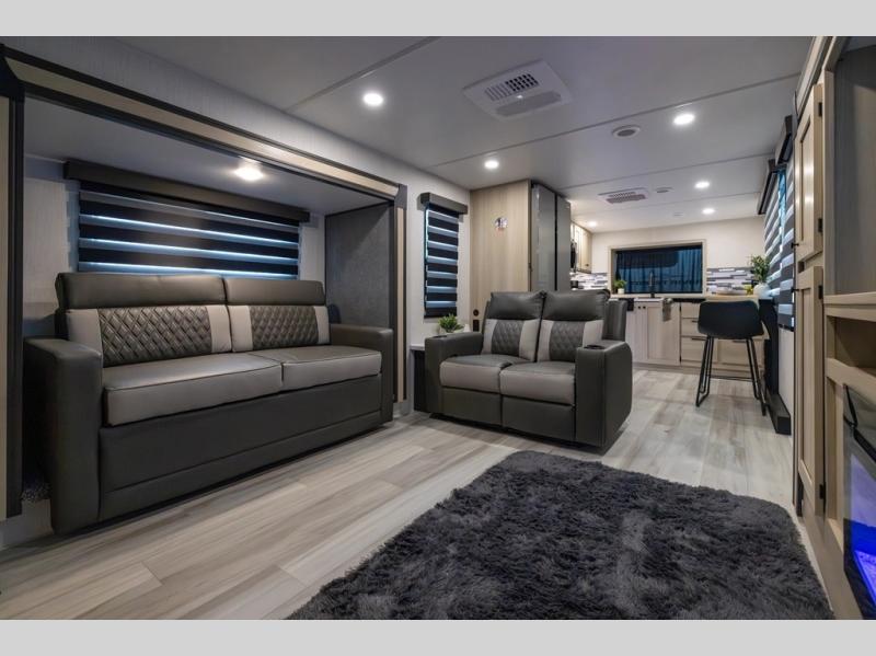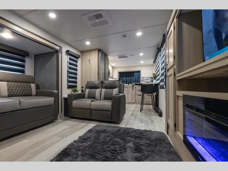 You can't go wrong with this spacious fifth wheel in tow! Once you enter the unit, you'll find the half bath that can double as a laundry room since there is washer/dryer prep here and a folding table. The full bath is in the back, creating a master bedroom you are sure to love. Here, you'll find an RV king bed slide, a large wardrobe, plus a desk/vanity. As you head towards the front, there is a middle living room with dual opposing slides that house the two tri-fold hide-a-bed sofas, plus there is theater seating across from the entertainment center with a fireplace to make it cozier. Last, but not least, the front kitchen is any chef's dream with its generous counter space, 16 cu. ft 12V refrigerator and pantry, plus a hi-top table and chairs with an extension for dining space!
