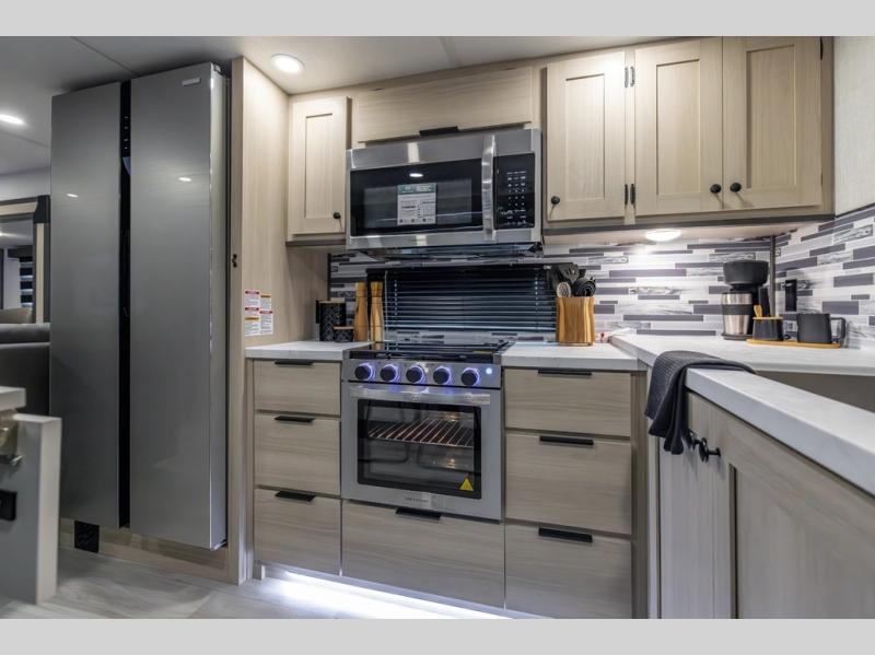 With any Cardinal fifth wheel by Forest River, you will enjoy affordable luxury at every turn. These models are constructed with residential fiberglass insulation in the roof and floor, a heated and enclosed underbelly armor, and a vacuum bonded, welded aluminum structure for added strength and durability. You will also find seamless roto-cast holding tanks, an outdoor shower, and 4-point auto leveling for quick and easy setup. There are carpet-free living spaces, residential backsplash, motion lighting throughout, and many more comforts!