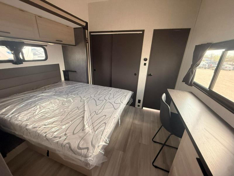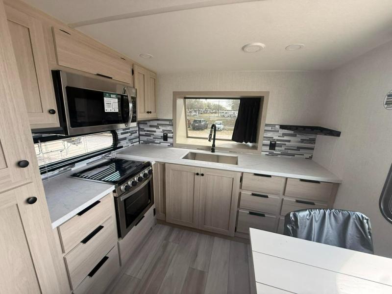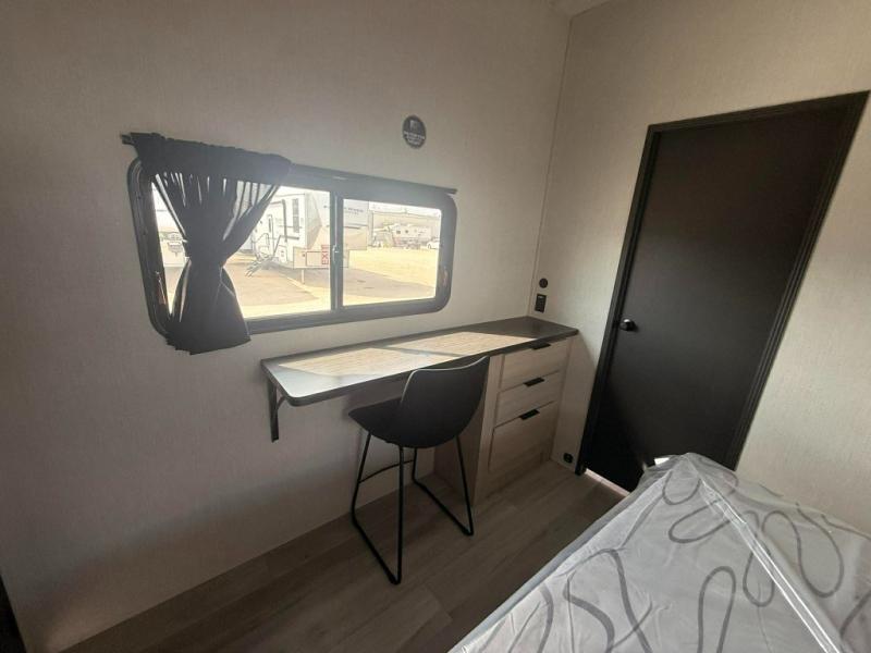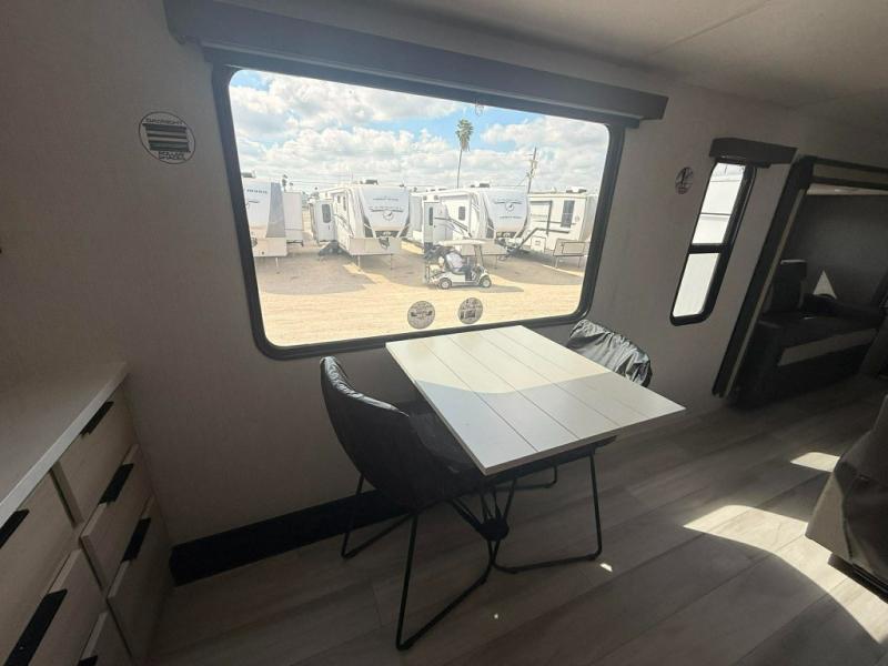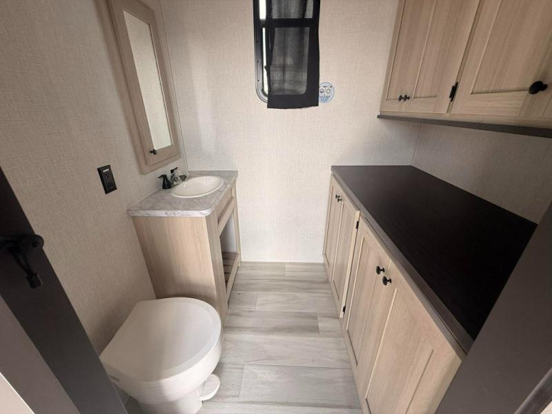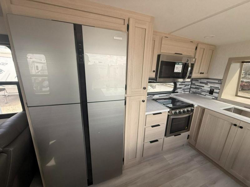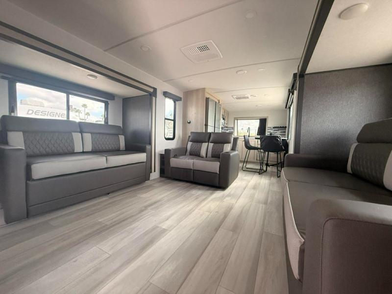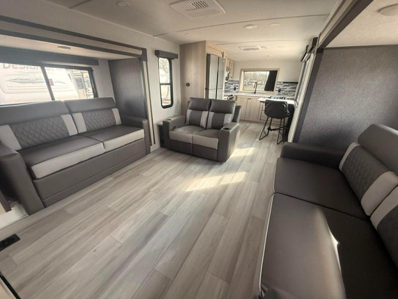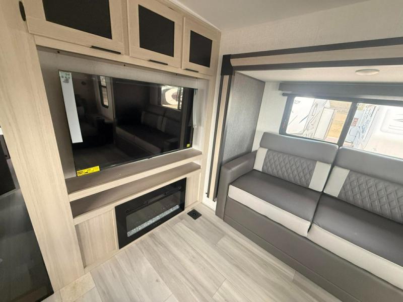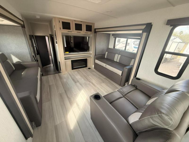 You can't go wrong with this spacious fifth wheel in tow! Once you enter the unit, you'll find the half bath that can double as a laundry room since there is washer/dryer prep here and a folding table. The full bath is in the back, creating a master bedroom you are sure to love. Here, you'll find an RV king bed slide, a large wardrobe, plus a desk/vanity. As you head towards the front, there is a middle living room with dual opposing slides that house the two tri-fold hide-a-bed sofas, plus there is theater seating across from the entertainment center with a fireplace to make it cozier. Last, but not least, the front kitchen is any chef's dream with its generous counter space, 16 cu. ft 12V refrigerator and pantry, plus a hi-top table and chairs with an extension for dining space!