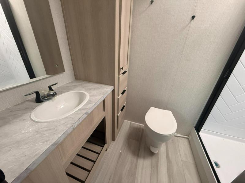 With any Cardinal fifth wheel by Forest River, you will enjoy affordable luxury at every turn. These models are constructed with residential fiberglass insulation in the roof and floor, a heated and enclosed underbelly armor, and a vacuum bonded, welded aluminum structure for added strength and durability. You will also find seamless roto-cast holding tanks, an outdoor shower, and 4-point auto leveling for quick and easy setup. There are carpet-free living spaces, residential backsplash, motion lighting throughout, and many more comforts!
