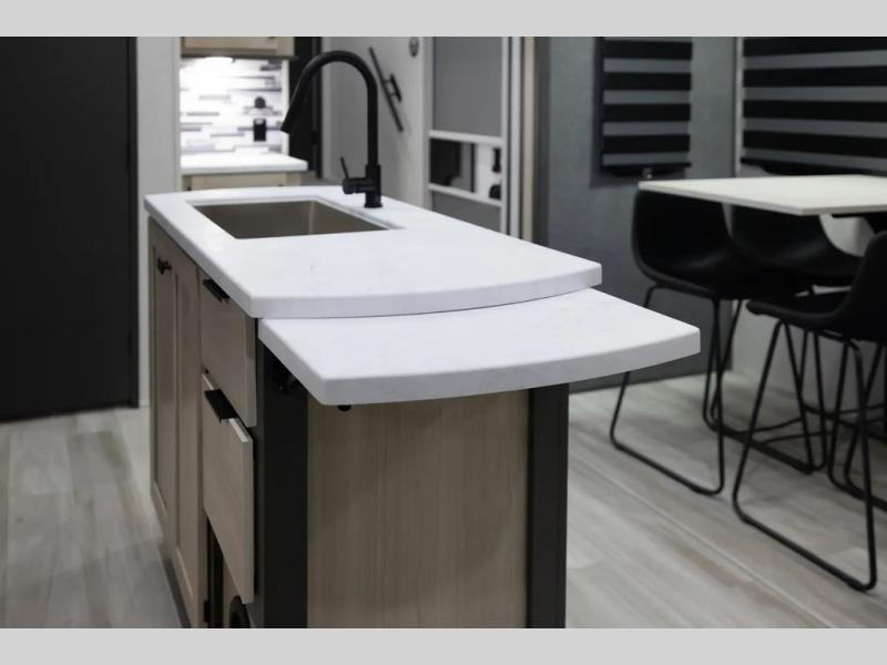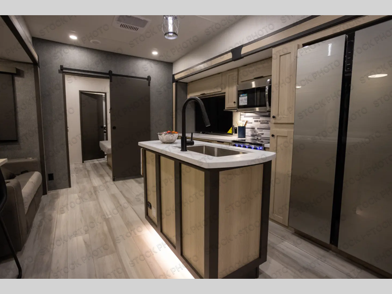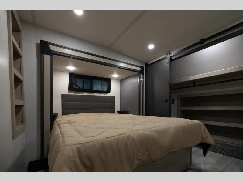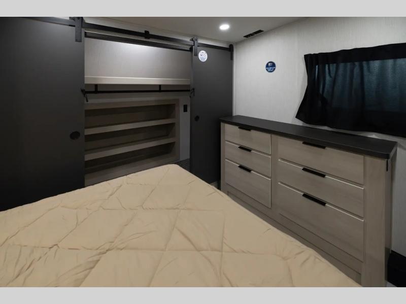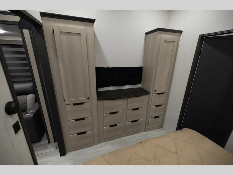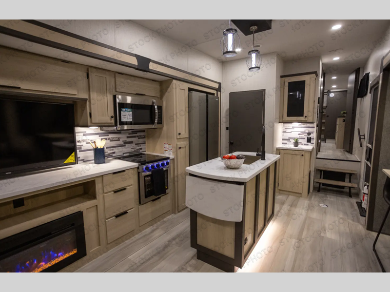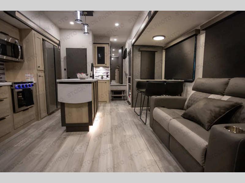 With two full baths, two bedrooms, and two entry doors, this fifth wheel is packed with comfort! The front bedroom includes a queen bed slide out, dresser, and front walk-in wardrobe with washer and dryer prep. And there is a full bath close by for easy access. You'll find another queen bed slide in the rear master bedroom, along with dual wardrobes and a dresser, plus a full rear bath with its own exterior entry door. In the morning, everyone can meet in the middle kitchen and living room while the chef prepares breakfast with the 21" 2-in-1 oven. There is a hi-top table and chairs for dining, theater seating for relaxing, and a flip-up counter at the island for even more counter space. You can set up your Keurig machine at the coffee bar, and the two pantries plus 16 cu. ft. 12V refrigerator will allow you to keep food stocked!