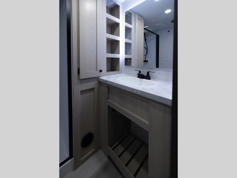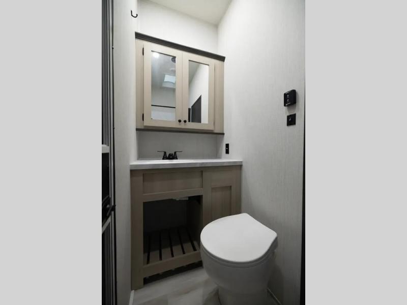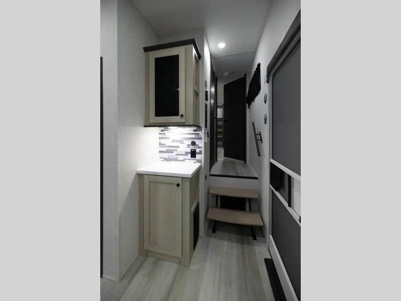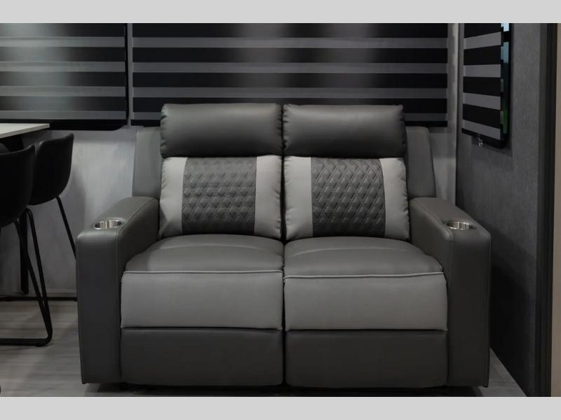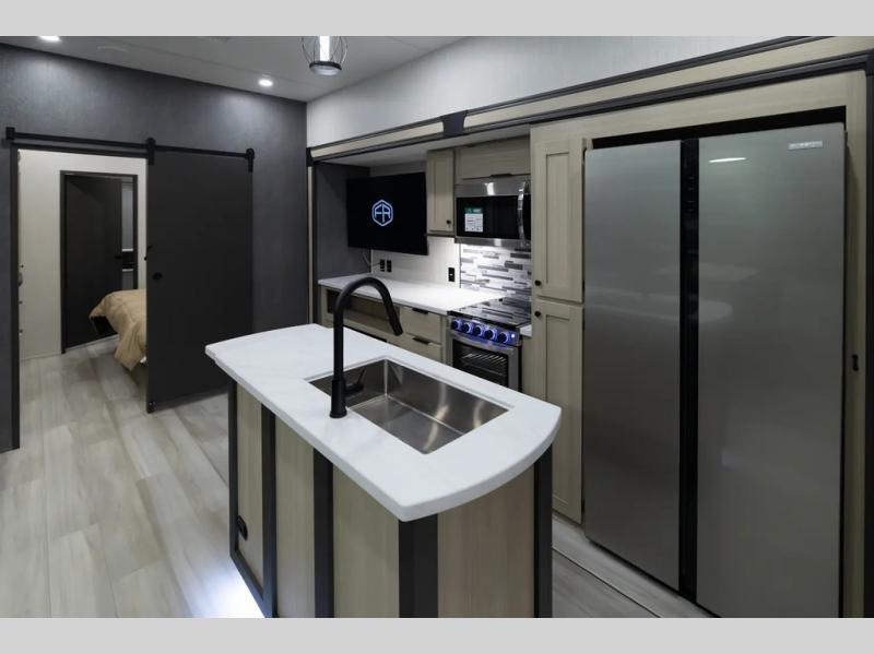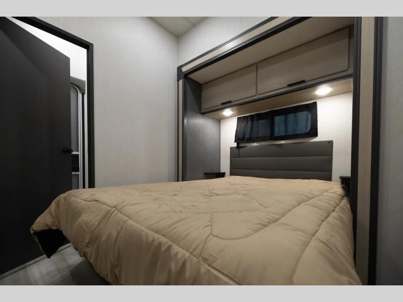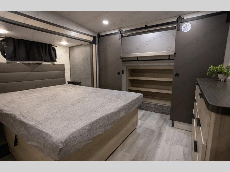 With two full baths, two bedrooms, and two entry doors, this fifth wheel is packed with comfort! The front bedroom includes a queen bed slide out, dresser, and front walk-in wardrobe with washer and dryer prep. And there is a full bath close by for easy access. You'll find another queen bed slide in the rear master bedroom, along with dual wardrobes and a dresser, plus a full rear bath with its own exterior entry door. In the morning, everyone can meet in the middle kitchen and living room while the chef prepares breakfast with the 21" 2-in-1 oven. There is a hi-top table and chairs for dining, theater seating for relaxing, and a flip-up counter at the island for even more counter space. You can set up your Keurig machine at the coffee bar, and the two pantries plus 16 cu. ft. 12V refrigerator will allow you to keep food stocked!