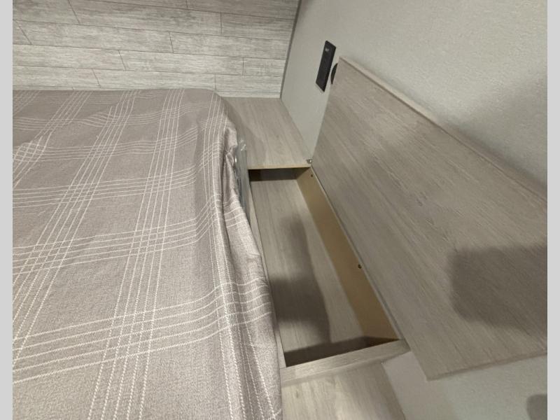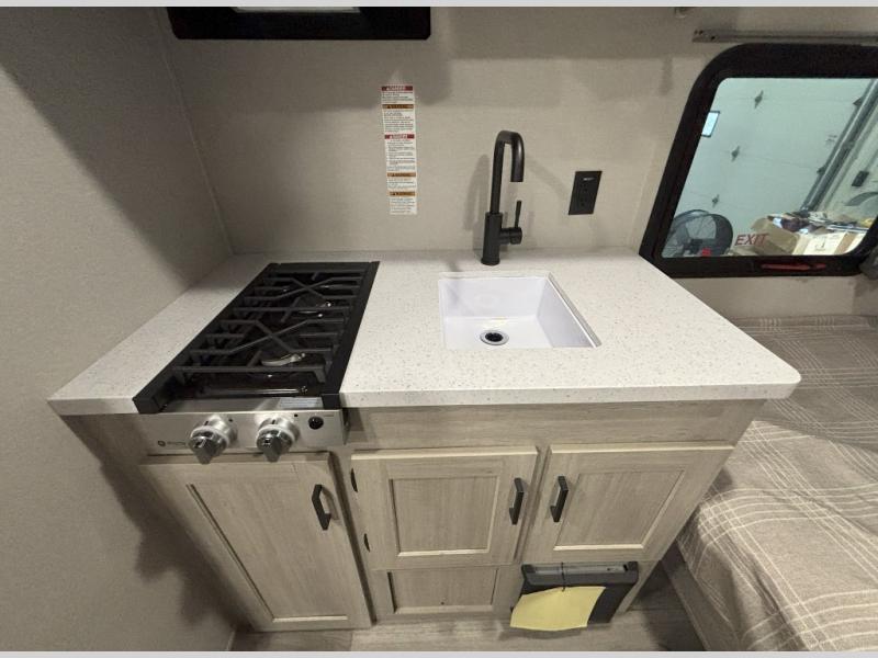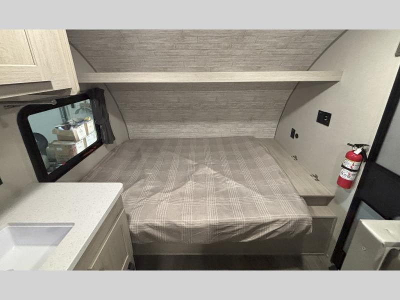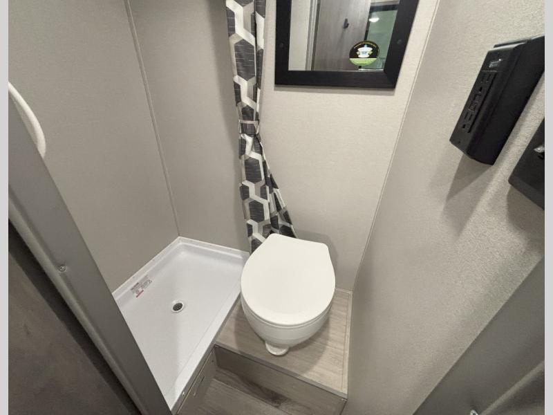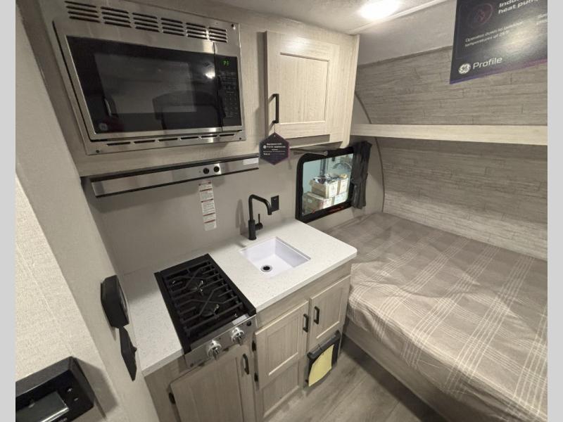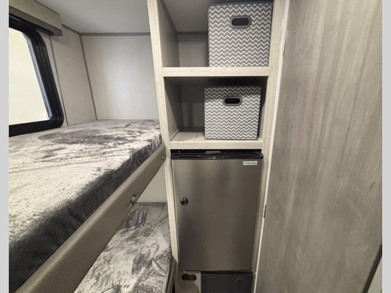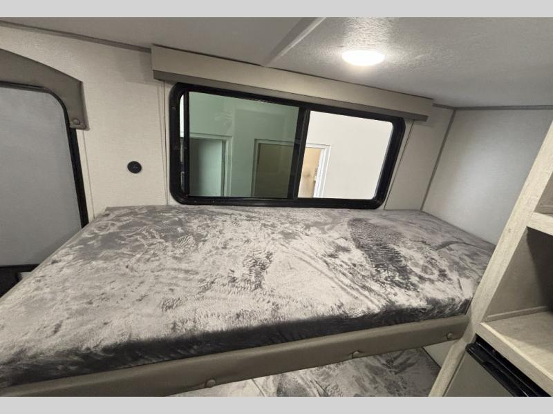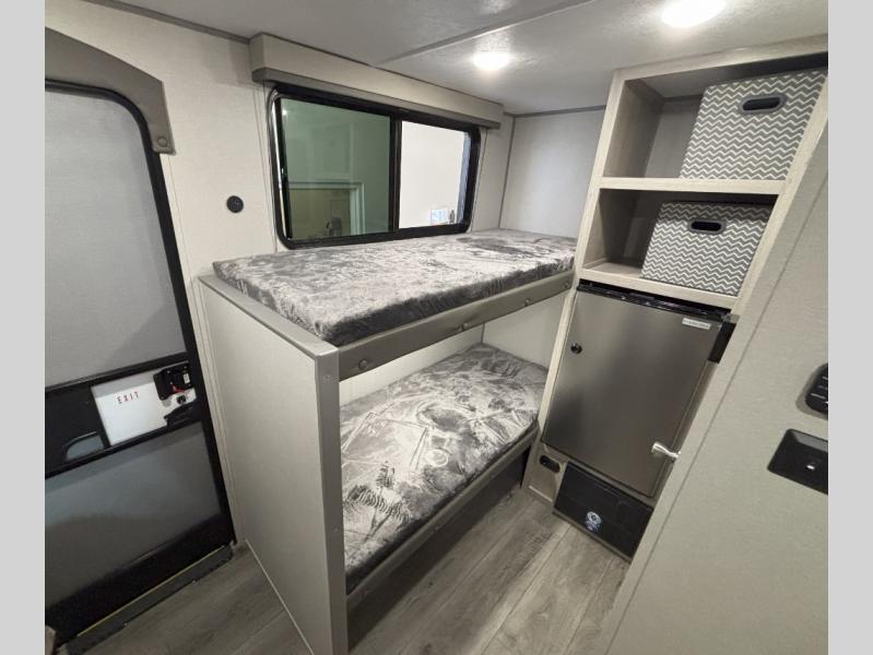 Lightweight camping is easier than you think with this travel trailer in tow! The front 54" x 74" queen bed will provide a great night's rest each night, while the little ones or your guests take the bunk beds. There is a handy shelf above the front bed for your belongings plus additional bedroom storage. A private bath includes a 24" x 32" shower and a toilet with a mirror behind it so you can freshen up each day. You'll also find a two burner cooktop and microwave oven to make meals each day plus a 3.3 cu. ft. 12V refrigerator for food storage!