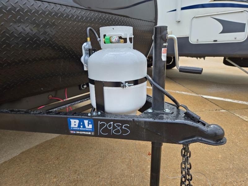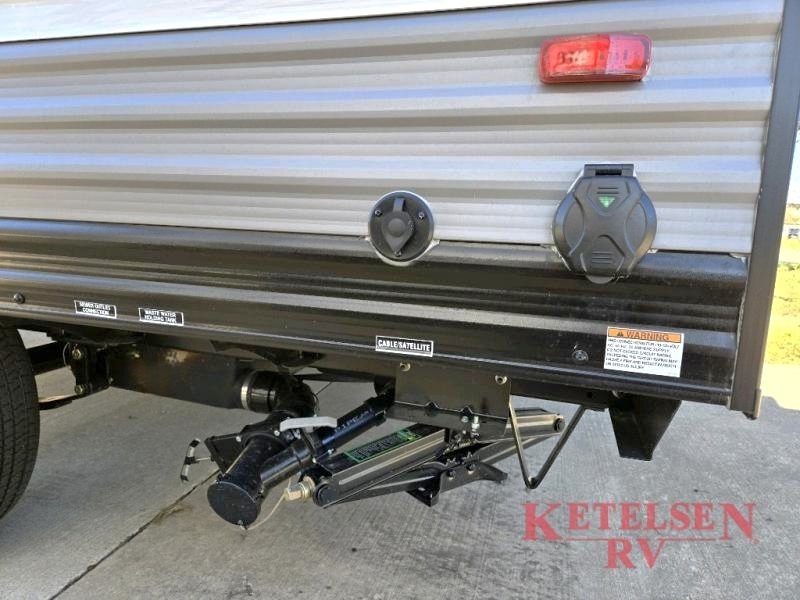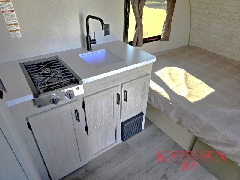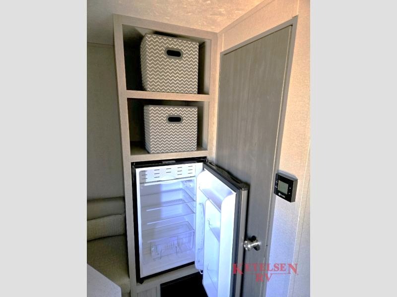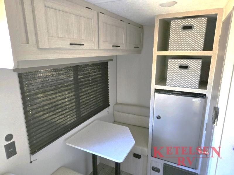 Lightweight camping is easier than you think with this travel trailer in tow! The front 54" x 74" queen bed will provide a great night's rest each night, while your overnight guest takes the booth dinette. There is a handy shelf above the front bed for your belongings plus additional bedroom storage. A private bath includes a 24" x 32" shower and a toilet with a mirror behind it so you can freshen up each day. You'll also find a two burner cooktop and microwave oven to make meals each day plus a 3.3 cu. ft. 12V refrigerator for food storage!