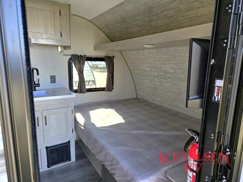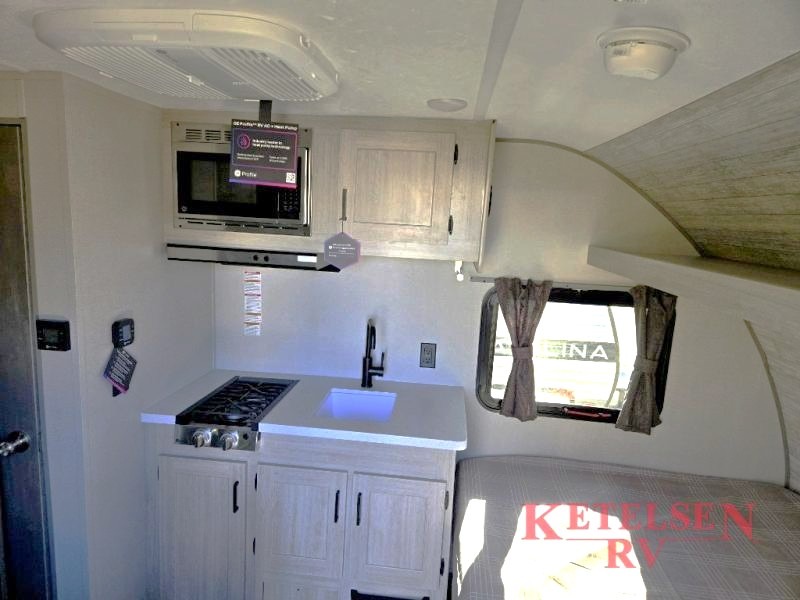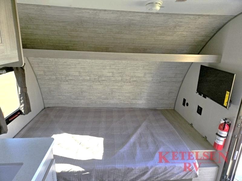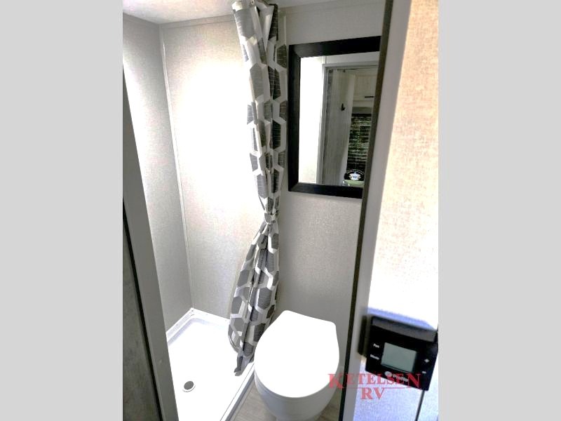 Lightweight camping is easier than you think with this travel trailer in tow! The front 54" x 74" queen bed will provide a great night's rest each night, while your overnight guest takes the booth dinette. There is a handy shelf above the front bed for your belongings plus additional bedroom storage. A private bath includes a 24" x 32" shower and a toilet with a mirror behind it so you can freshen up each day. You'll also find a two burner cooktop and microwave oven to make meals each day plus a 3.3 cu. ft. 12V refrigerator for food storage!