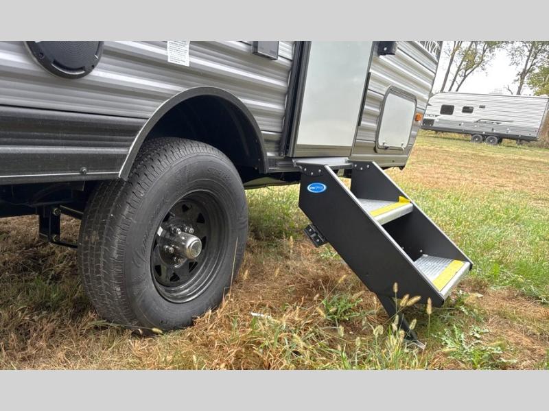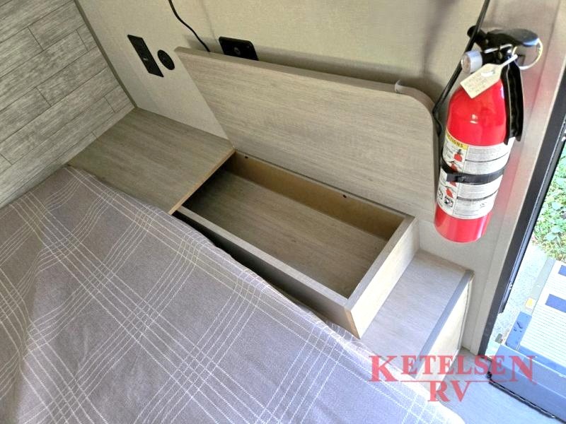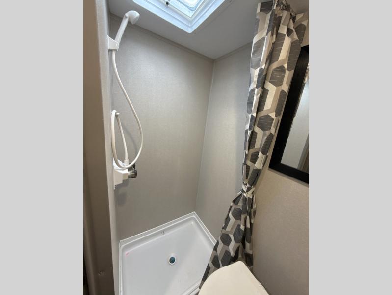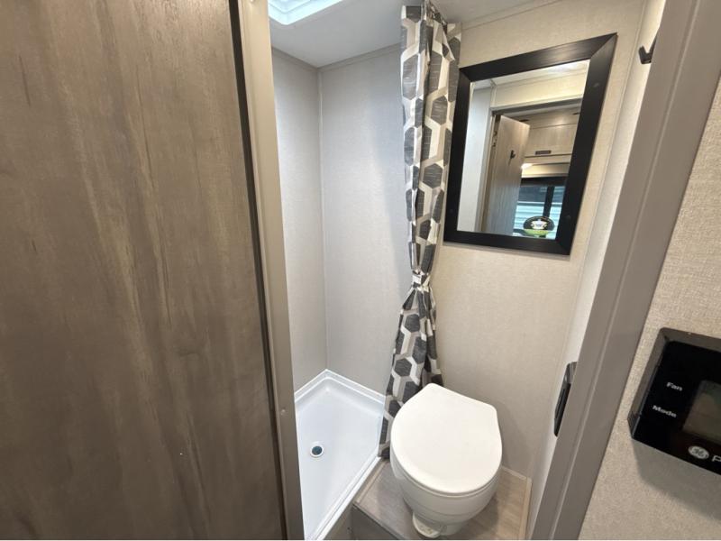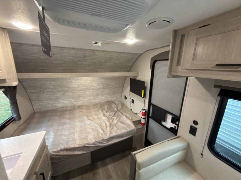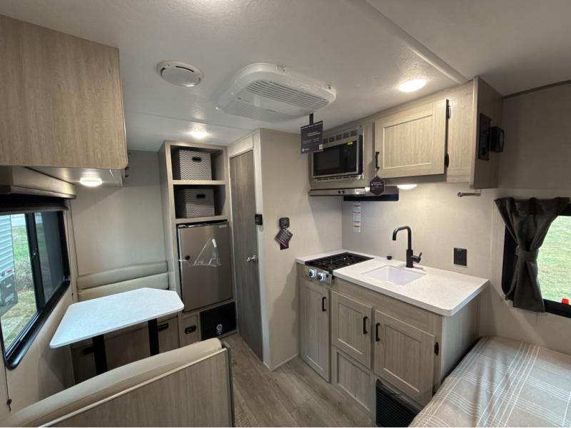Lightweight camping is easier than you think with this travel trailer in tow! The front 54" x 74" queen bed will provide a great night's rest each night, while your overnight guest takes the booth dinette. There is a handy shelf above the front bed for your belongings plus additional bedroom storage. A private bath includes a 24" x 32" shower and a toilet with a mirror behind it so you can freshen up each day. You'll also find a two burner cooktop and microwave oven to make meals each day plus a 3.3 cu. ft. 12V refrigerator for food storage!