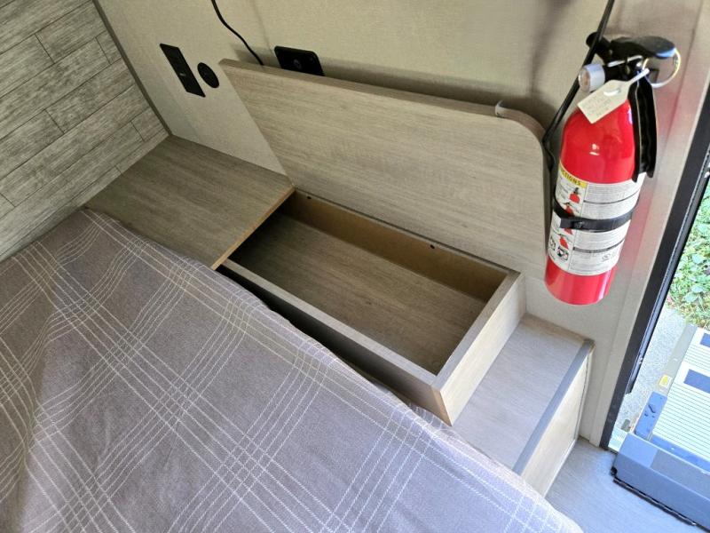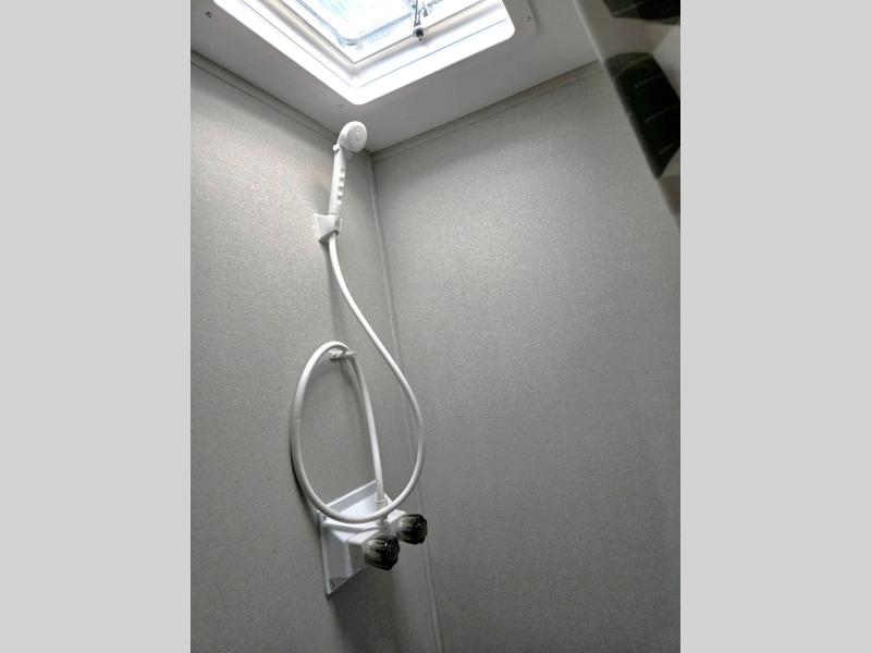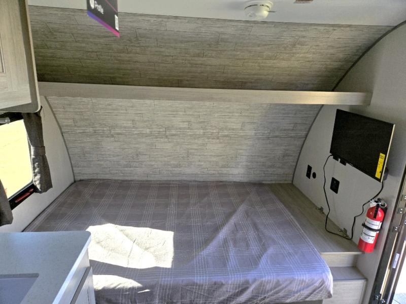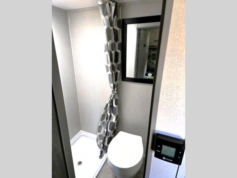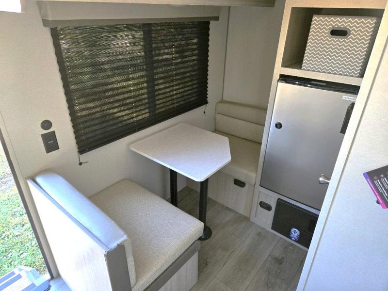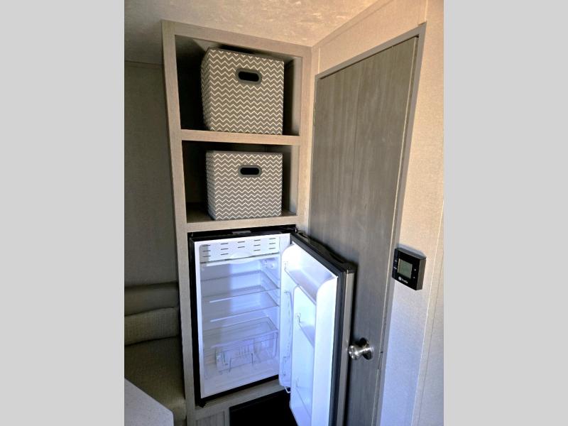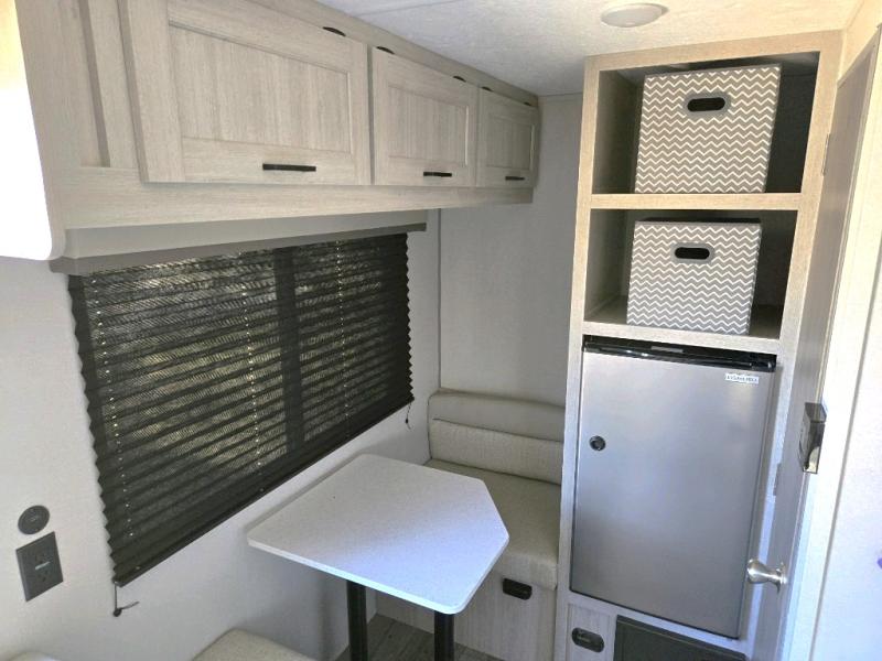 Lightweight camping is easier than you think with this travel trailer in tow! The front 54" x 74" queen bed will provide a great night's rest each night, while your overnight guest takes the booth dinette. There is a handy shelf above the front bed for your belongings plus additional bedroom storage. A private bath includes a 24" x 32" shower and a toilet with a mirror behind it so you can freshen up each day. You'll also find a two burner cooktop and microwave oven to make meals each day plus a 3.3 cu. ft. 12V refrigerator for food storage!