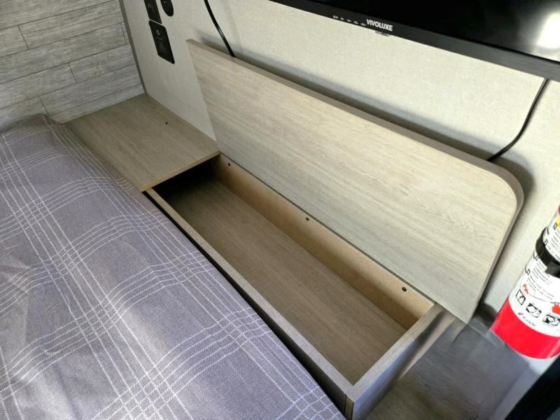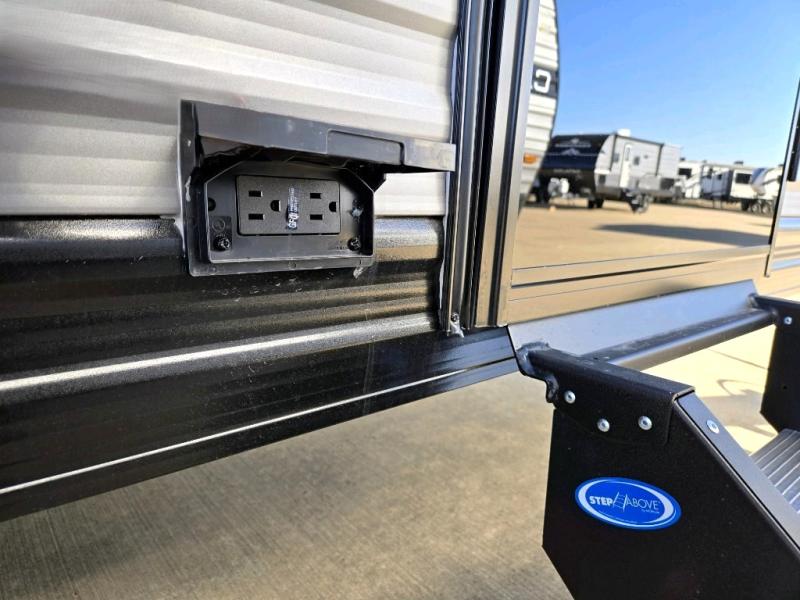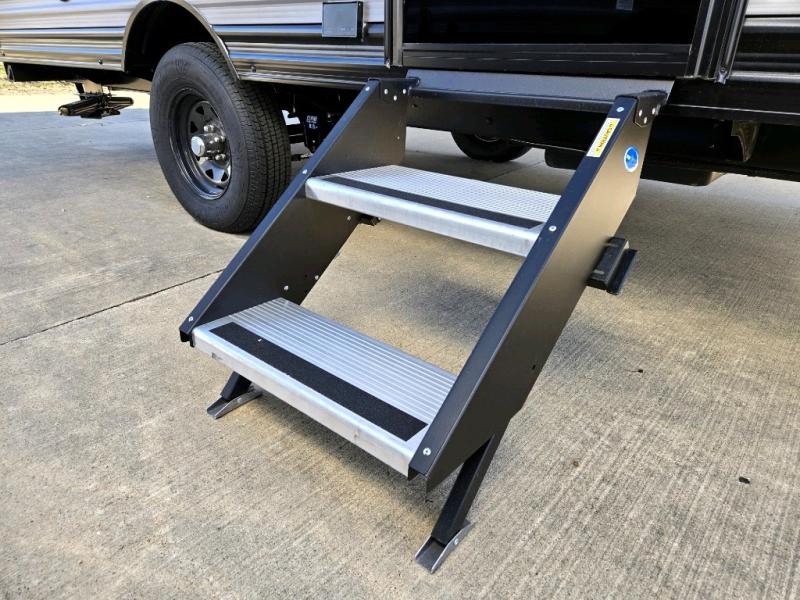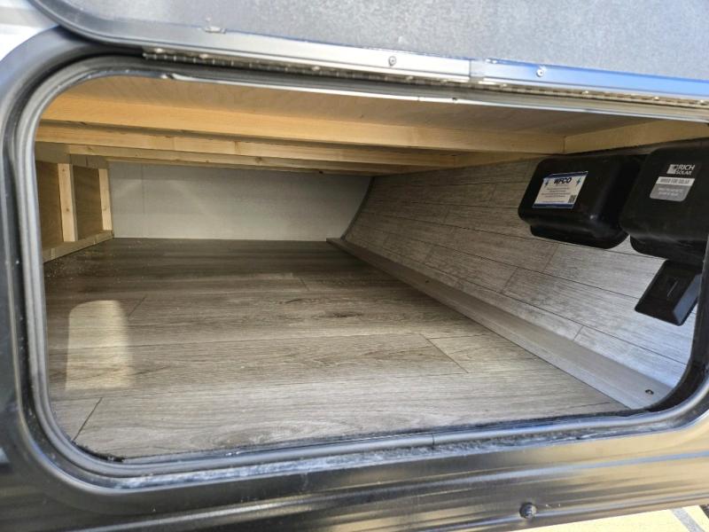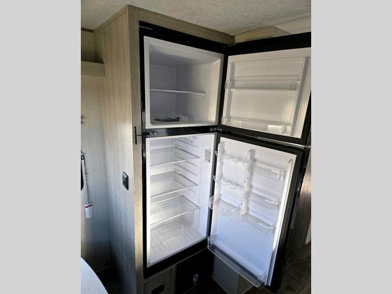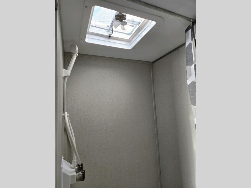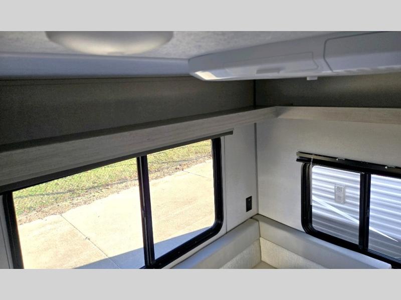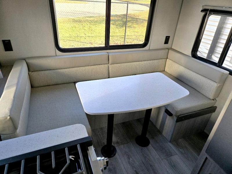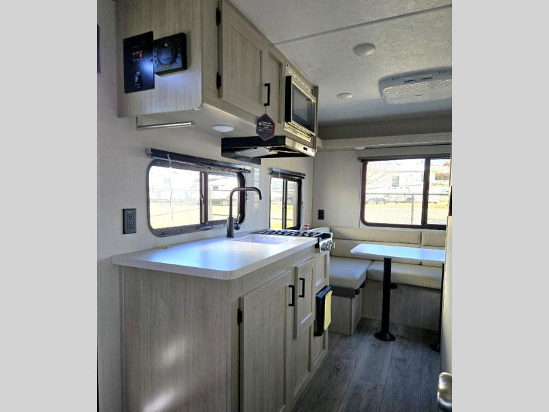 The perfect unit for a cozy weekend retreat for two or three! There is a queen bed up front with overhead storage and more at the foot of the bed to keep your things tidy. The rear of the unit offers a U-shaped dinette with an end table on one end and a handy overhead shelf which is a great spot for meals, watching TV or playing cards and games. A mid-coach bath includes a 36" x 30" shower and toilet with foot flush, plus a storage shelf for necessities. This model also includes a GE two burner cooktop, a GE stainless microwave oven, plus a 3.3 cu. ft. 12V refrigerator to keep food fresh!
