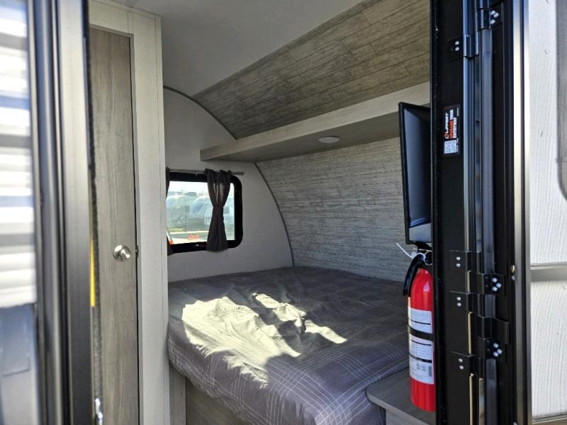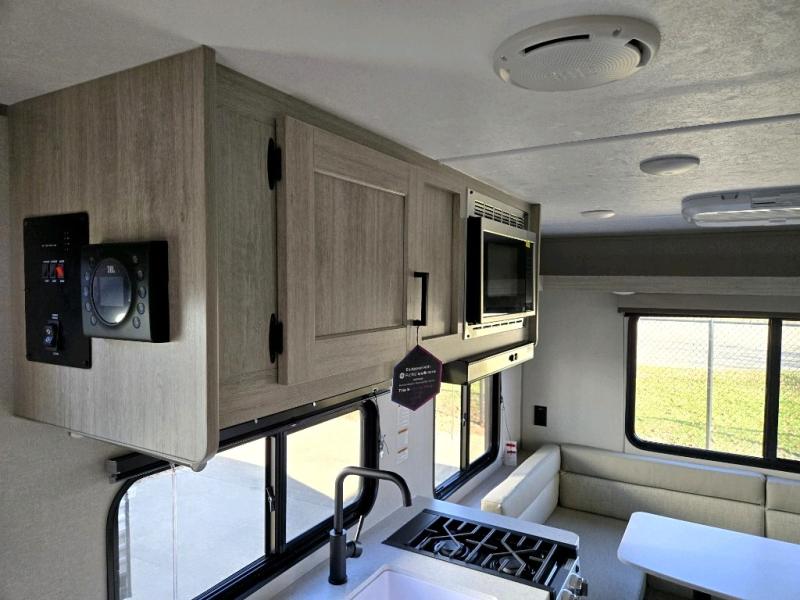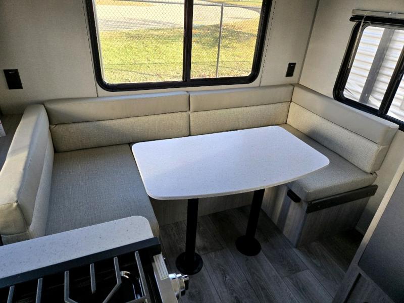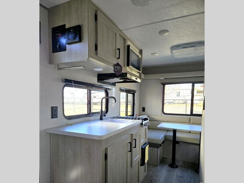 The perfect unit for a cozy weekend retreat for two or three! There is a queen bed up front with overhead storage and more at the foot of the bed to keep your things tidy. The rear of the unit offers a U-shaped dinette that is great for watching TV or playing cards and games, plus it has an end table and a handy overhead shelf. A mid-coach bath includes a 36" x 30" shower and toilet with foot flush, and a mirror. This model also includes a GE two burner cooktop, a GE stainless microwave oven, plus a 3.3 cu. ft. 12V refrigerator to keep food fresh!
