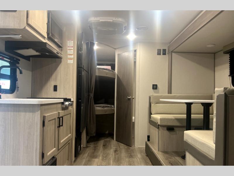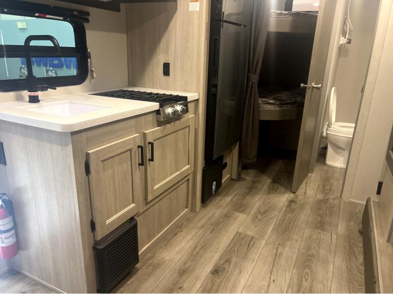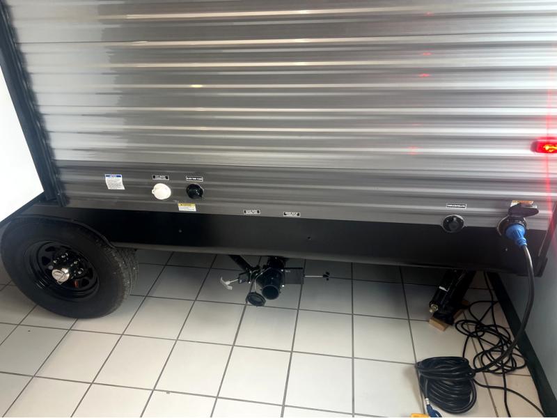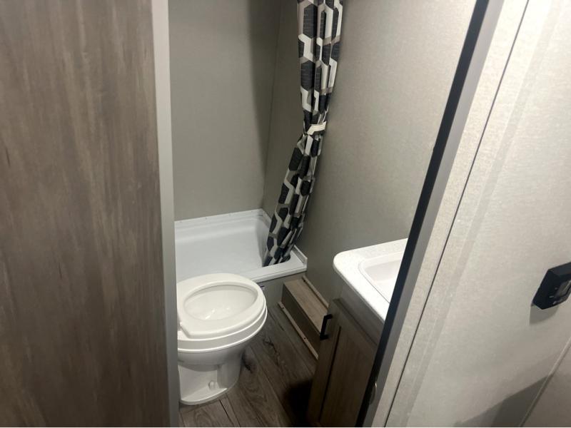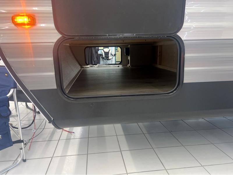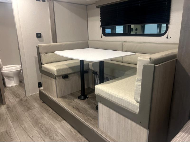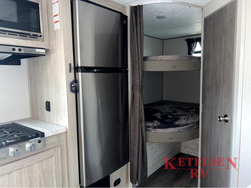 This spacious travel trailer can sleep eight campers each night thanks to the double-size bunks in the back, the U-shaped dinette within the slide out, and the queen bed up front! You can easily make meals for your crew with the two burner cooktop and microwave oven, and leftovers can go in the 10.7 cu. ft. 12V refrigerator! After you've cleaned up in the full bath, head outdoors to relax under the 15' power awning with multicolor LED lights and a remote!