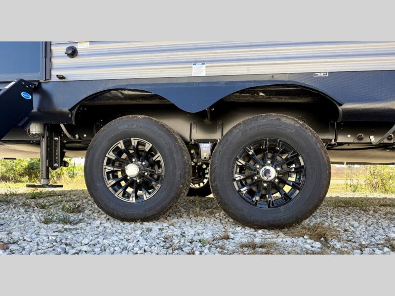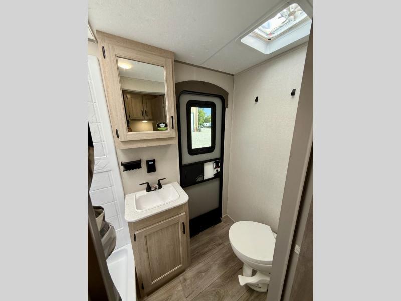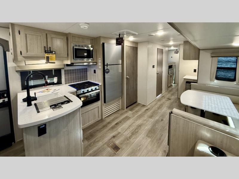 If you enjoy hiking, biking, and fishing, and waking up to beautiful scenery from your own comforts, then start camping with this trailer at the campsite! You will be able to sleep like a queen on the walk-around bed with dual wardrobes and overhead storage for more items in the front private bedroom while your family or friends have their own privacy in the bunkhouse complete with two bunks, a jack knife sofa with storage totes below and a TV/wardrobe cabinet for even more storage. The full bathroom includes the second entry/exit door for convenience when outside under the 21' electric awning with multicolor LED lights, or while cooking using the full size camper kitchen along the exterior. There are full kitchen amenities inside including a 10 cu. ft. refrigerator and a pantry.